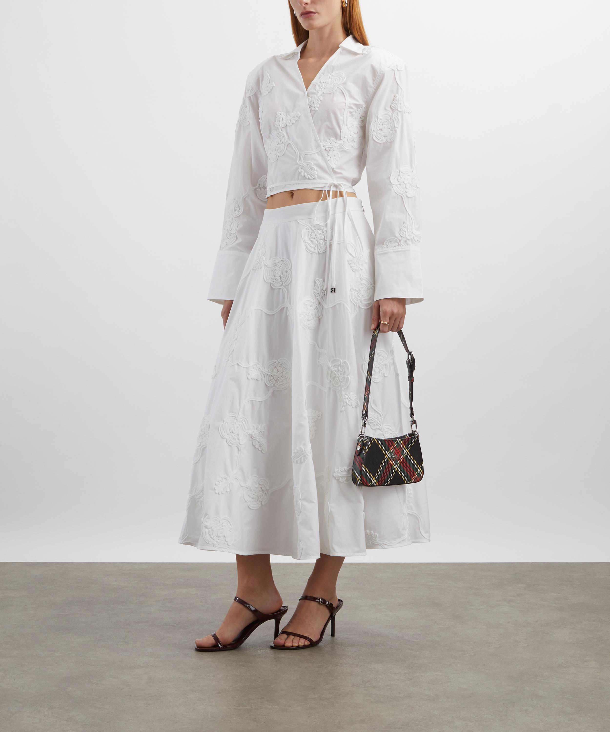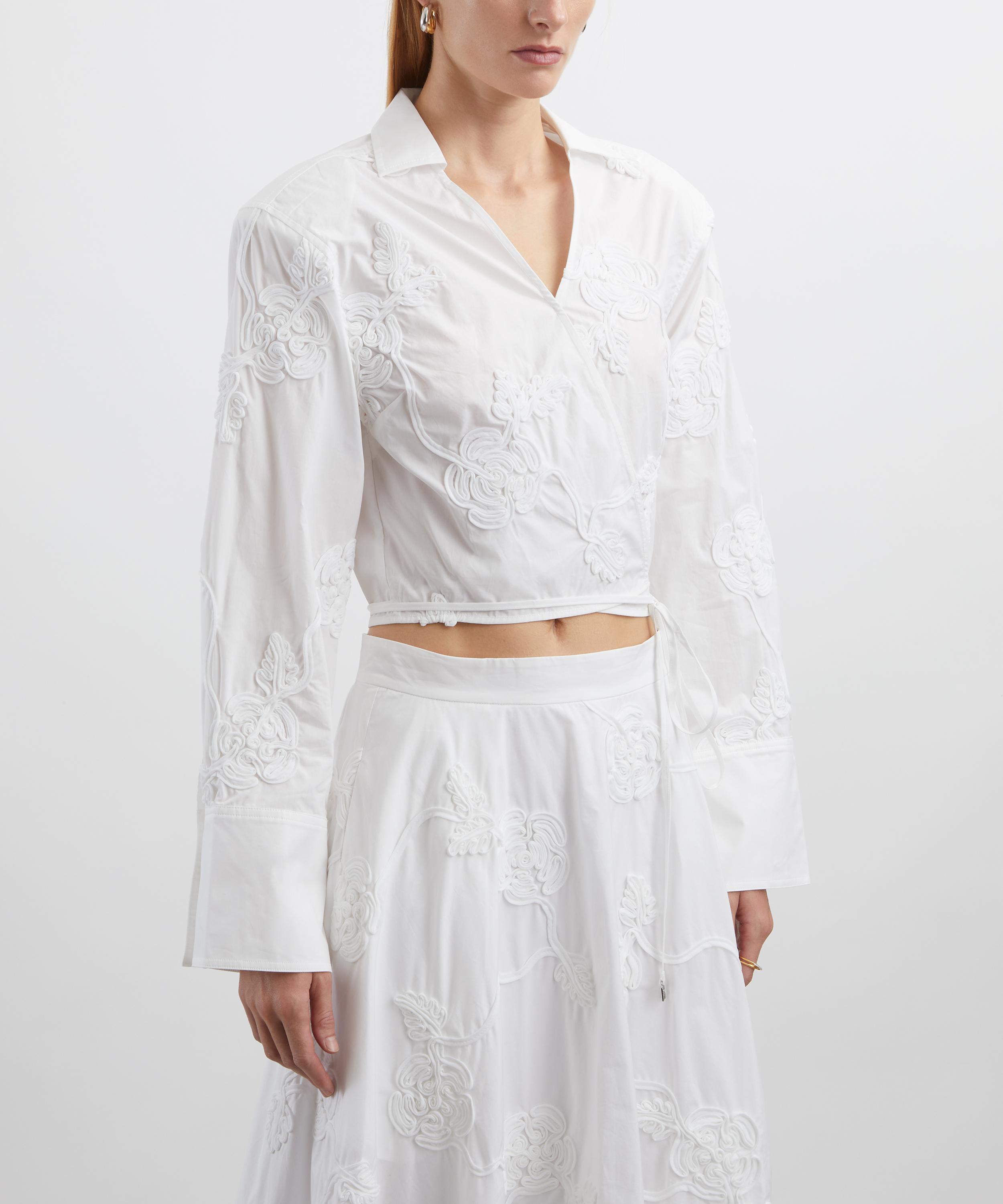 Adorned with tonal floral embroidery throughout, this cotton shirt features a cropped silhouette with a collared V-neckline, long sleeves, and a wrap-over front secured with delicate ties - offering an effortlessly elegant finish.