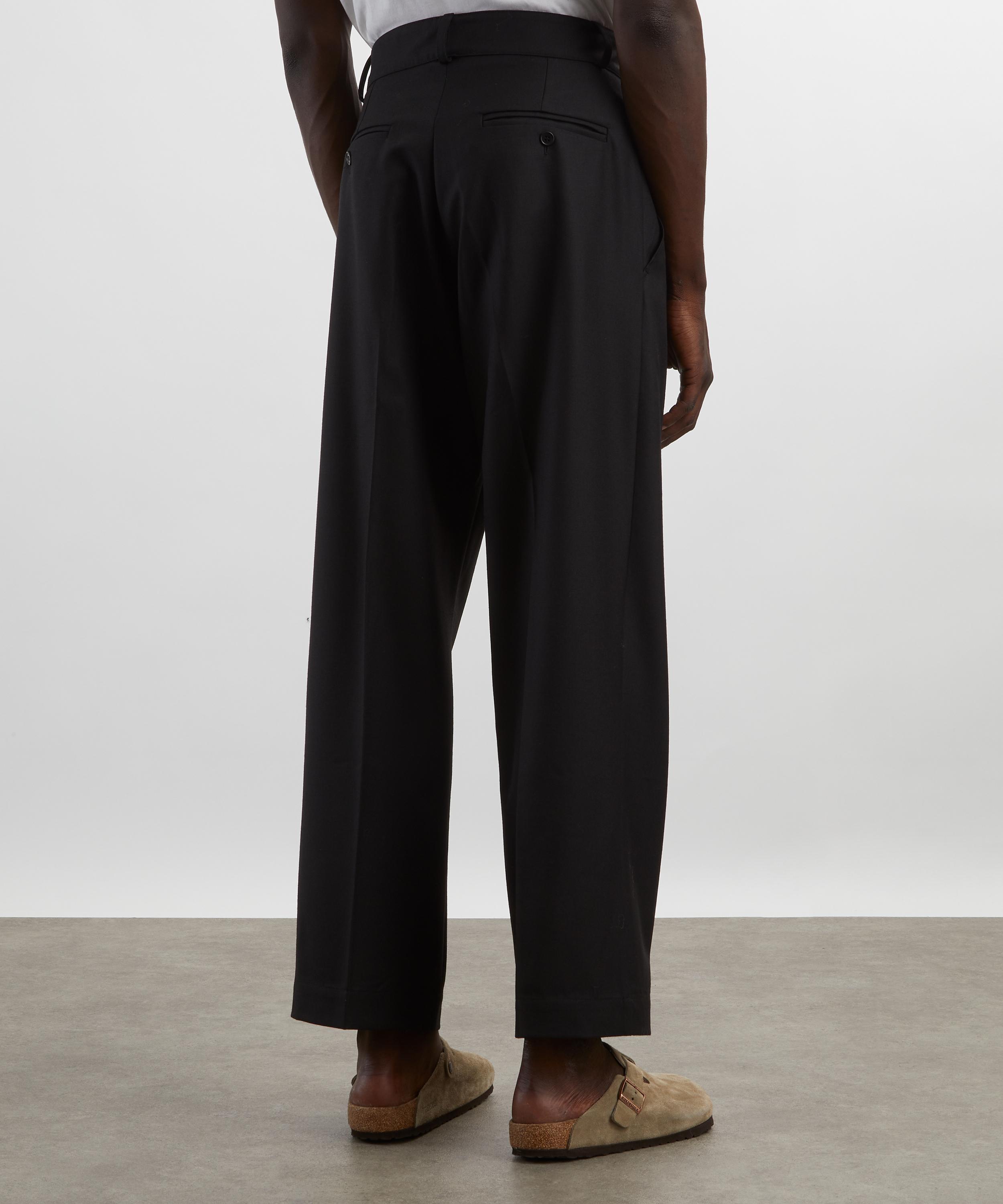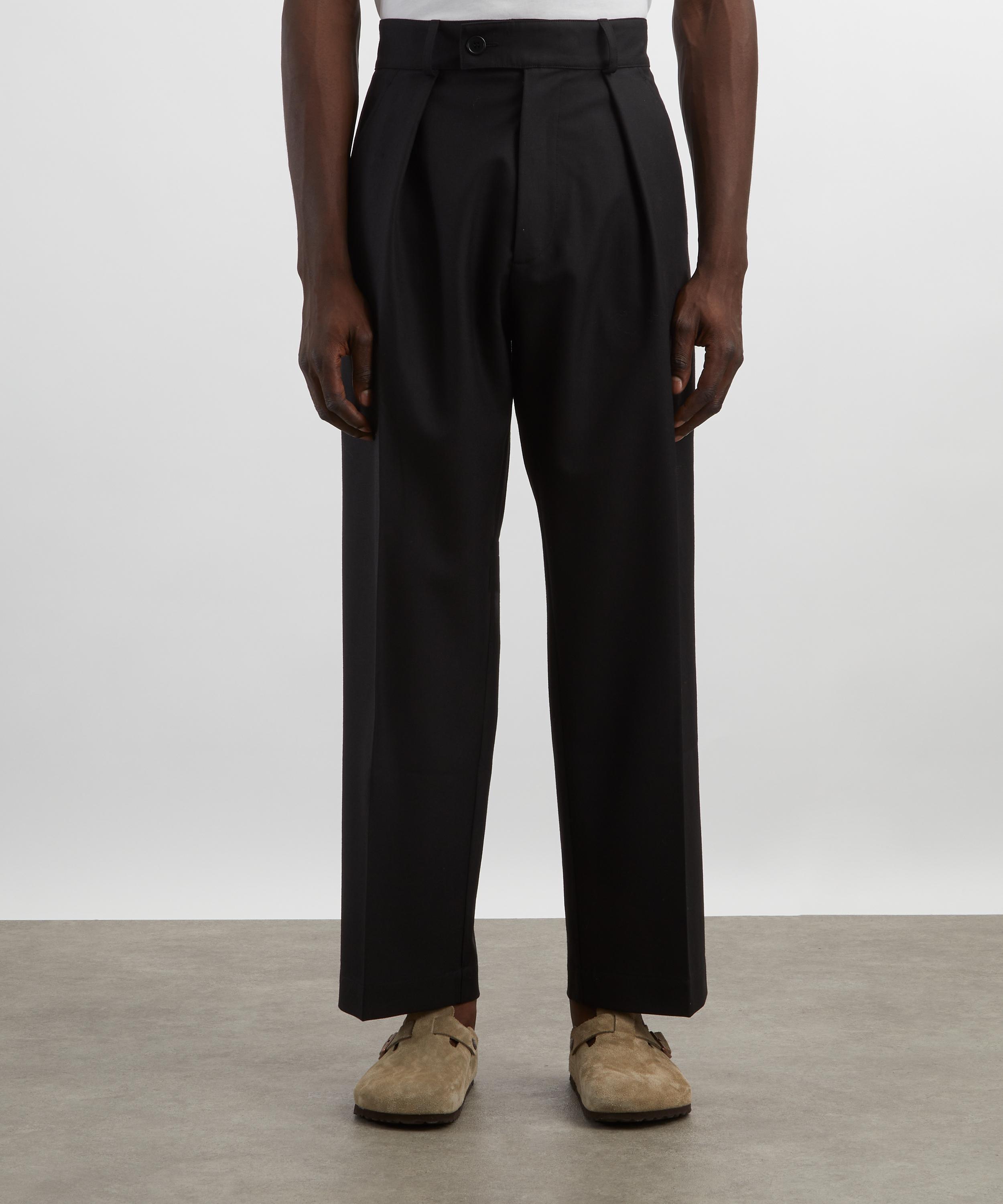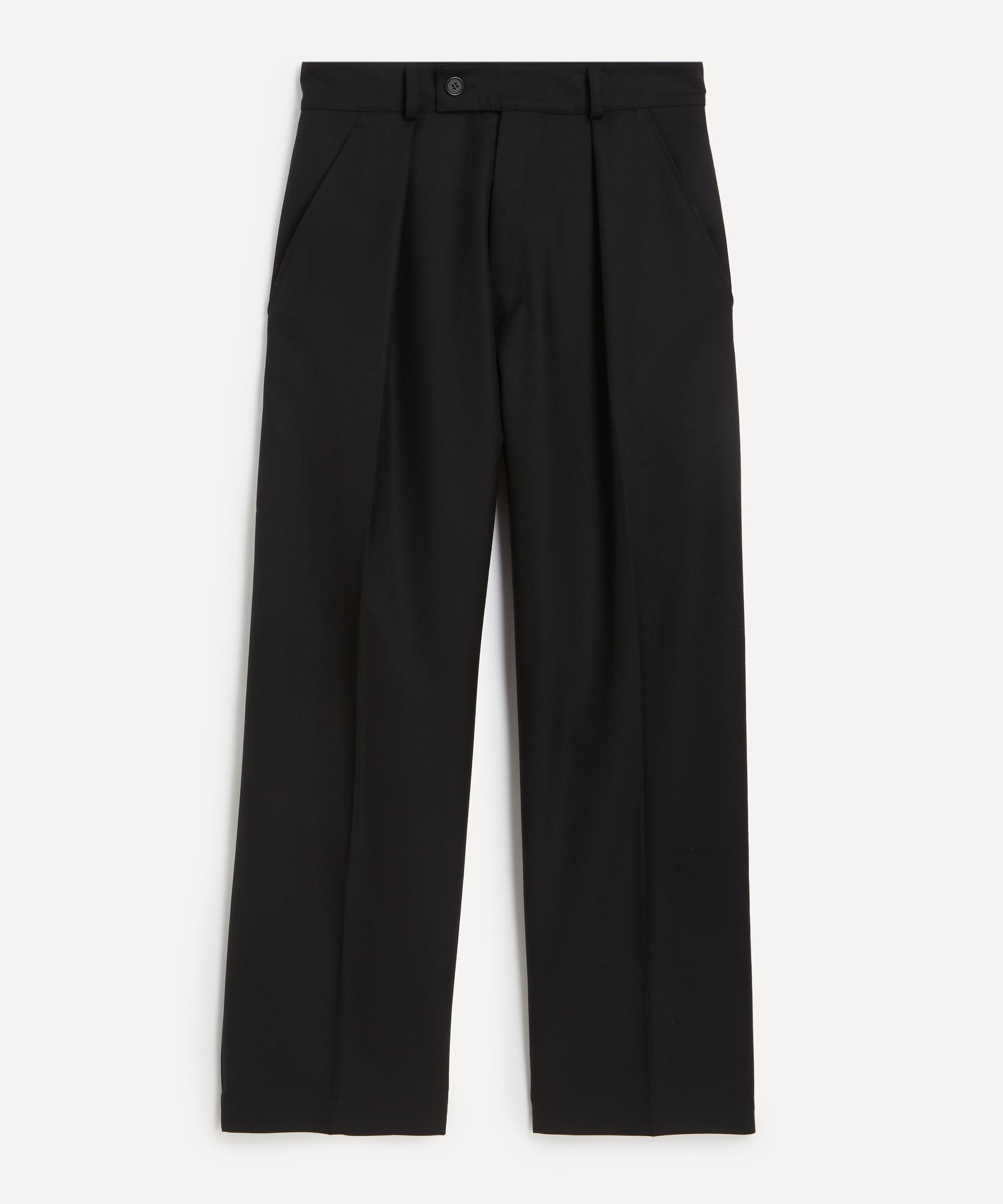 Crafted from lightweight yet warm British wool, these trousers showcase a roomy, straight-leg silhouette. They feature a button and zip fly closure, belt loops, front pleats, and side and back pockets for a classic, polished finish.