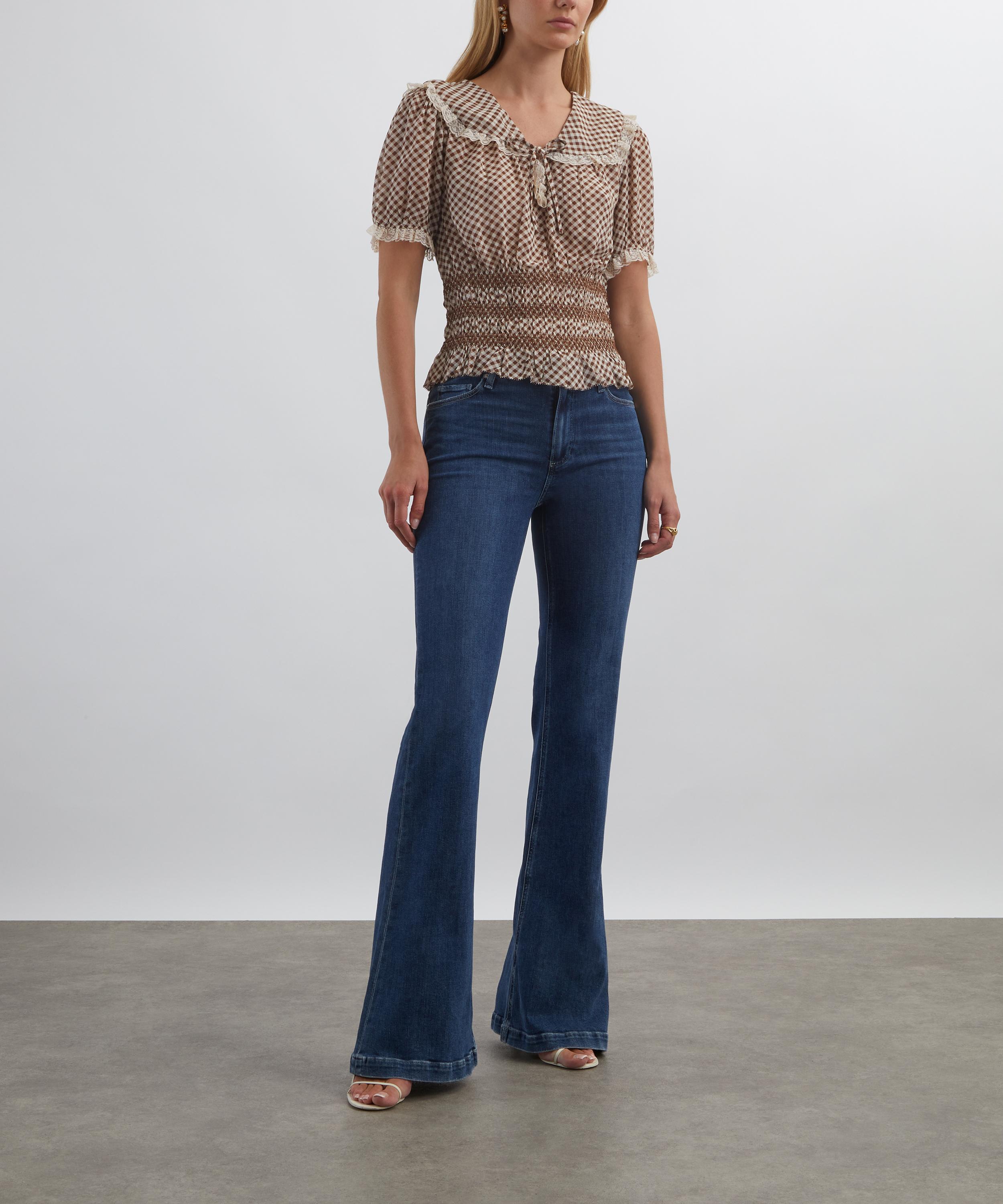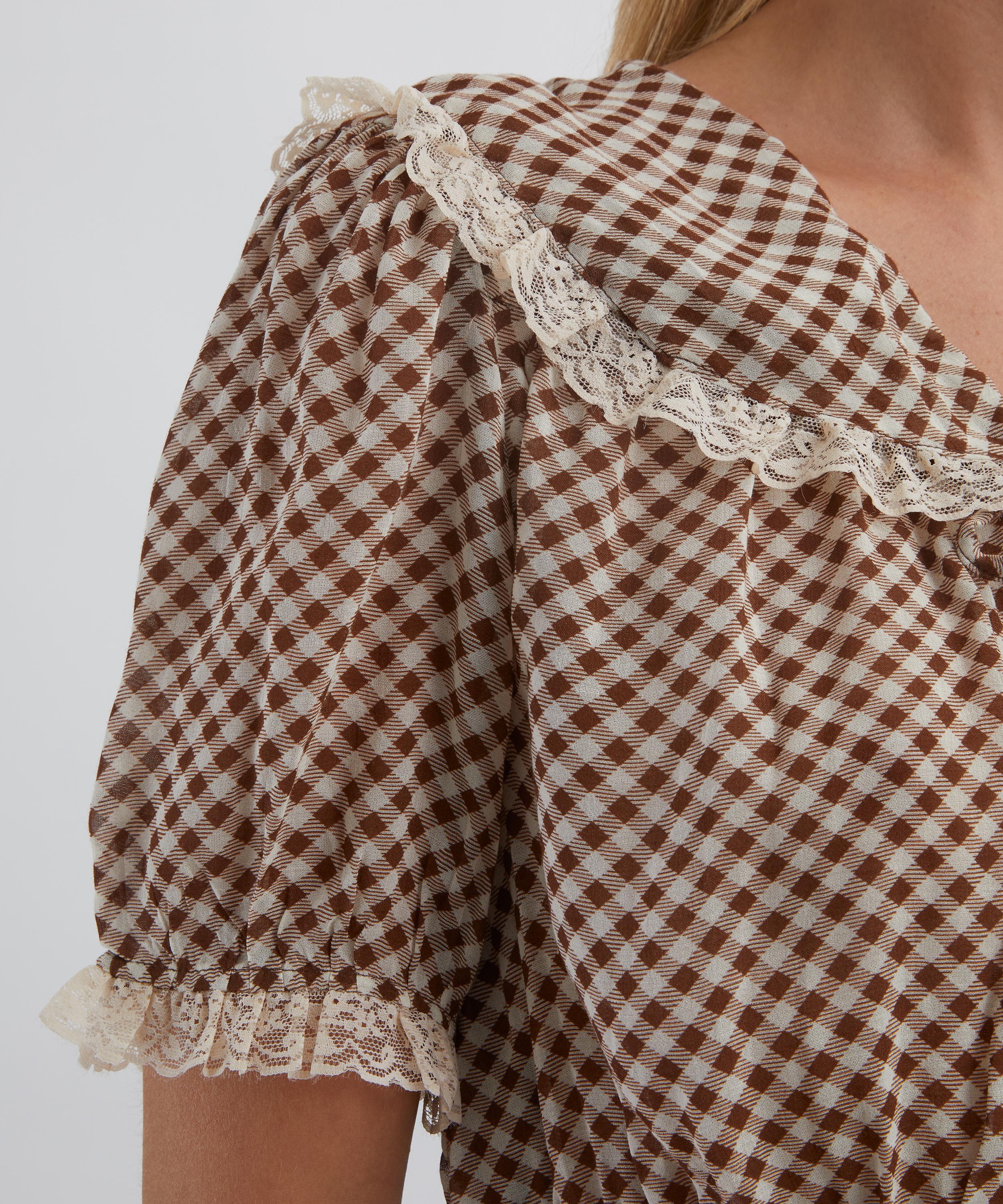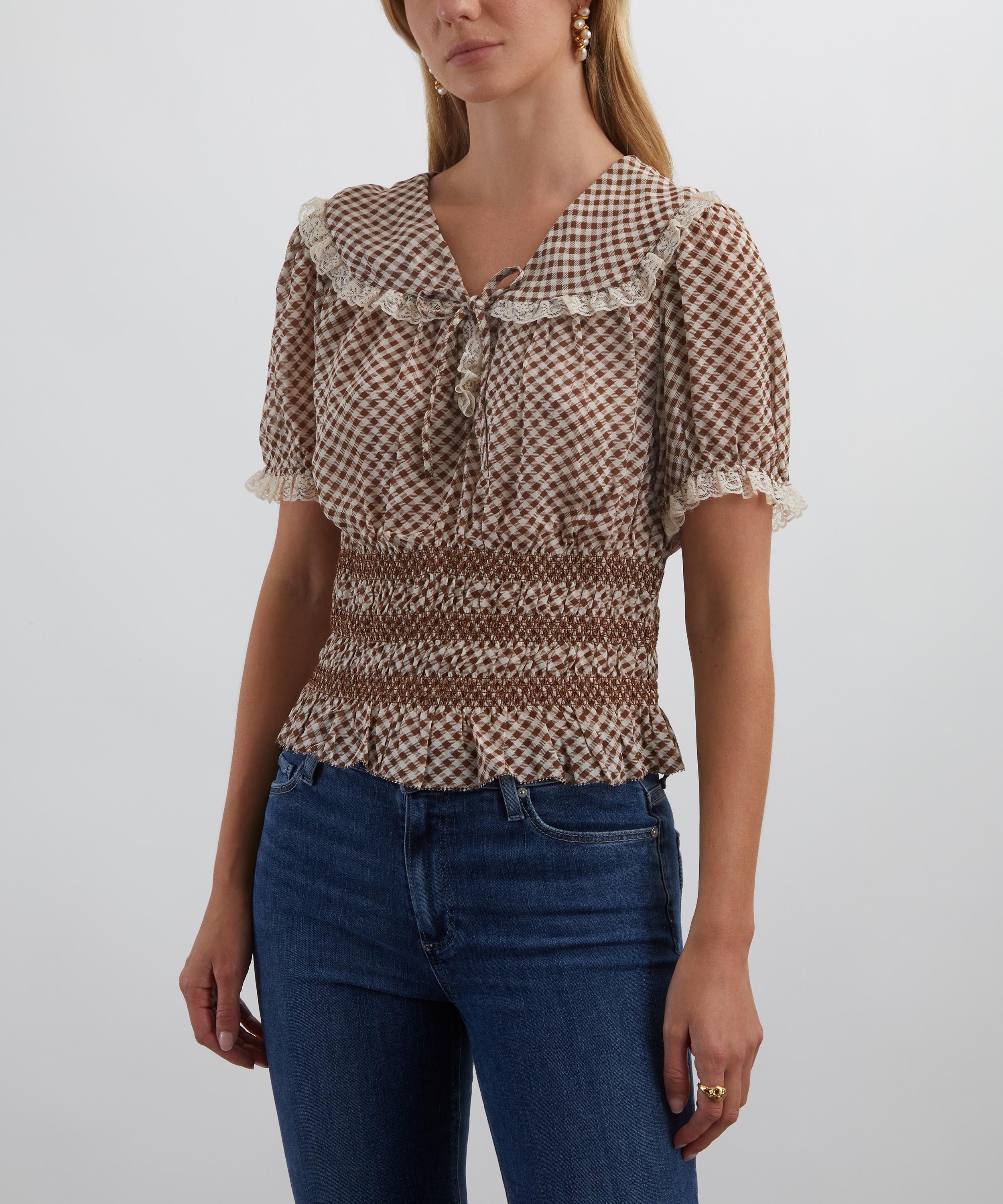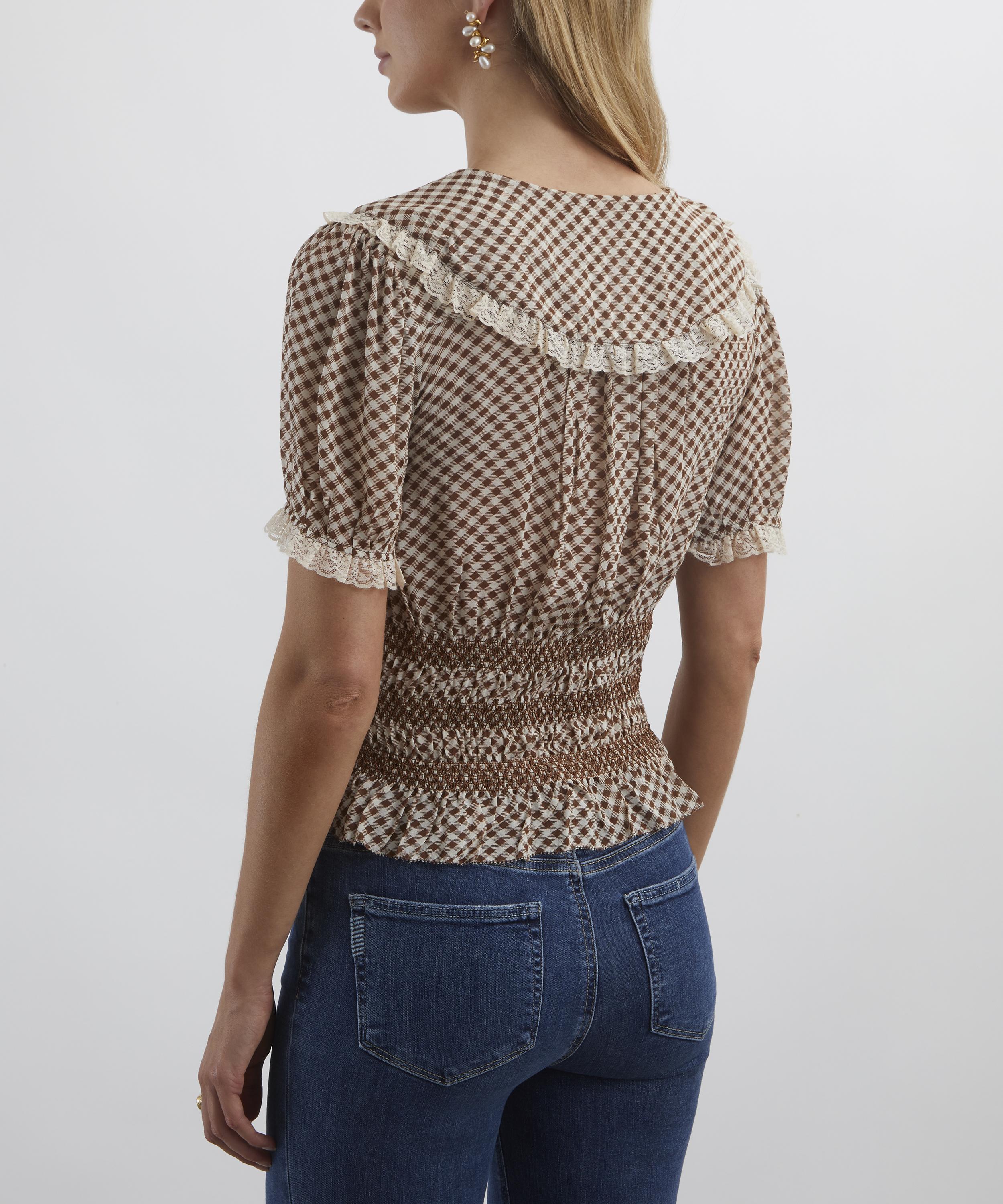 Crafted from lightweight crepe in a classic brown check, this top balances vintage charm with modern elegance. A deep V-neckline, lace-trimmed Peter Pan collar, short puff sleeves, and a smocked bodice creates a softly structured, feminine silhouette.