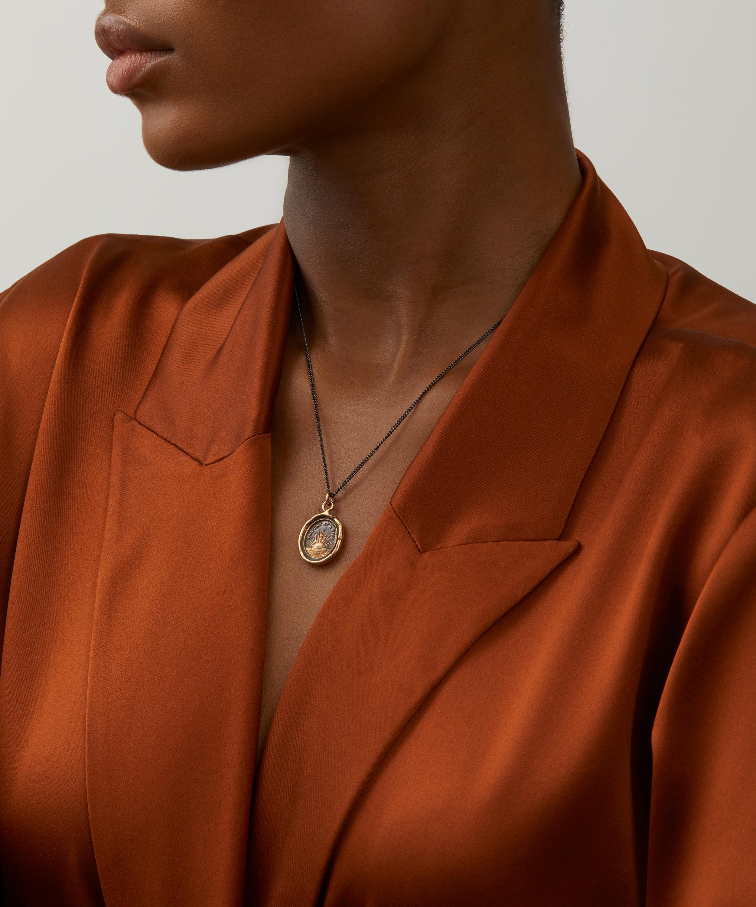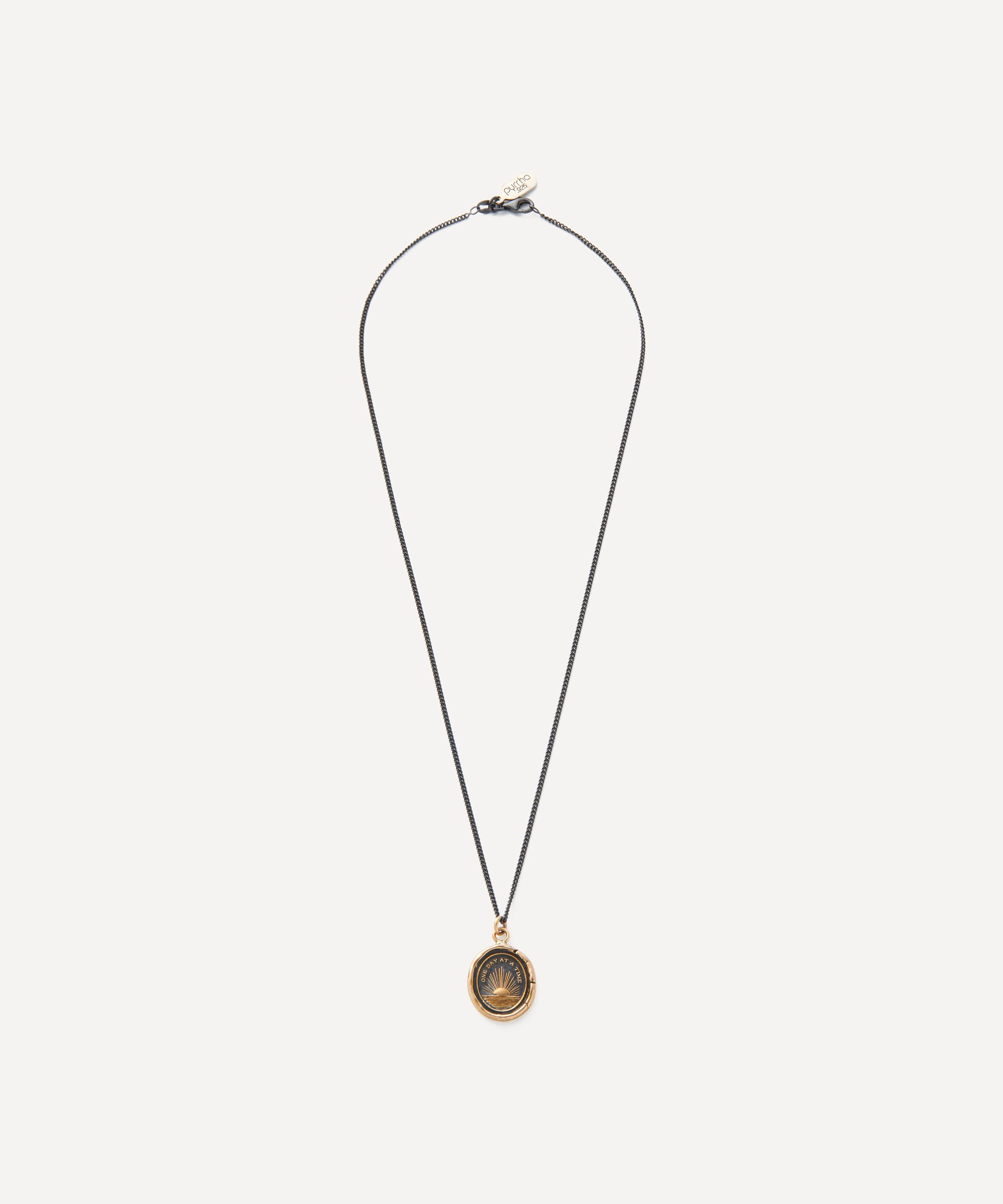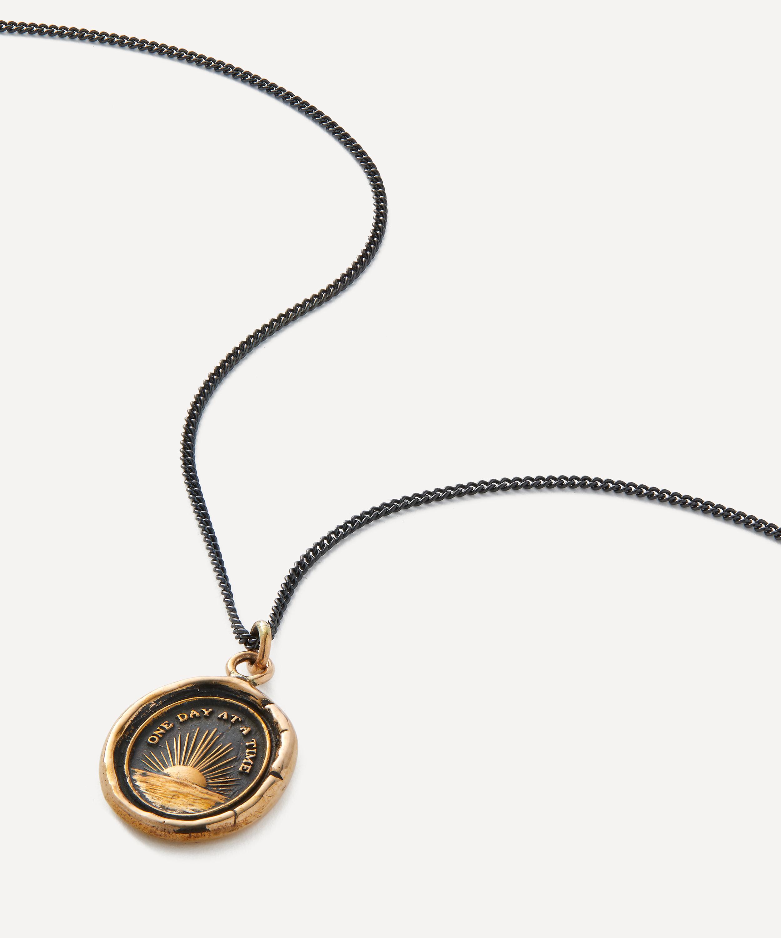 Imbue empowering meaning into your jewellery line-up with Pyrrha’s truly talismanic pendant necklace. Crafted from sterling silver and cast using authentic Victorian wax seals, it features a characteristically handsome and enigmatic pendant depicting a sun set with the words “One Day at a Time” – a reminder that a meaningful life unfolds day by day. By making positive choices in the moment, rather than fixating on the uncertainties that may lie ahead, we can find the strength and resilience we need to create the lives we want. Complete with a classic curb chain, wear it solo, or layer it with other necklaces to build a stack.