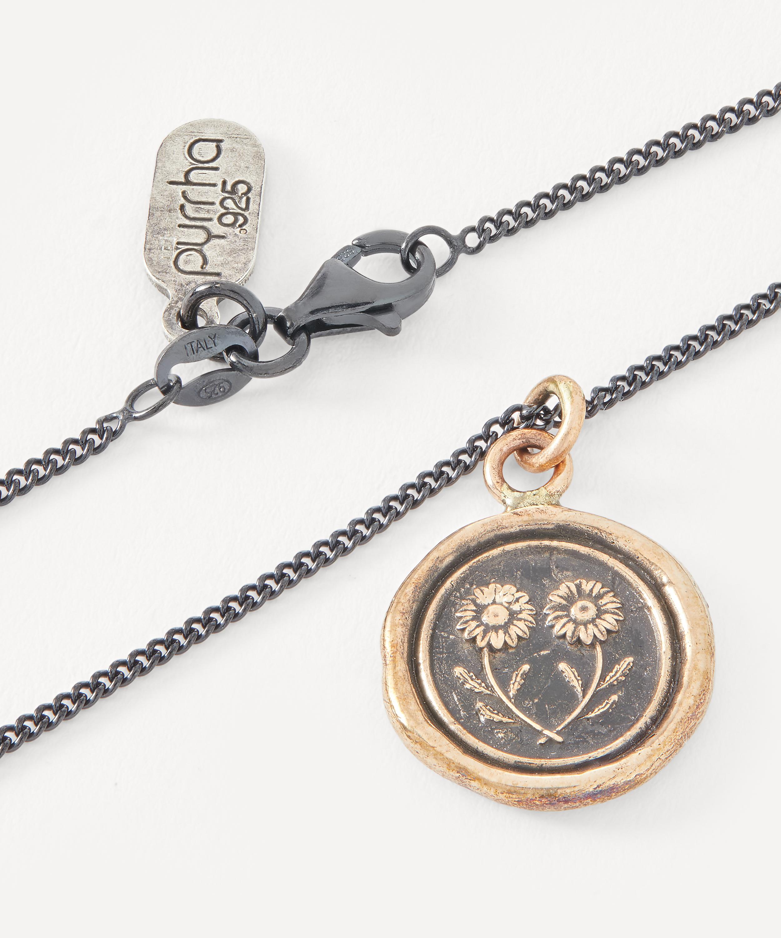 Handcrafted in Vancouver, Canada, it is adorned with a bronze talisman suspended from a sterling silver curb chain. Two daisies are intricately etched across the pendant, representing two souls growing together. Present it to a loved one as a symbol of respect, understanding and strength, or wear it yourself as a special token.