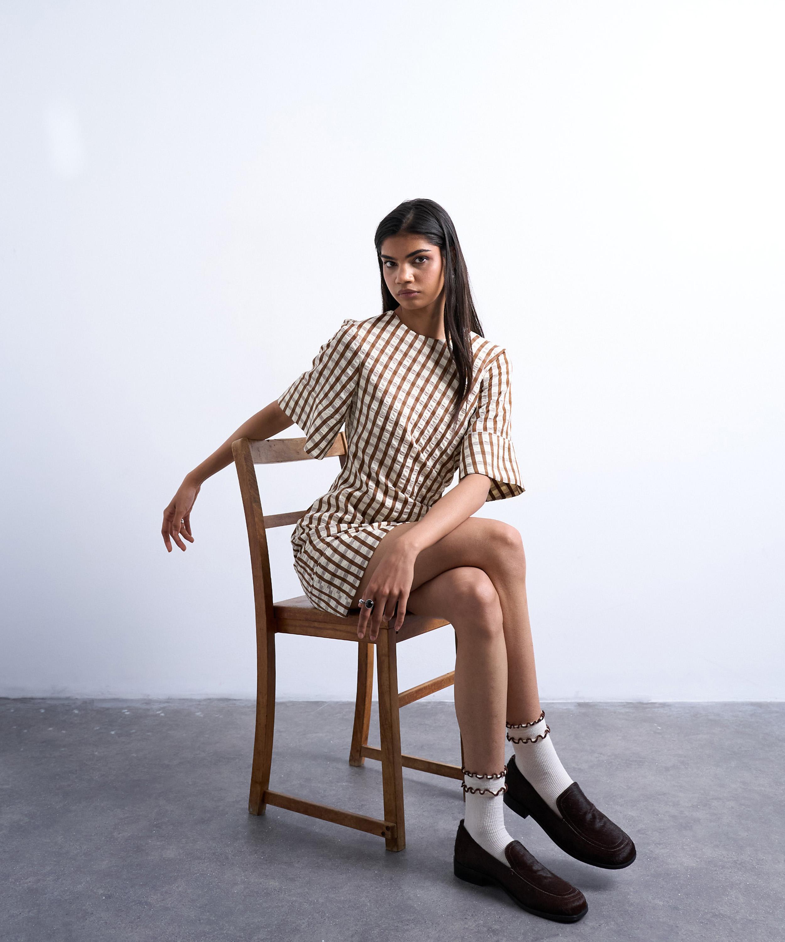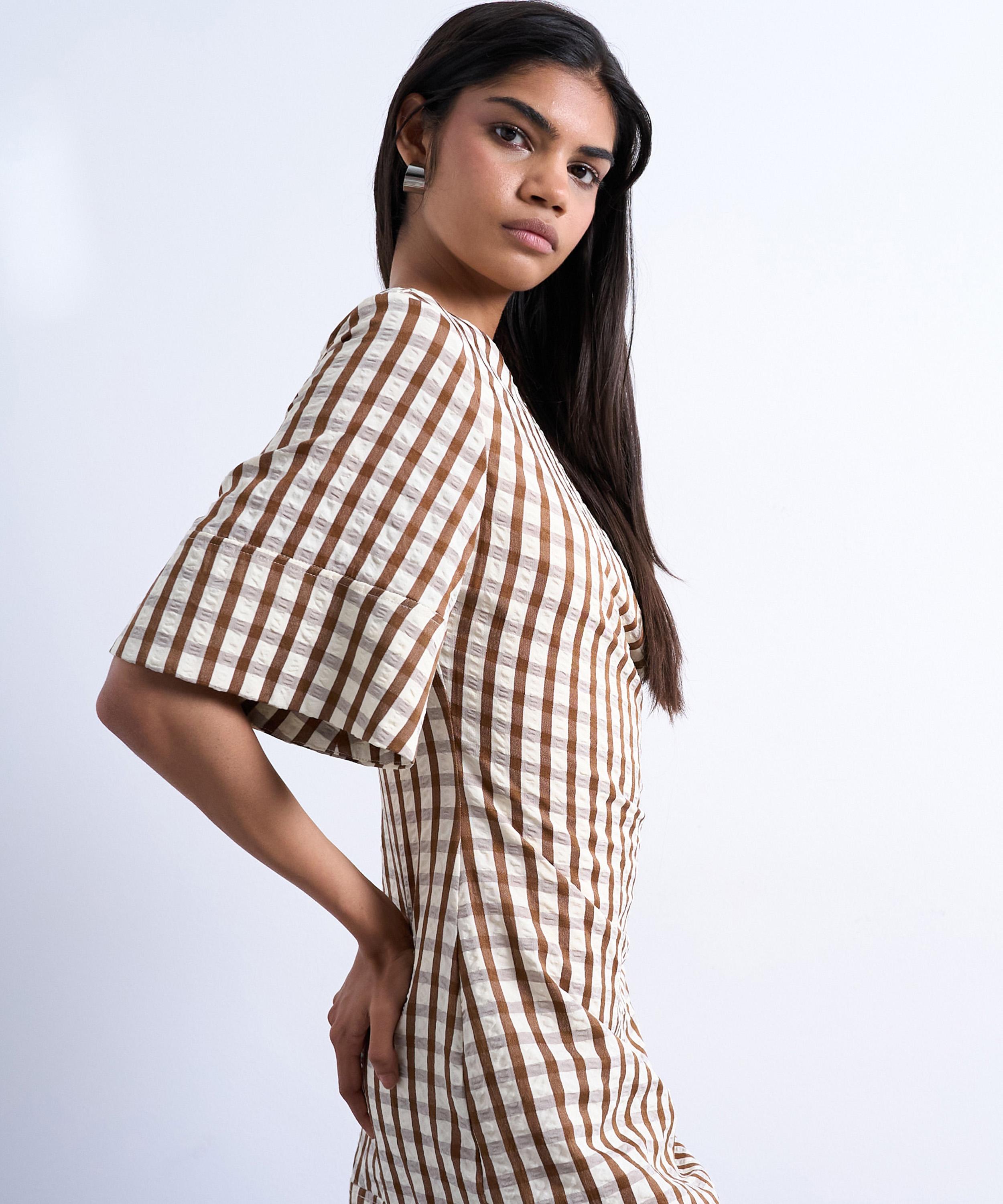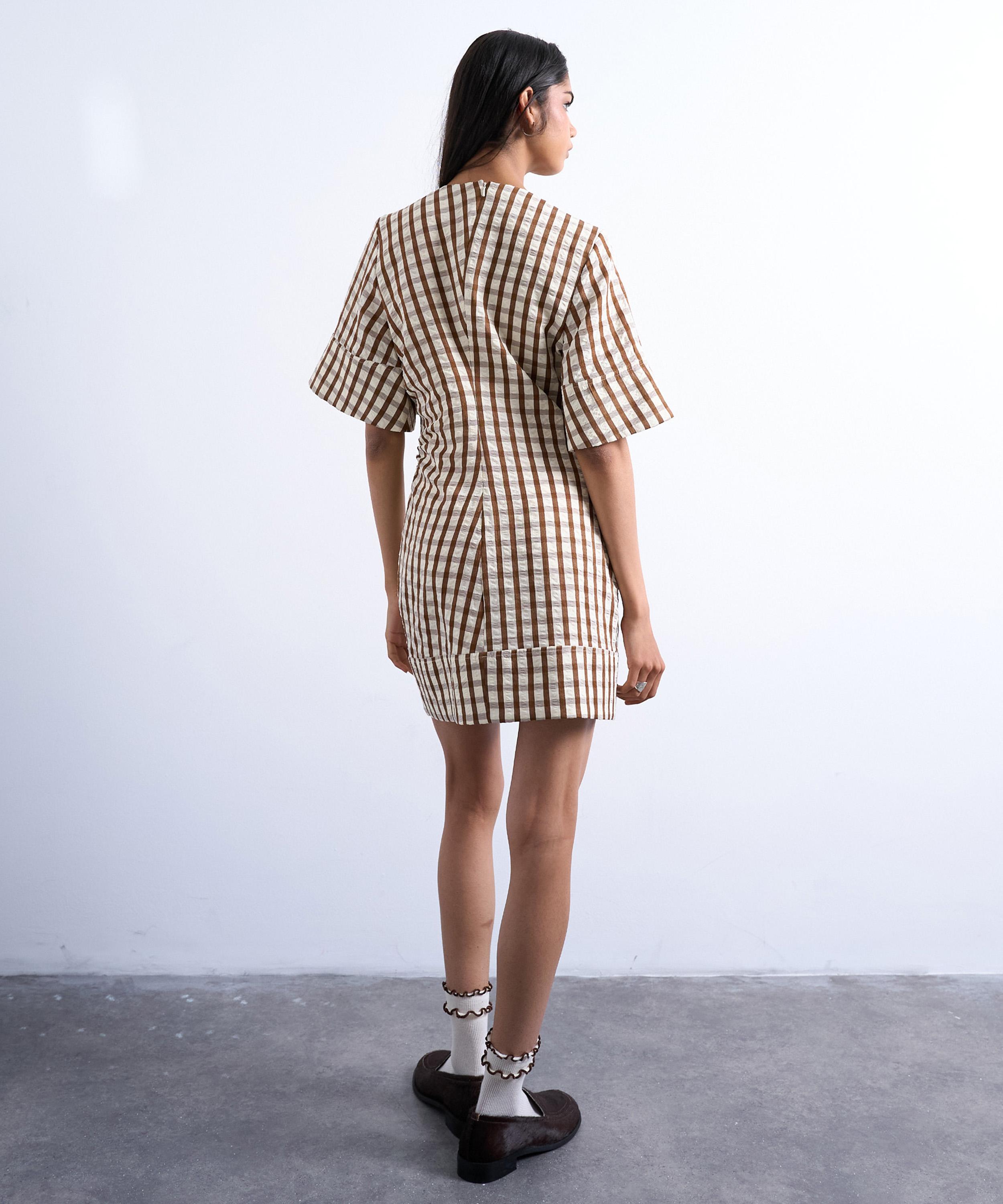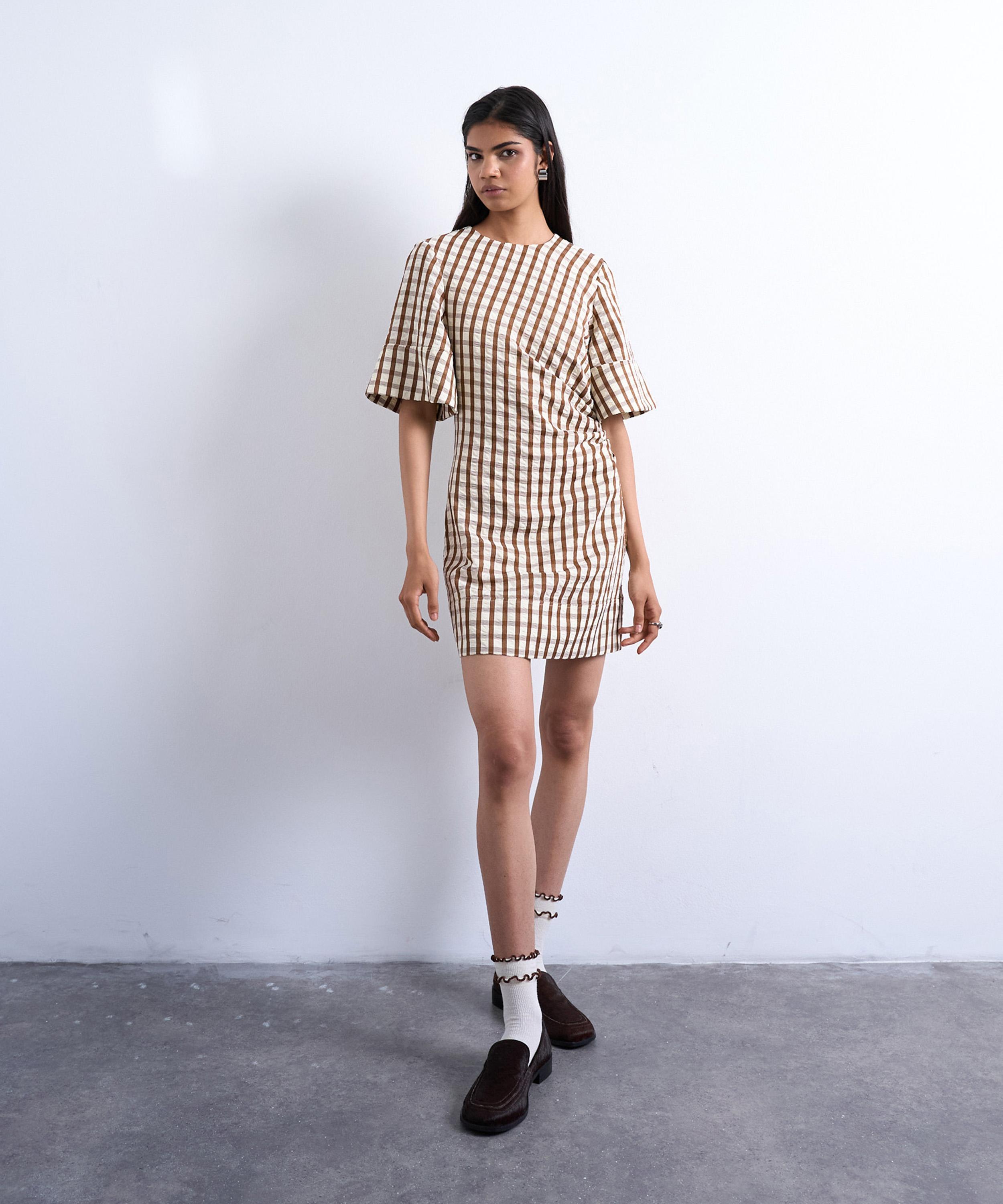 Crafted from lightweight seersucker fabric adorned with a puckered brown check, this mini dress features a round neckline, short sleeves, and a ruched waist that adds a softly gathered finish.