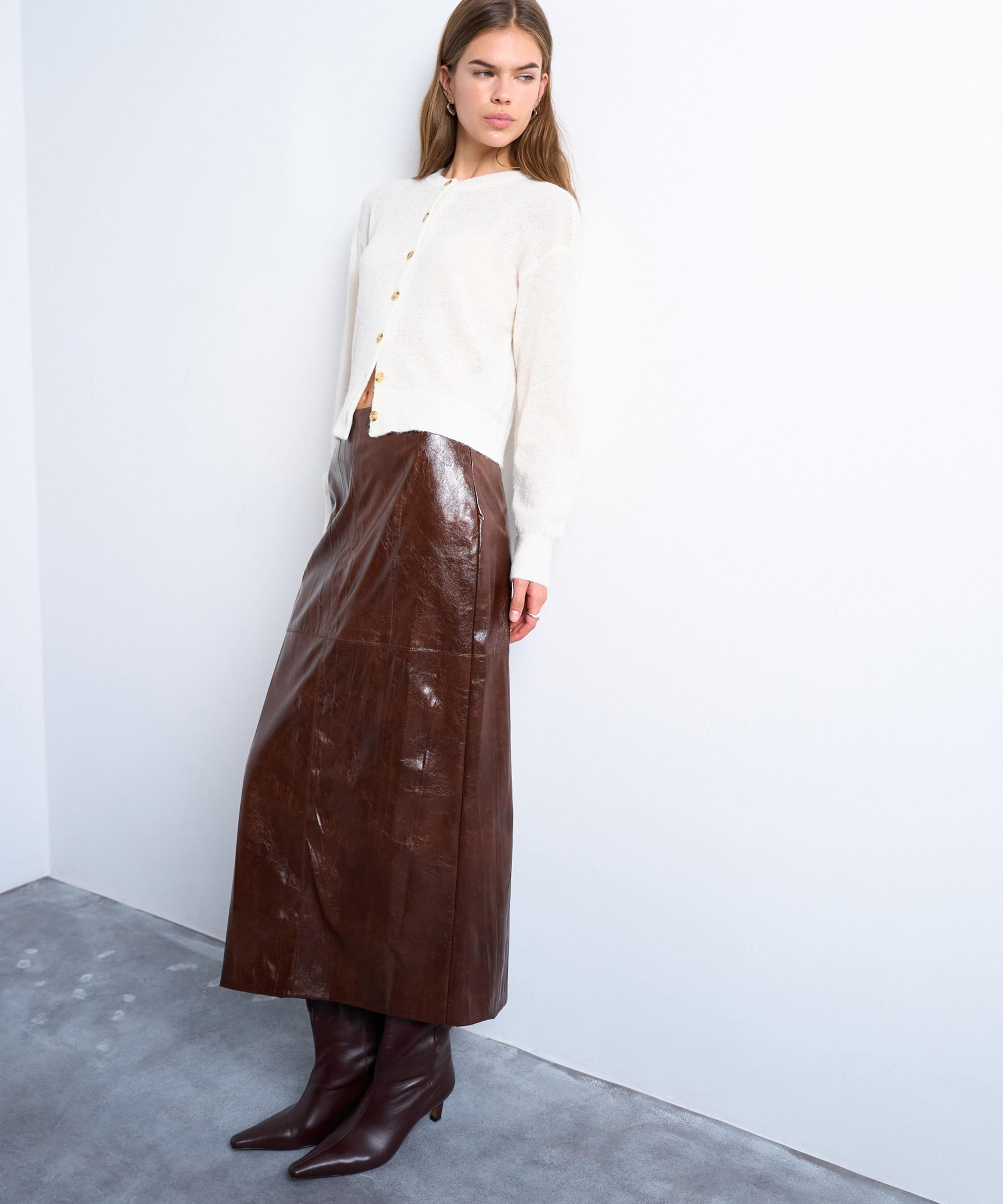 Brown Faux Leather High-Shine Midi Skirt