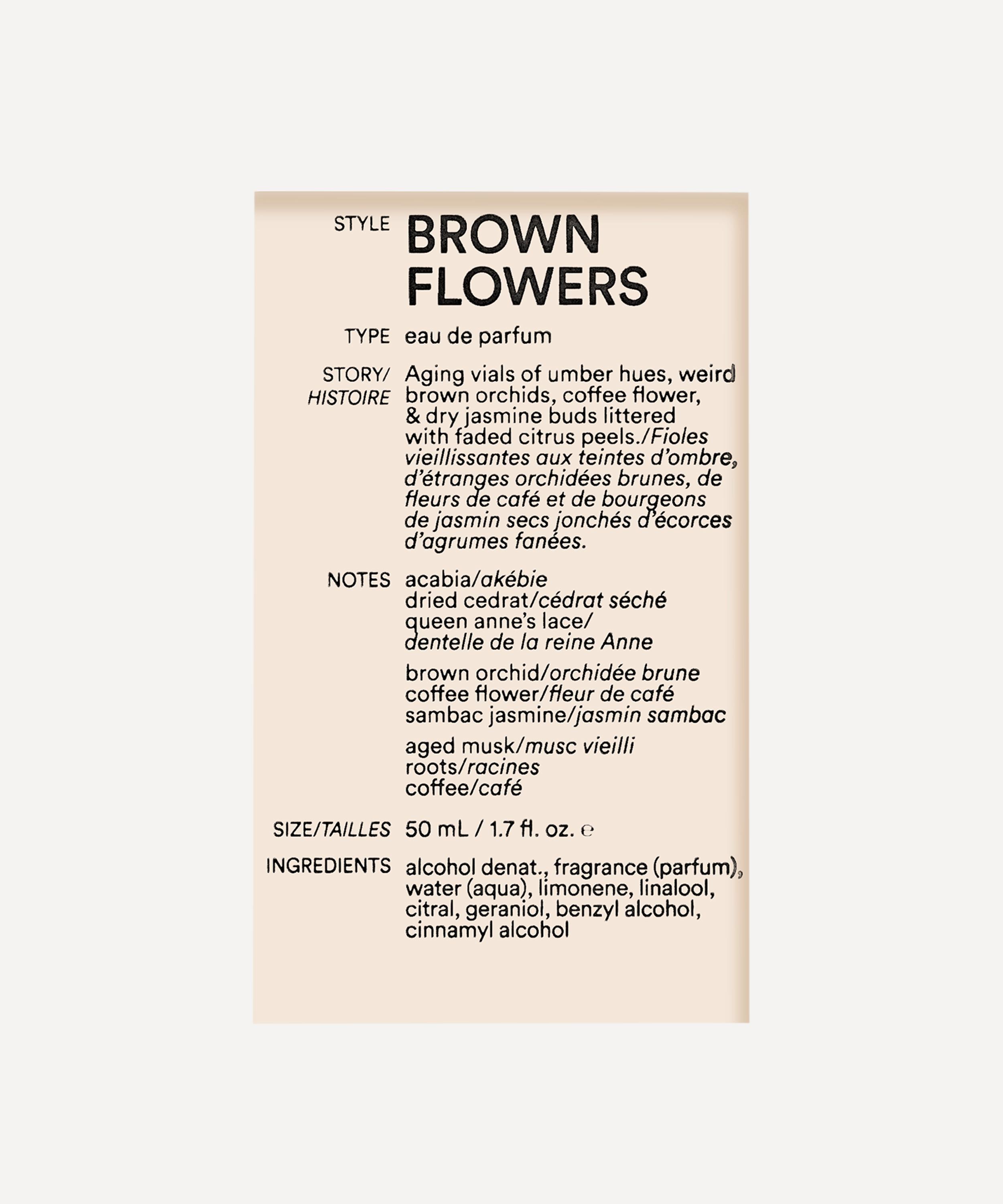 Evoking the intriguing aroma of aging vials of umber hues; strange brown orchids, coffee flower, dry jasmine buds, and faded citrus peels, this deep brown floral perfume is the ultimate signature for amateur modernists.