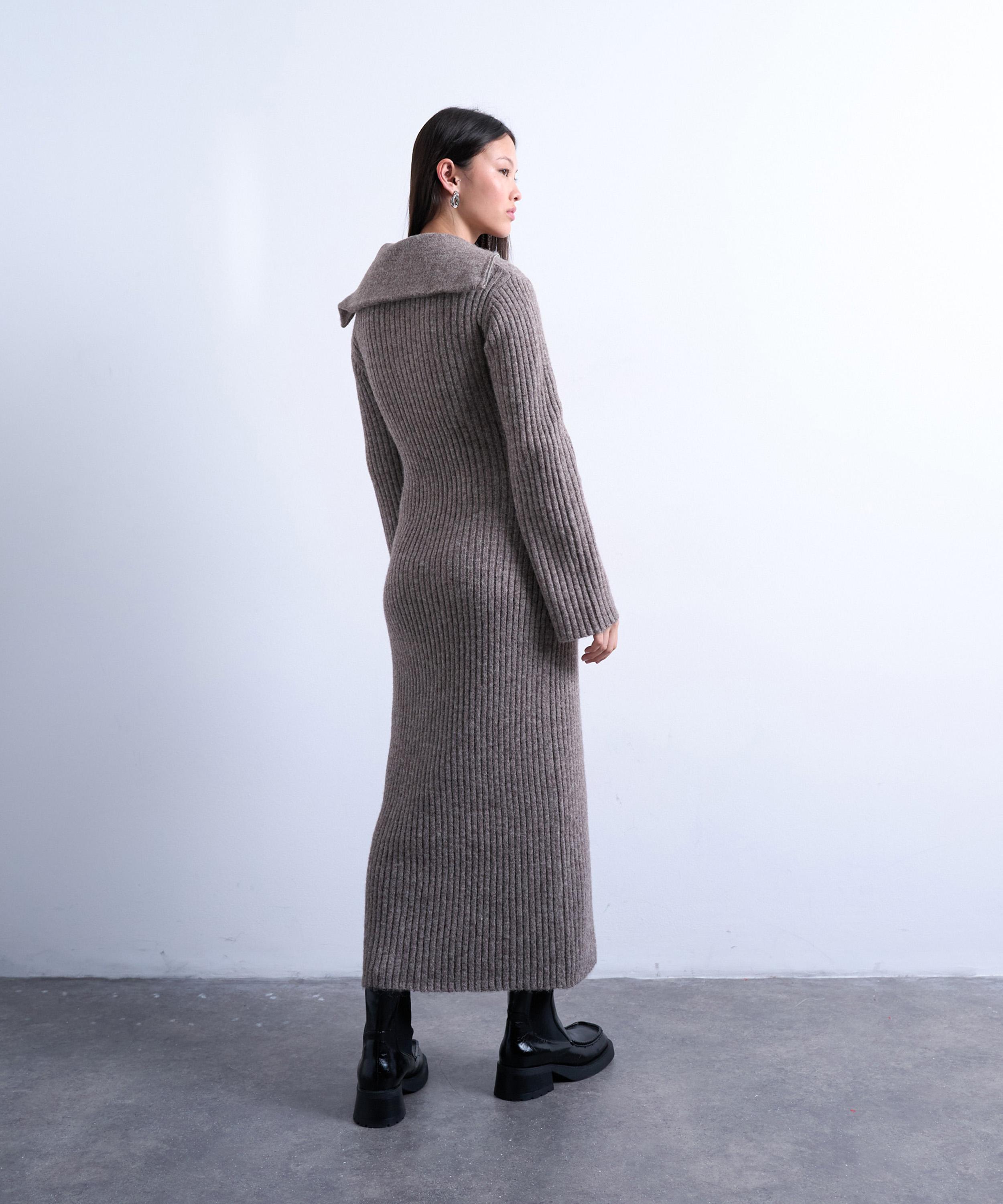 Knitted from a brown ribbed yarn, this midi dress is cut for a slim fit with long sleeves and finished with an oversized collar, secured with a partial zip fastening.