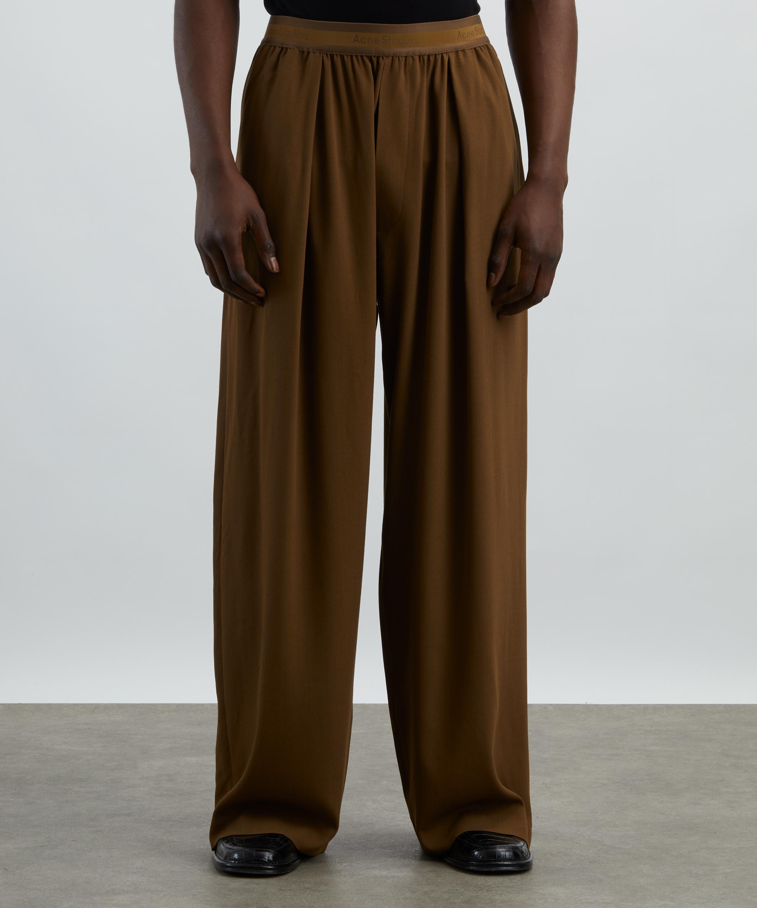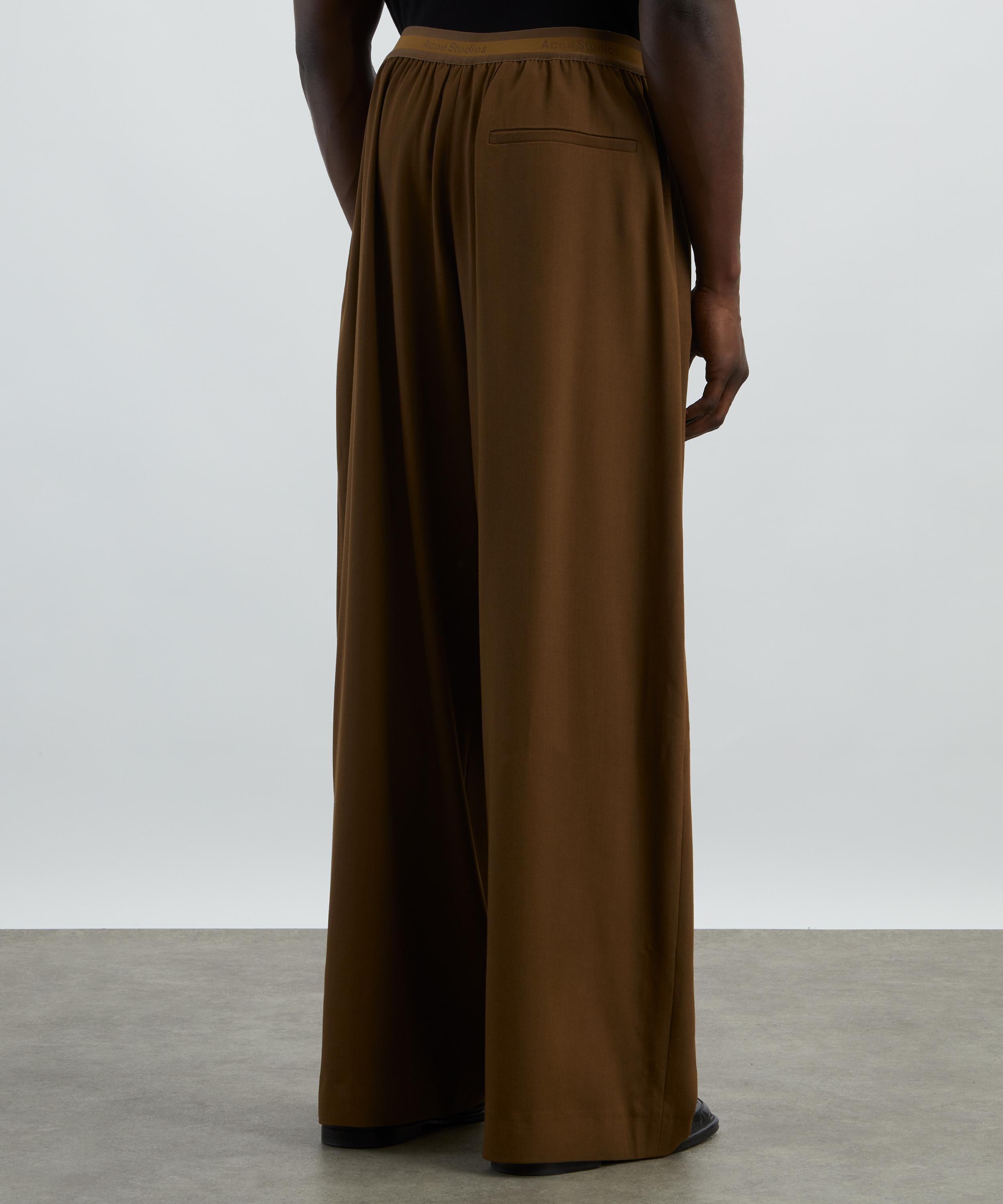 Crafted from a premium viscose-wool blend, these loose-fit trousers feature wide legs for an effortlessly relaxed silhouette. Finished with a logo-embossed elasticated waistband, they strike the perfect balance between elevated style and everyday comfort.