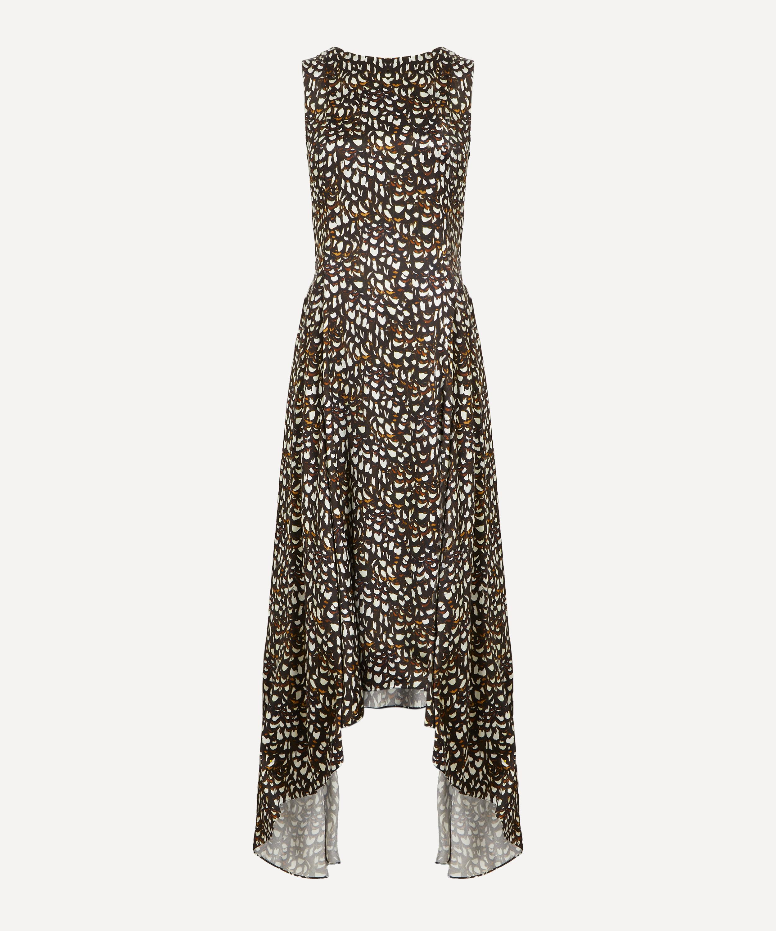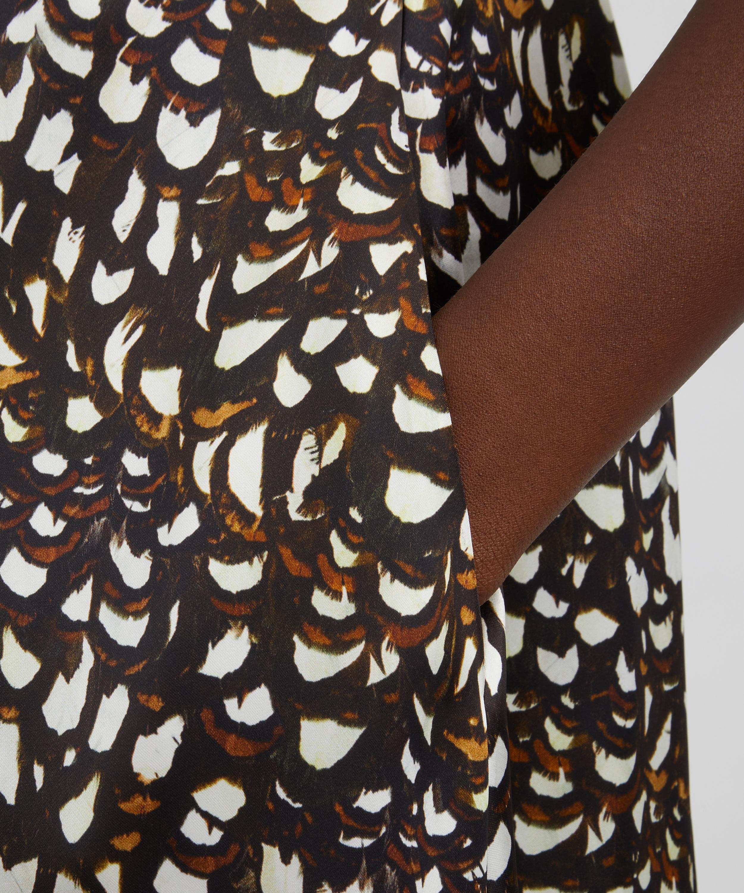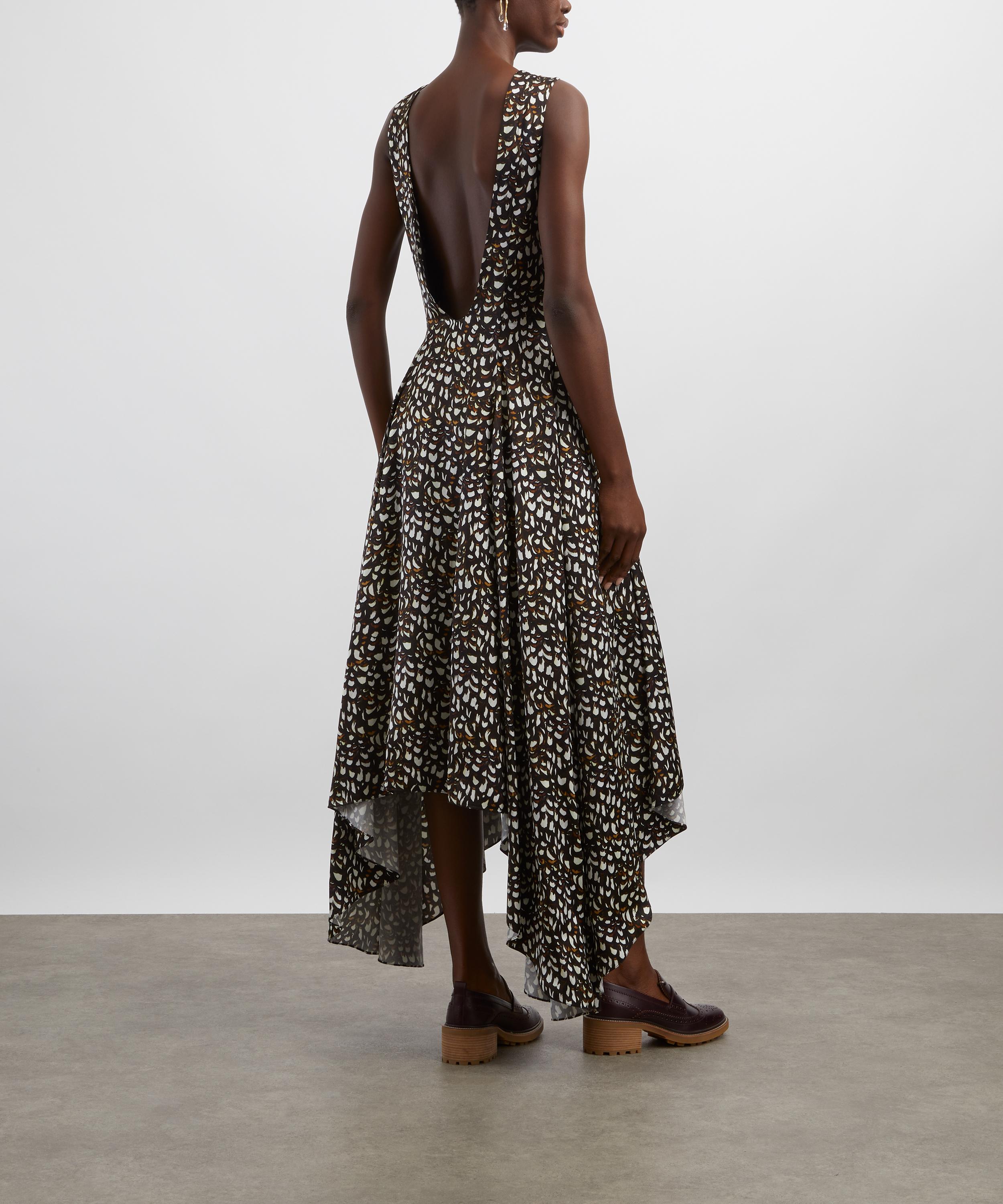 Crafted from lightweight viscose crepe and adorned with a brown and white feathered print, this midi dress embodies effortless elegance. A boat neckline and open back lend a refined allure, while the asymmetric waterfall hem adds graceful movement to the silhouette.