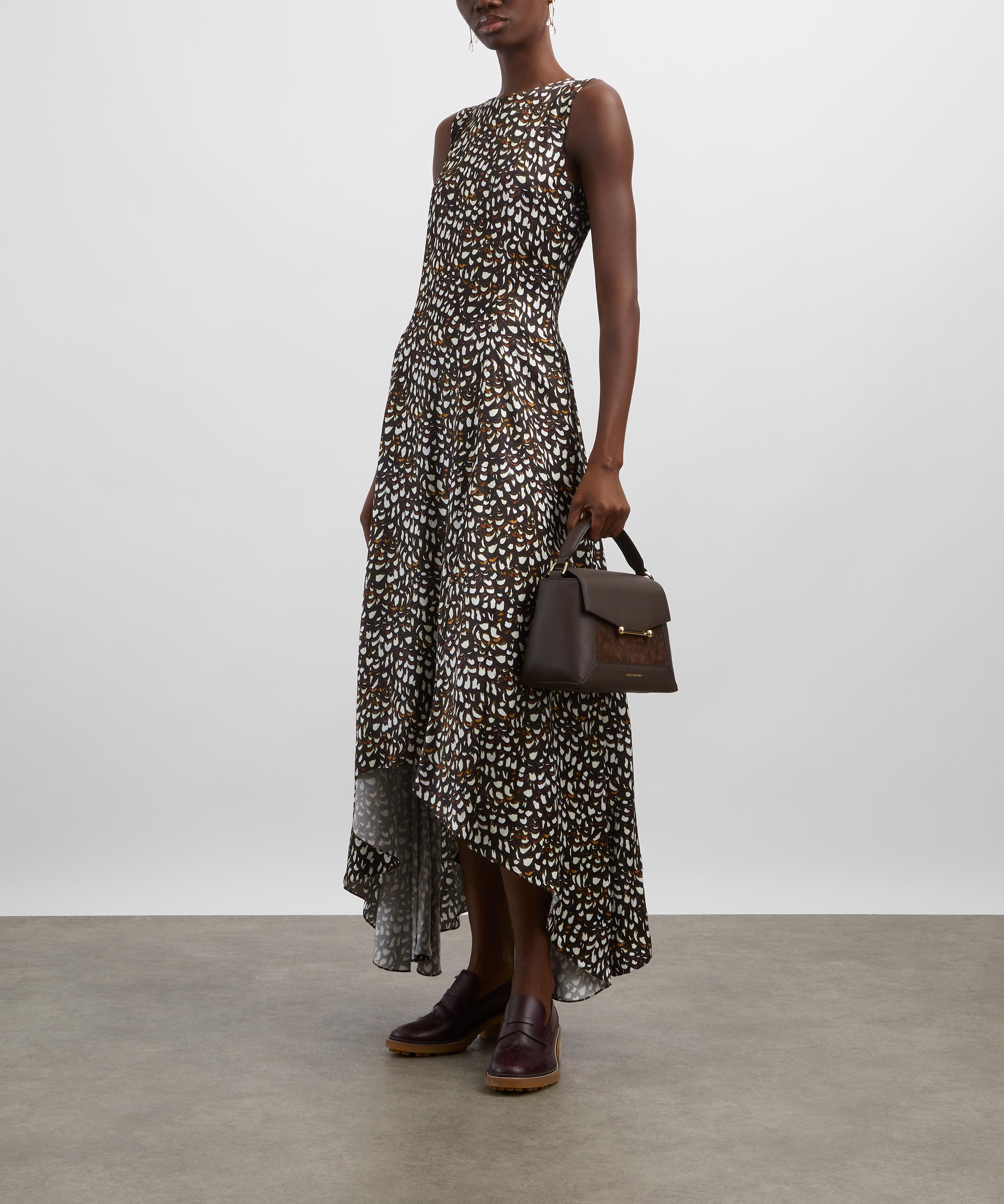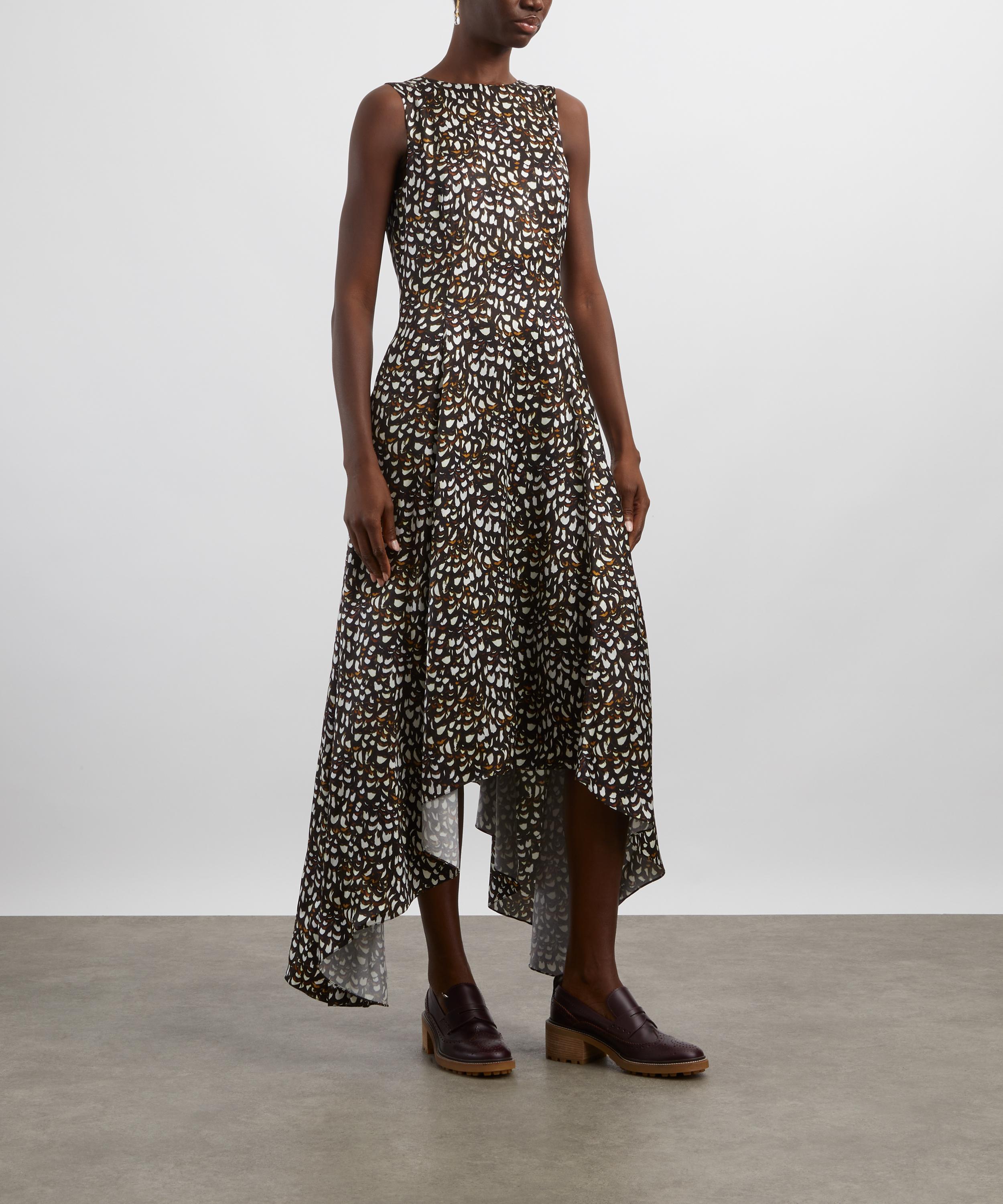 This Brown Printed Asymmetric Dress by LOEWE seamlessly combines timeless Spanish craftsmanship with a hint of English wit.