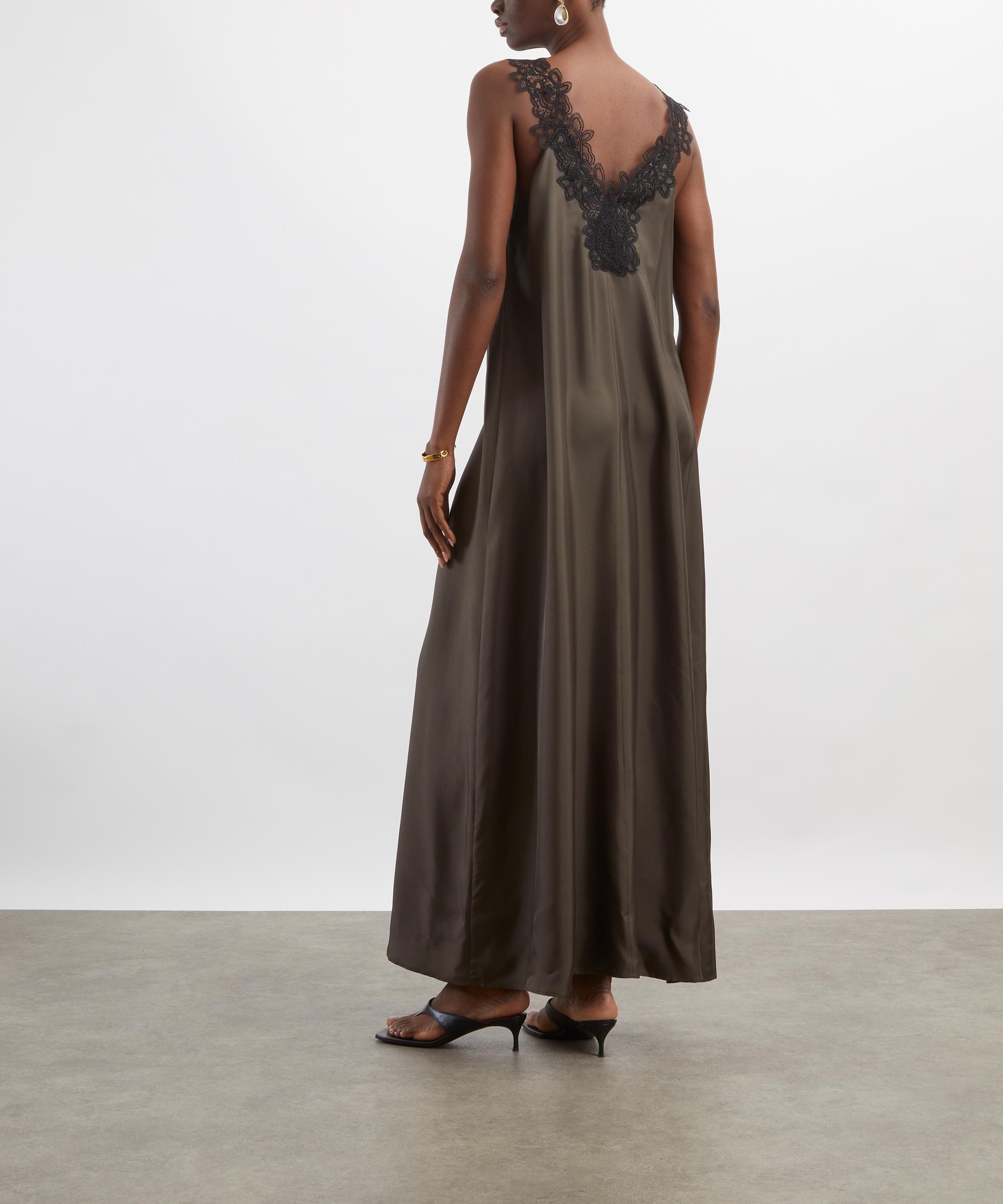 Effortlessly refined, this lightweight silk slip dress is designed with a loose, longline silhouette and finished with a lace-trimmed V-neckline and back for an easy yet chic evening look.