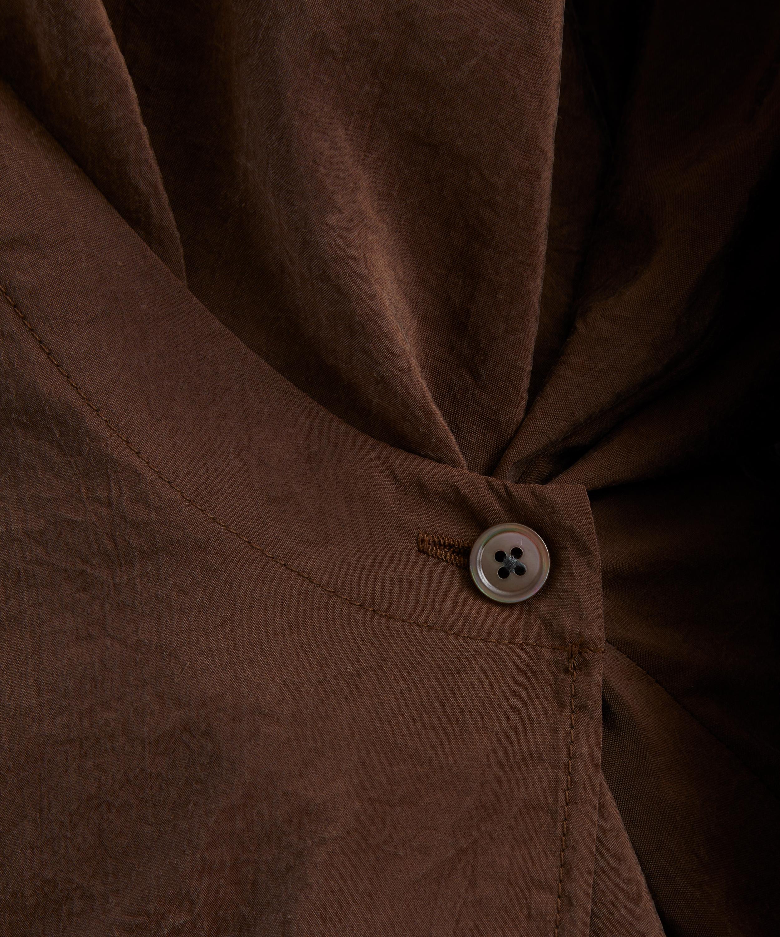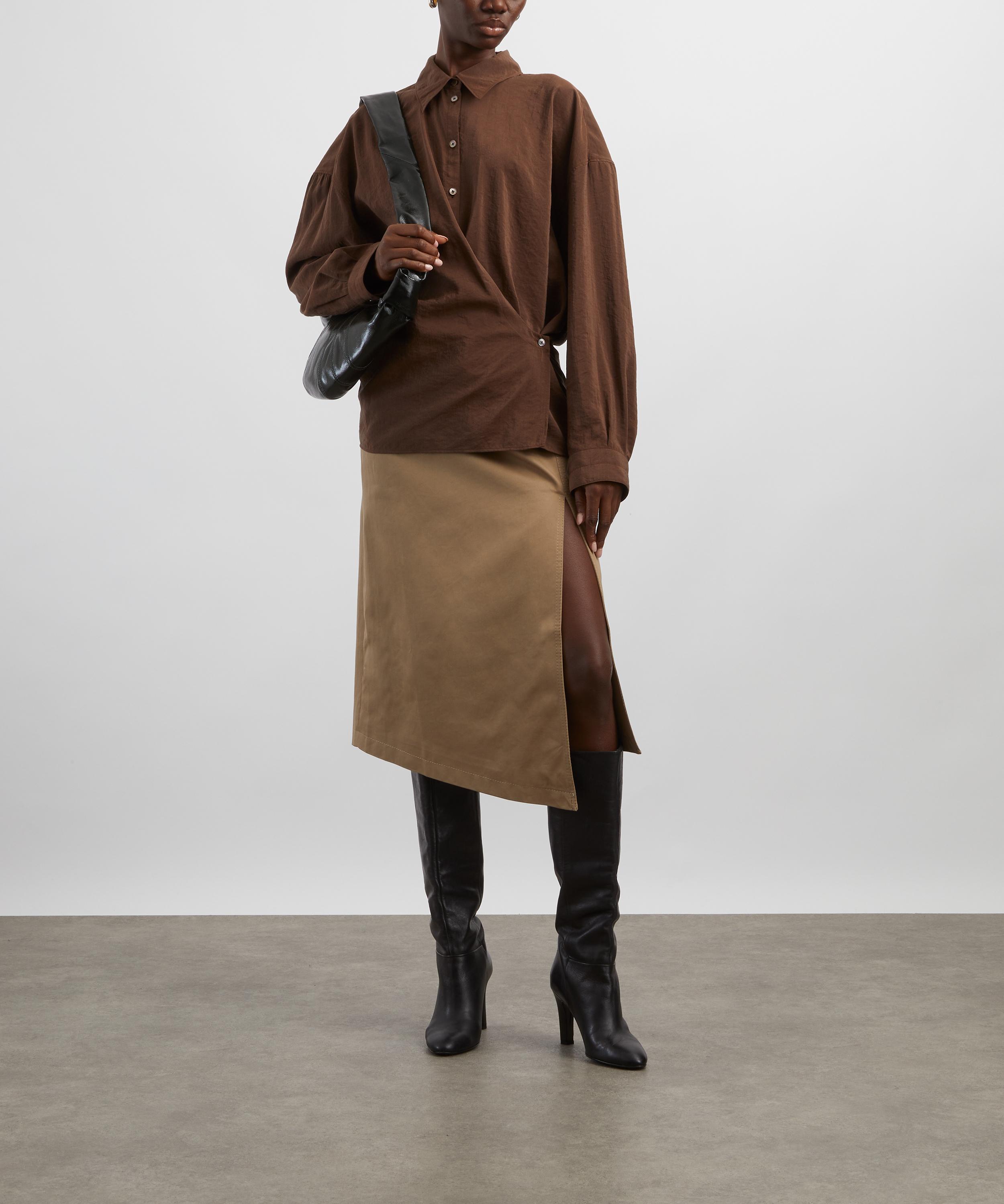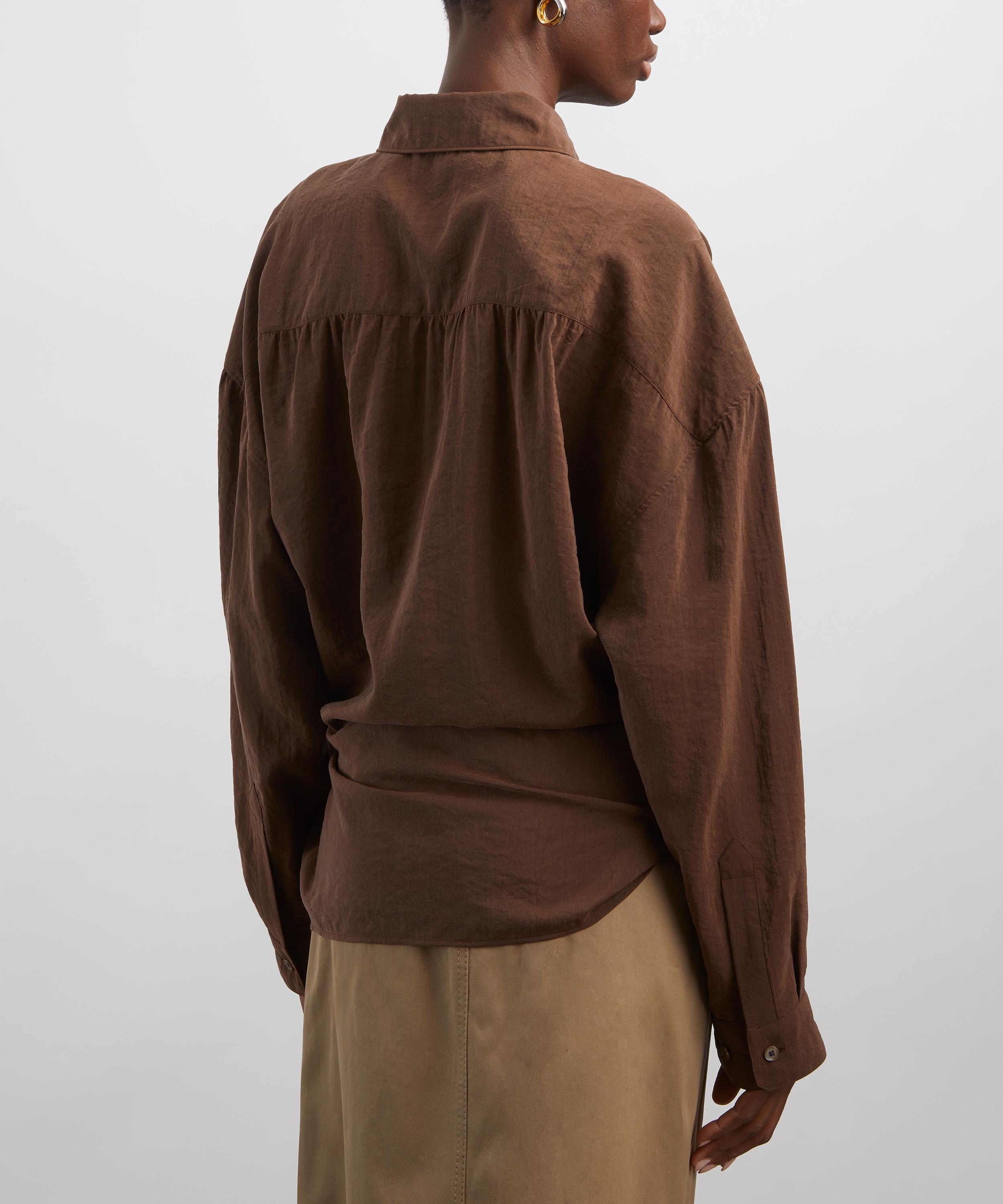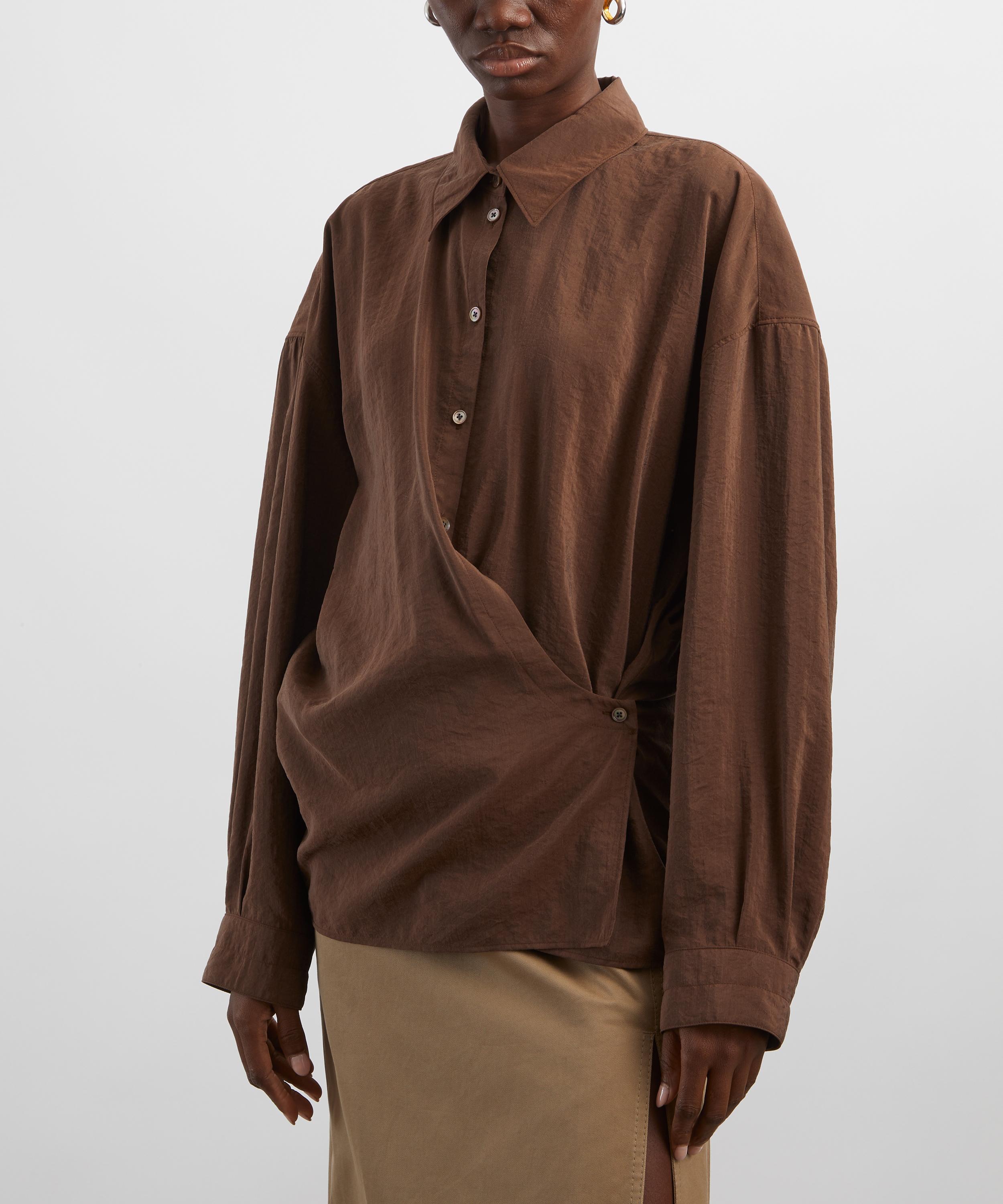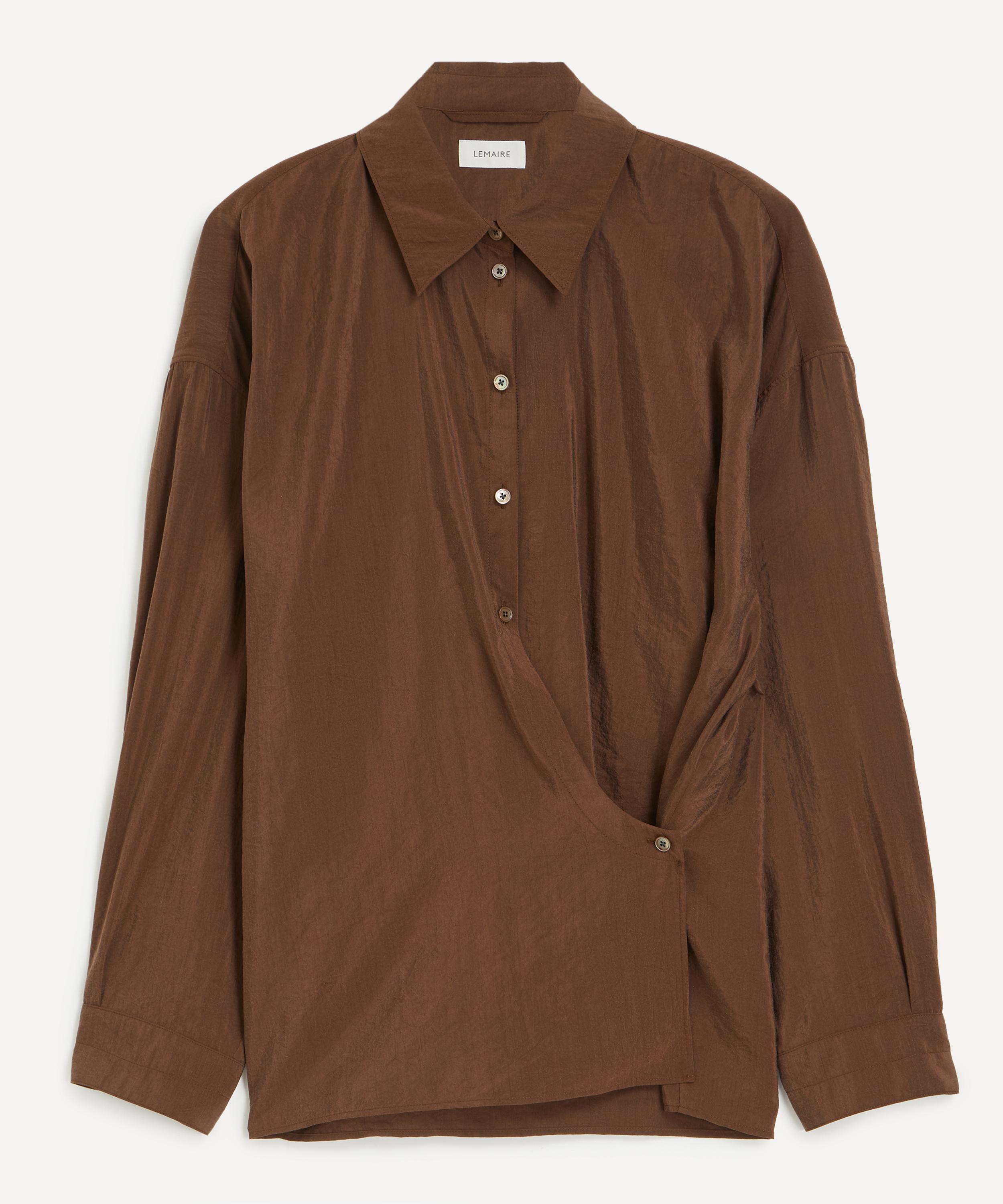 Crafted from a dry silk blend with a subtly crinkled texture, this twisted shirt reimagines classic tailoring with a contemporary edge. Its asymmetrical button placket wraps around the waist and fastens at the side seam, creating a sculptural, modern silhouette.