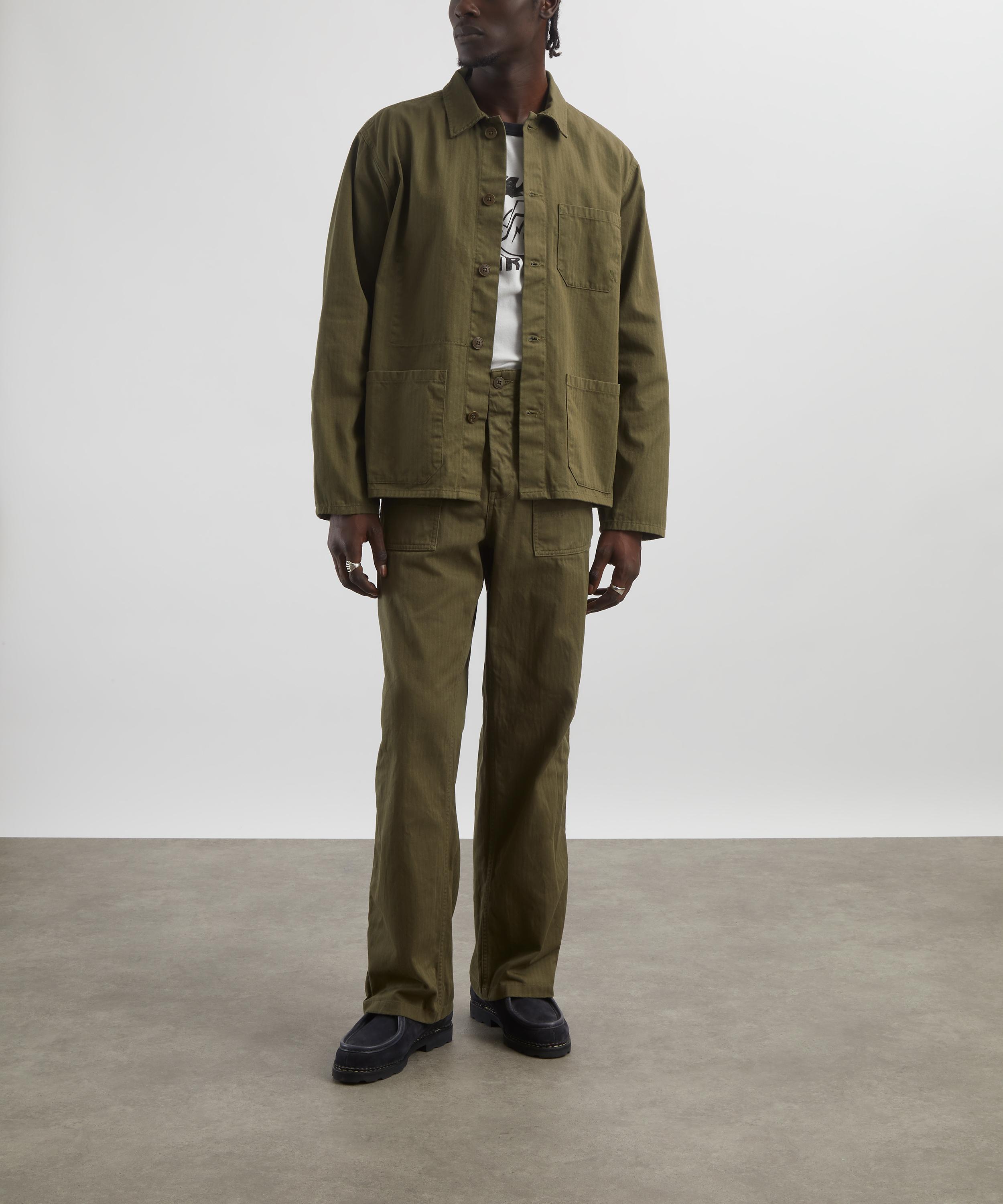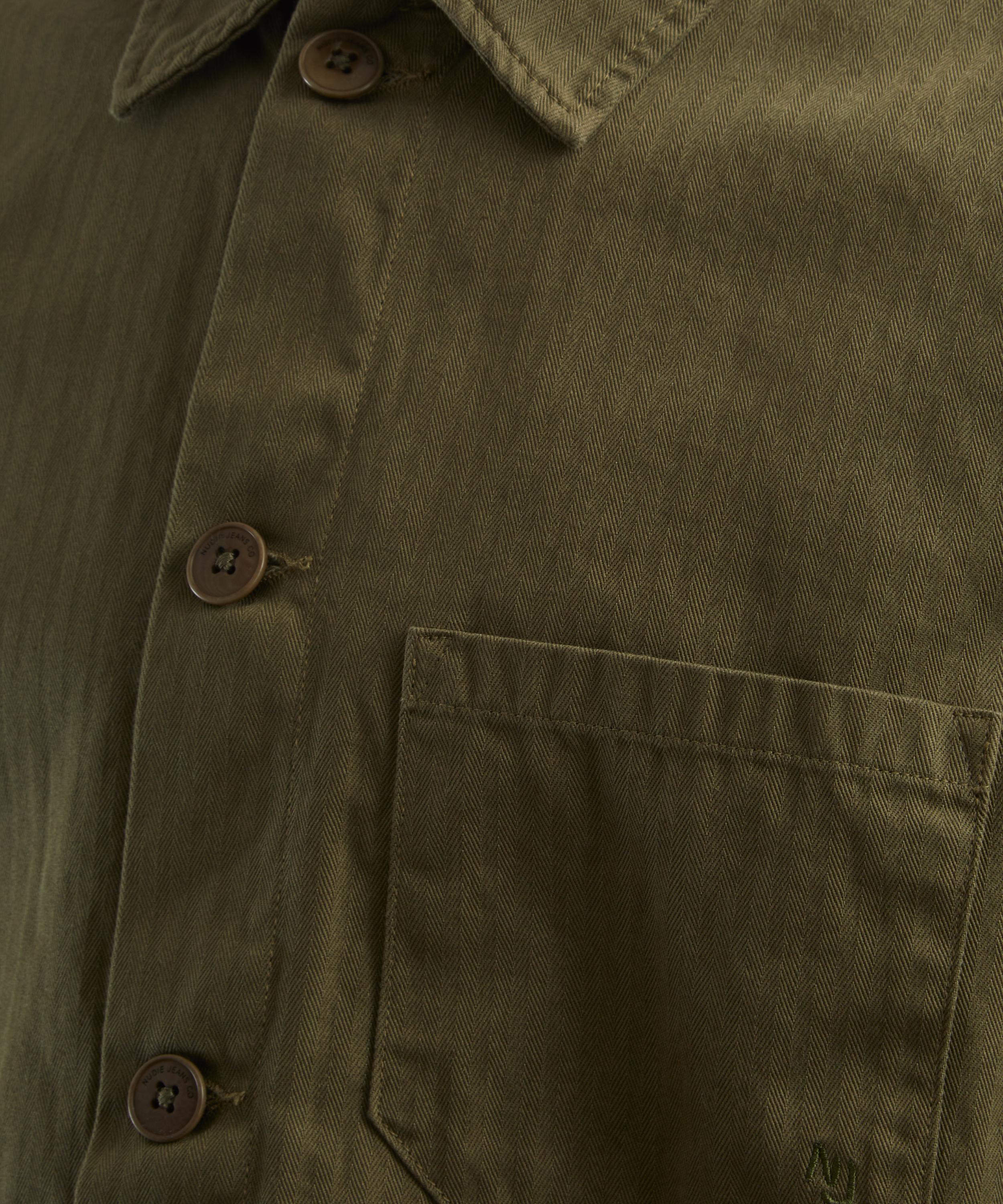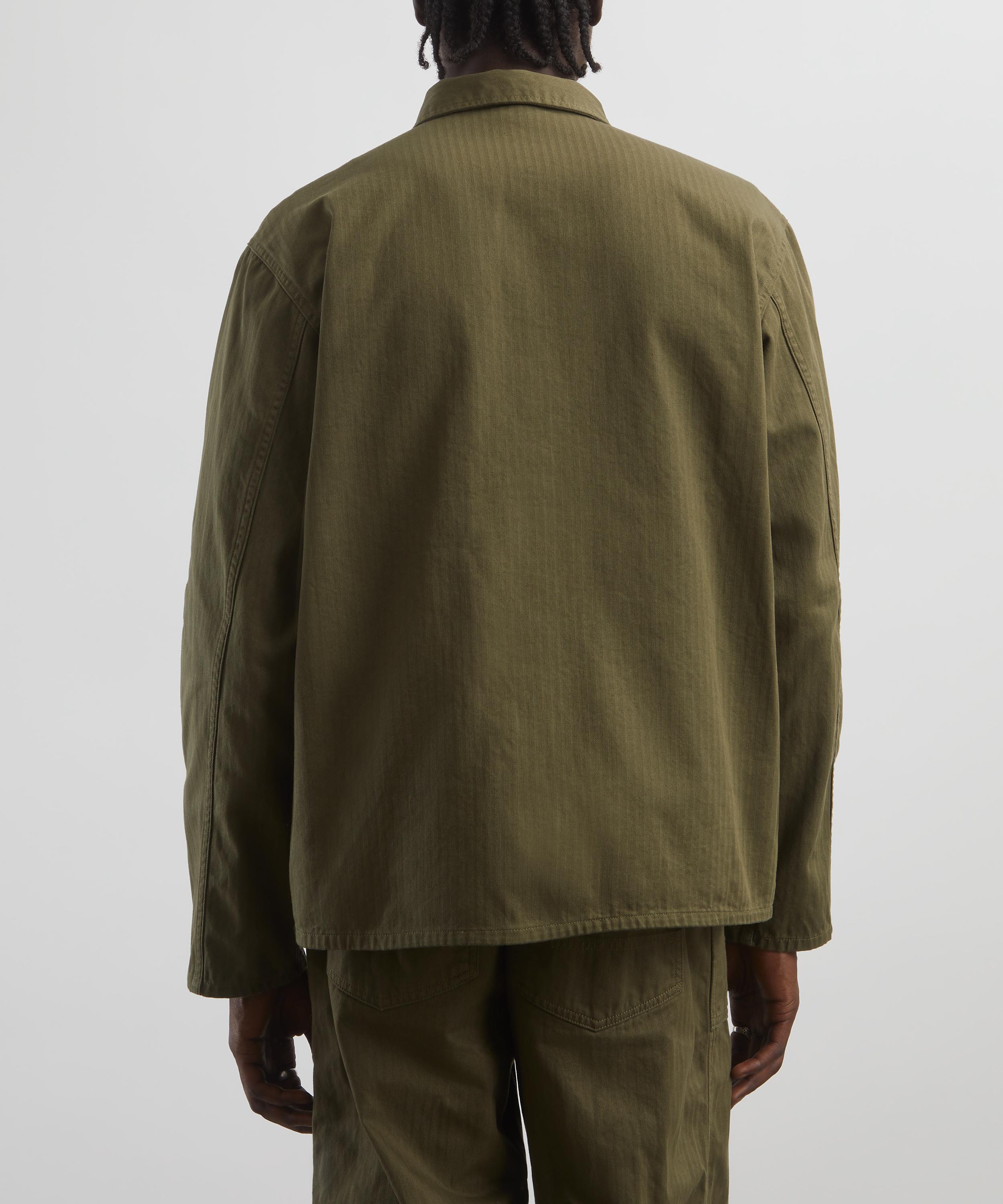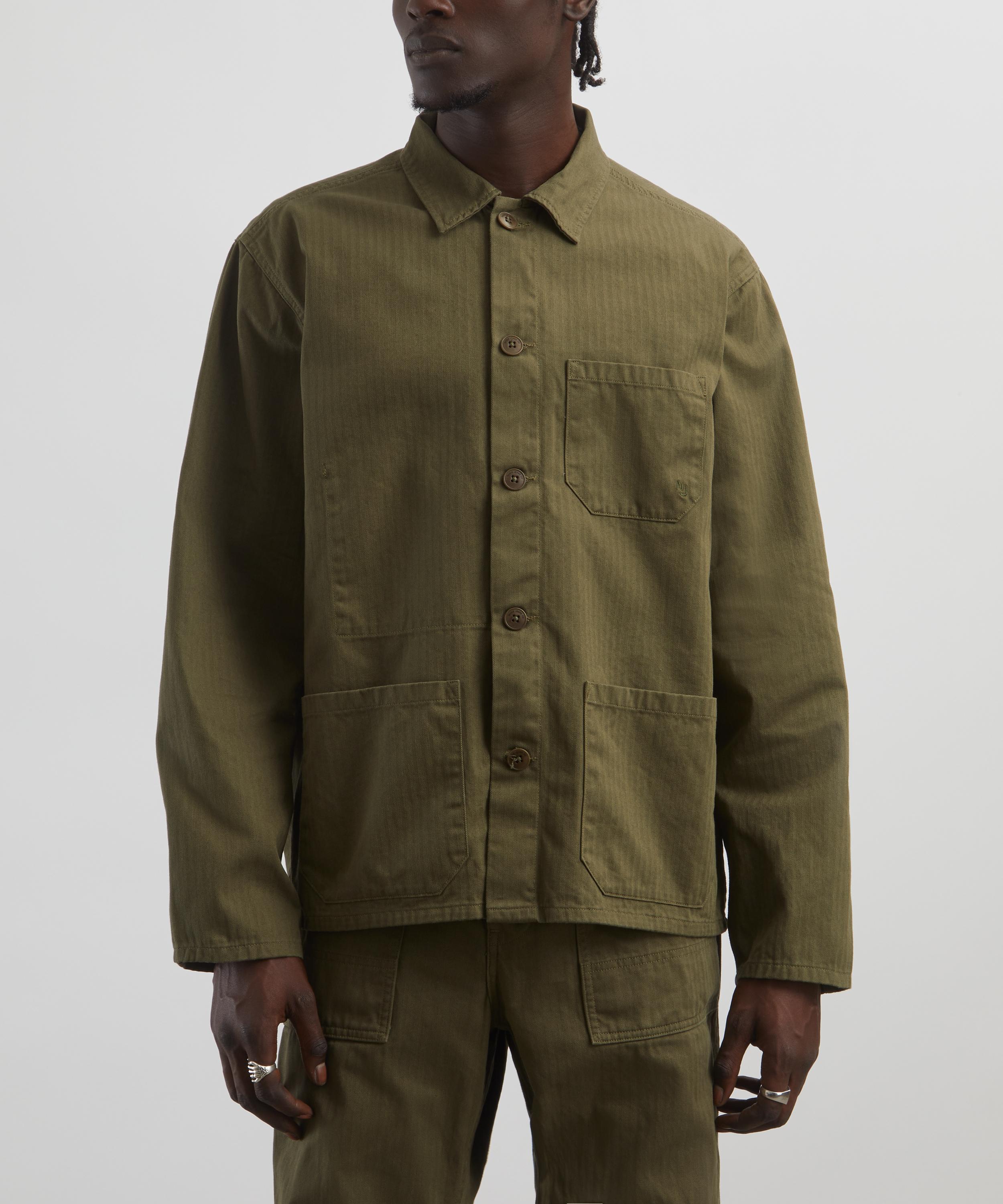 Slickly crafted in herringbone twill, this workwear-inspired jacket features all the essential details with three patch pockets, a buttoned front closure and point collar with the main seams sewn with felled twin-needle seams for a clean and sturdy finish.