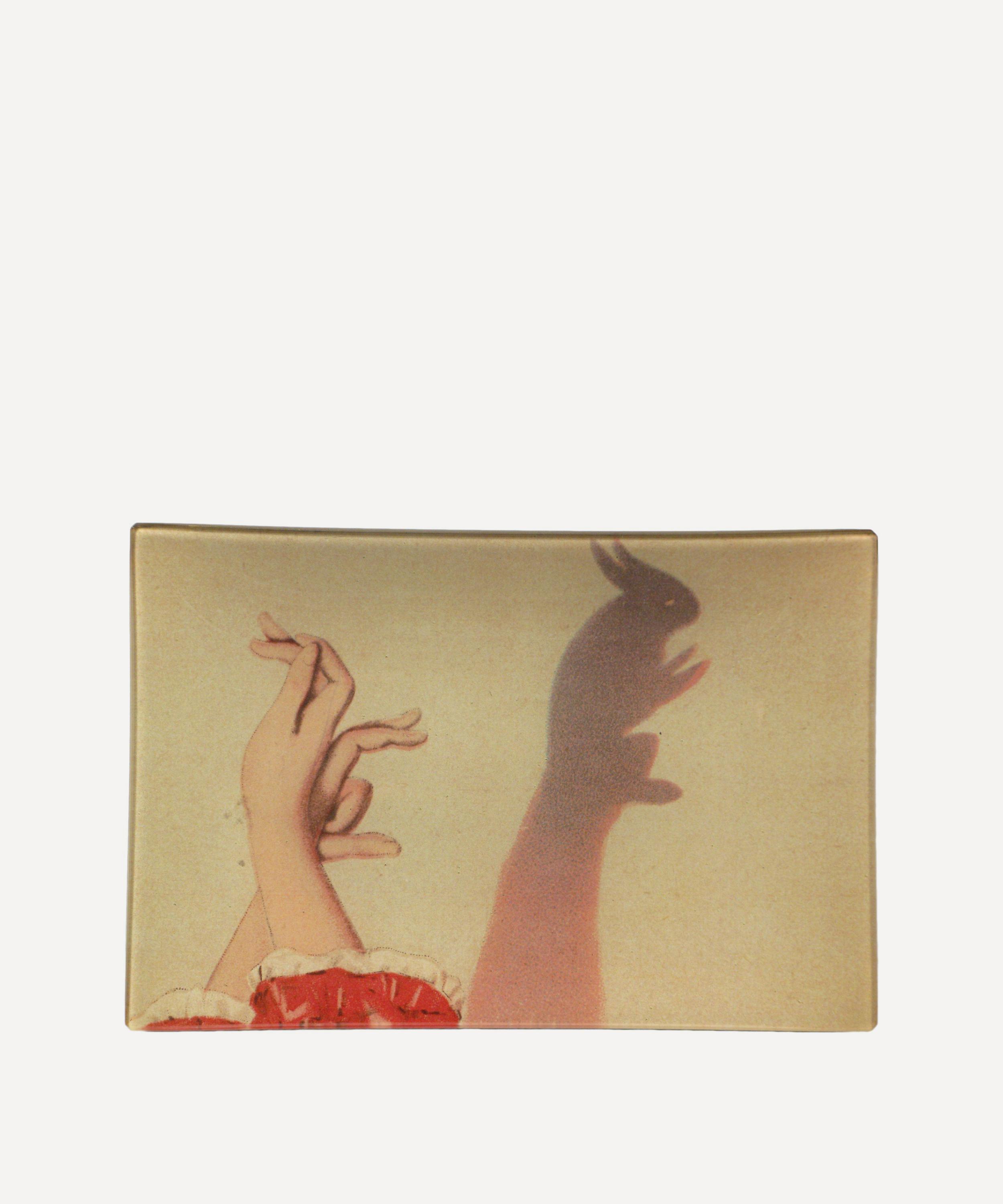 Crafted by hand in his New York studio, this tray features a artful shadow puppet design sourced from John Derian’s expansive collection of antique and vintage prints. Trained artisans cut and collage his designs before affixing them onto handblown glass – creating a charmingly unique and endlessly useful home accessory that is also ideal for gifting.