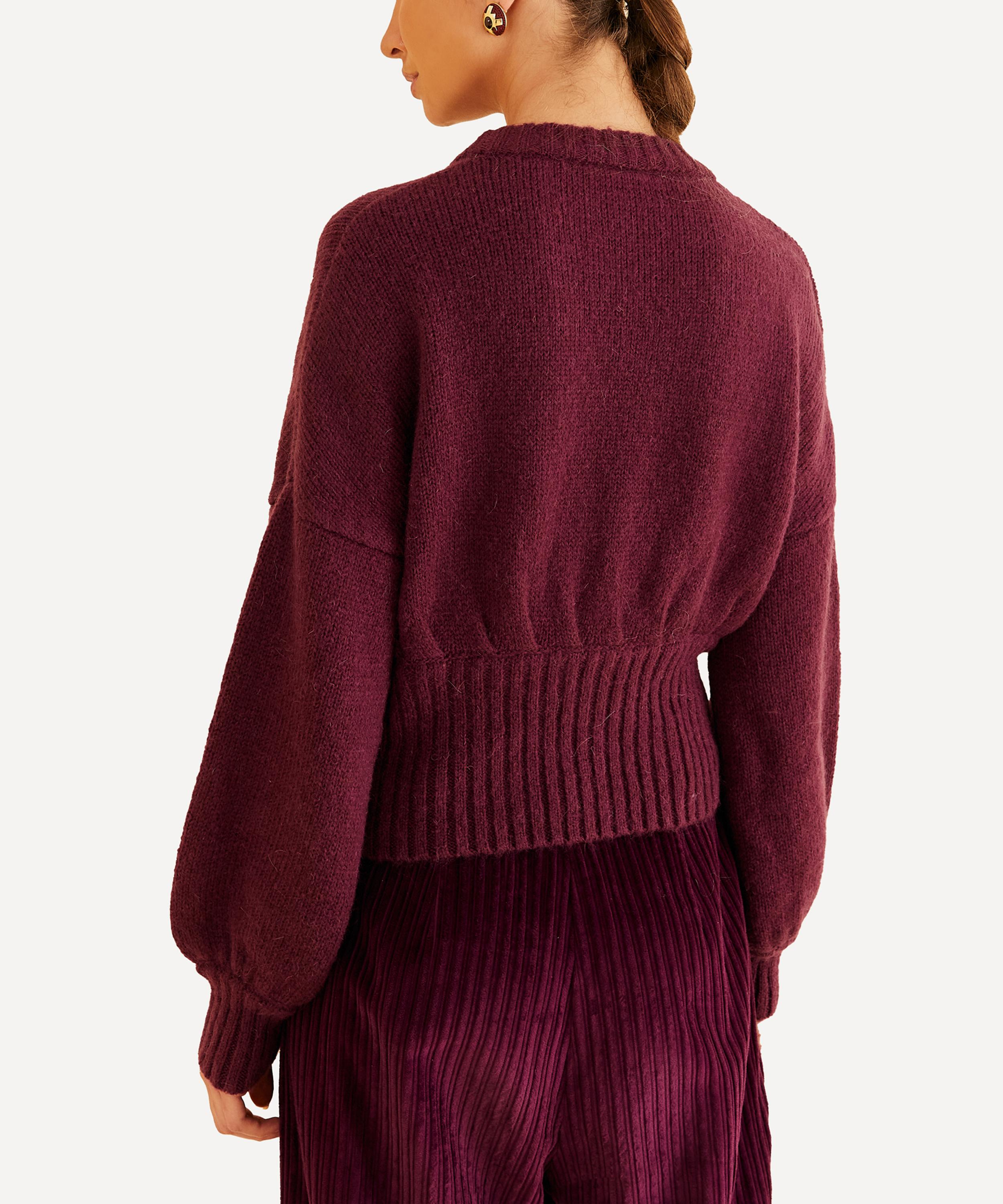 Slouchy and super-soft with its bubble-knit texture, this burgundy cardigan boasts a relaxed fit with dropped shoulders and voluminous bishop sleeves. A classic V-neck style with chunky ribbed trims, its buttoned placket is finished with decorative gold buttons.
