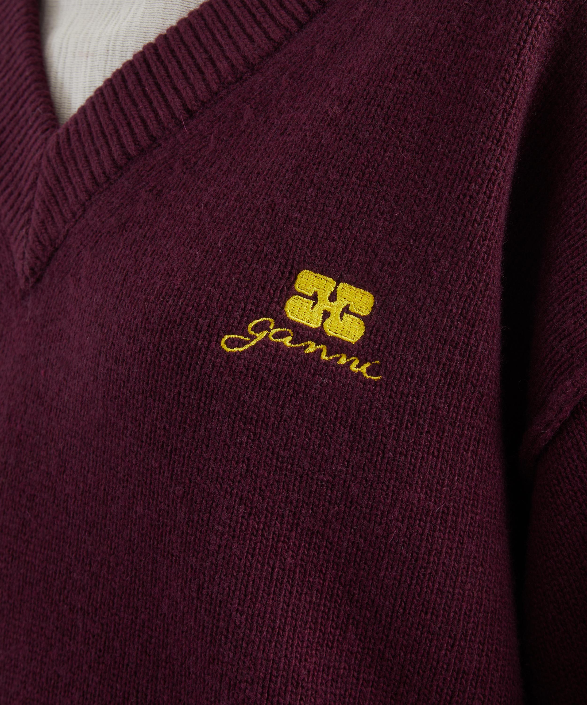 Finely knitted from a soft wool blend, this burgundy V-neck jumper features a relaxed fit with dropped shoulders, ribbed trims, and an embroidered GANNI logo at the chest for a signature touch.