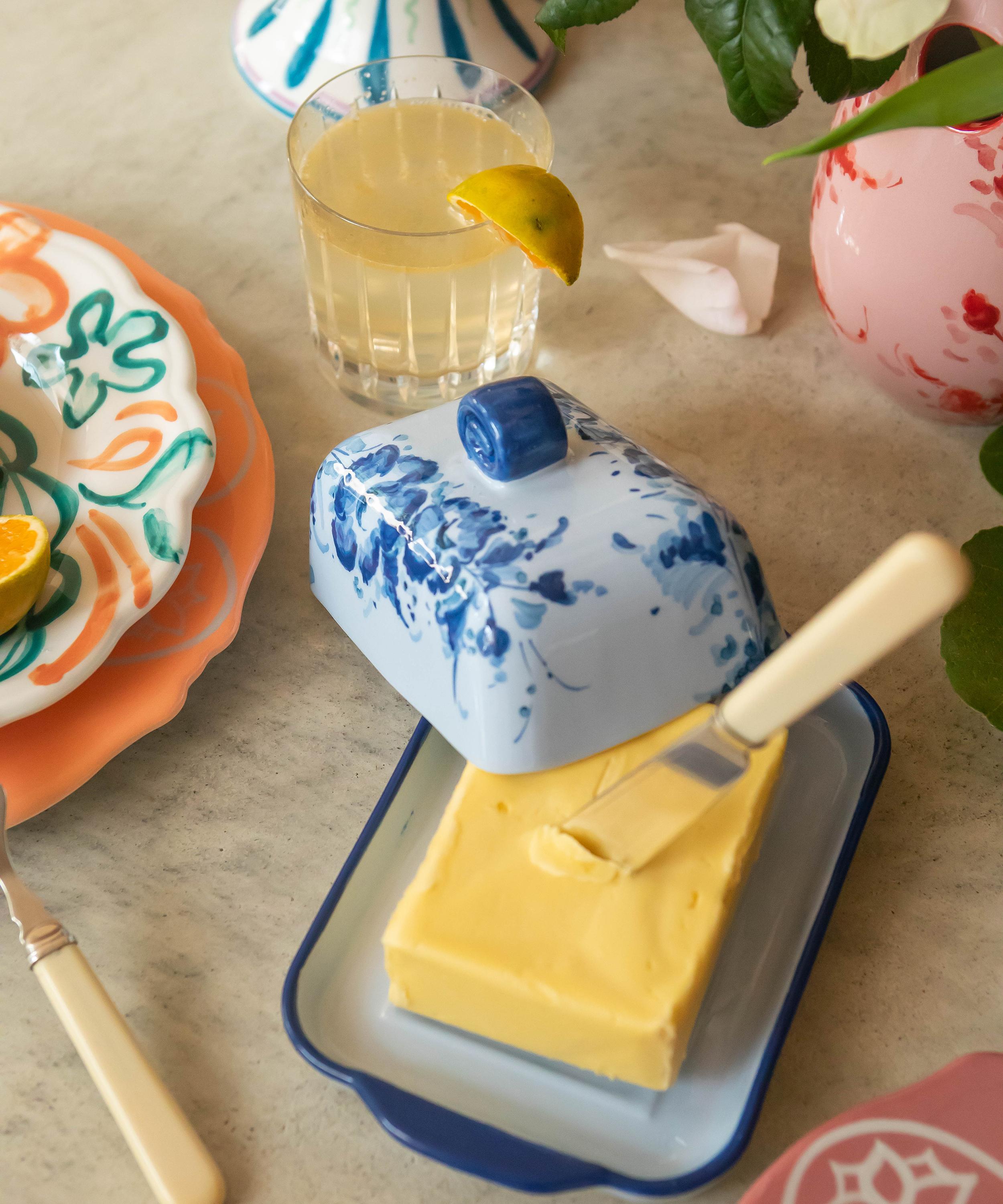 Practice the art of table-scaping with the Buttercup butter dish from Vaisselle – a nod to traditional ceramic artistry. Inspired by the journey between Mallorca and Pantelleria under the light of gentle sunshine, the design and silhouettes of this new collection allude to influences from chapels’ antique floorings and abstract graphic florals to wild fennel flowers against a fading blue sky.
