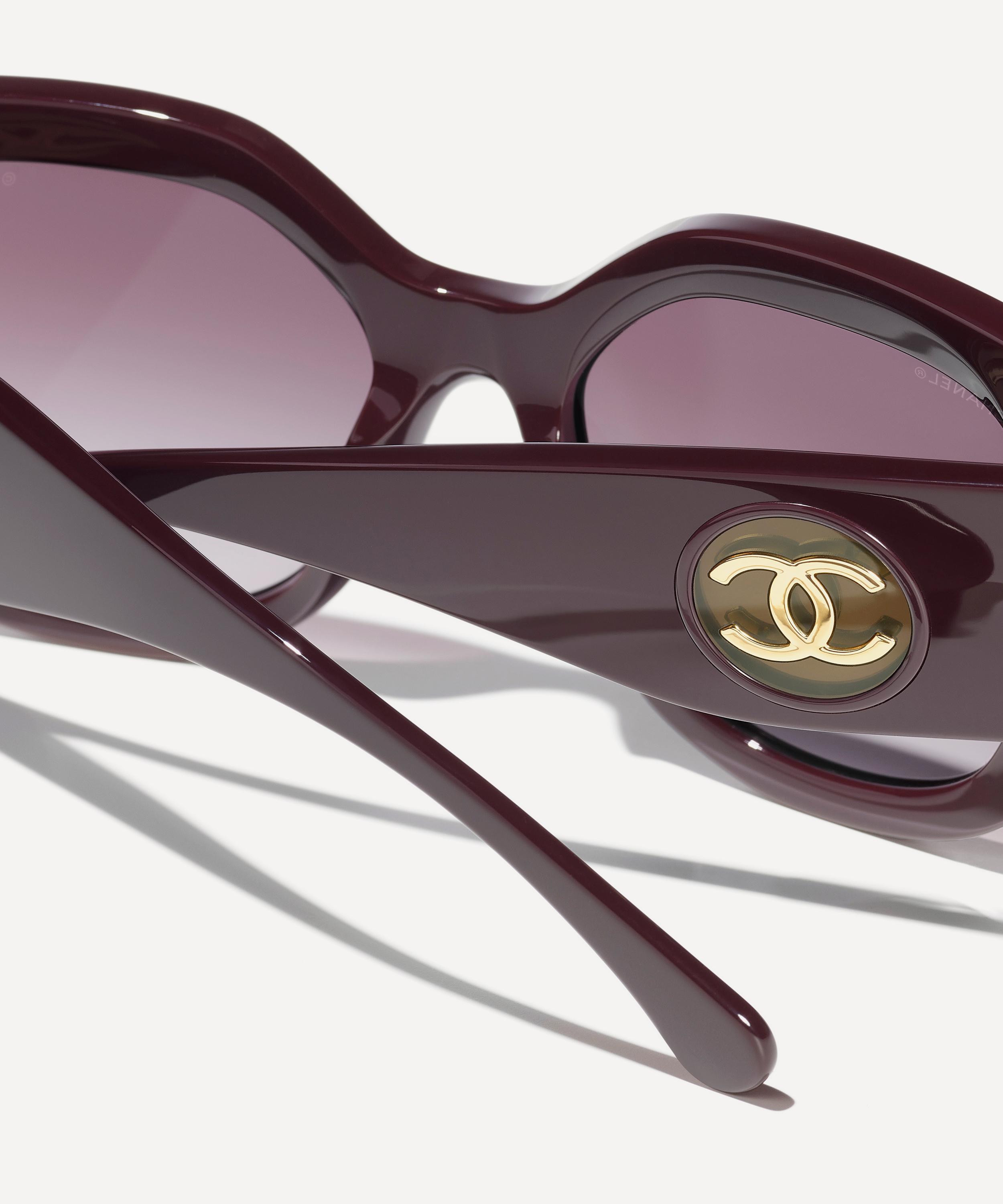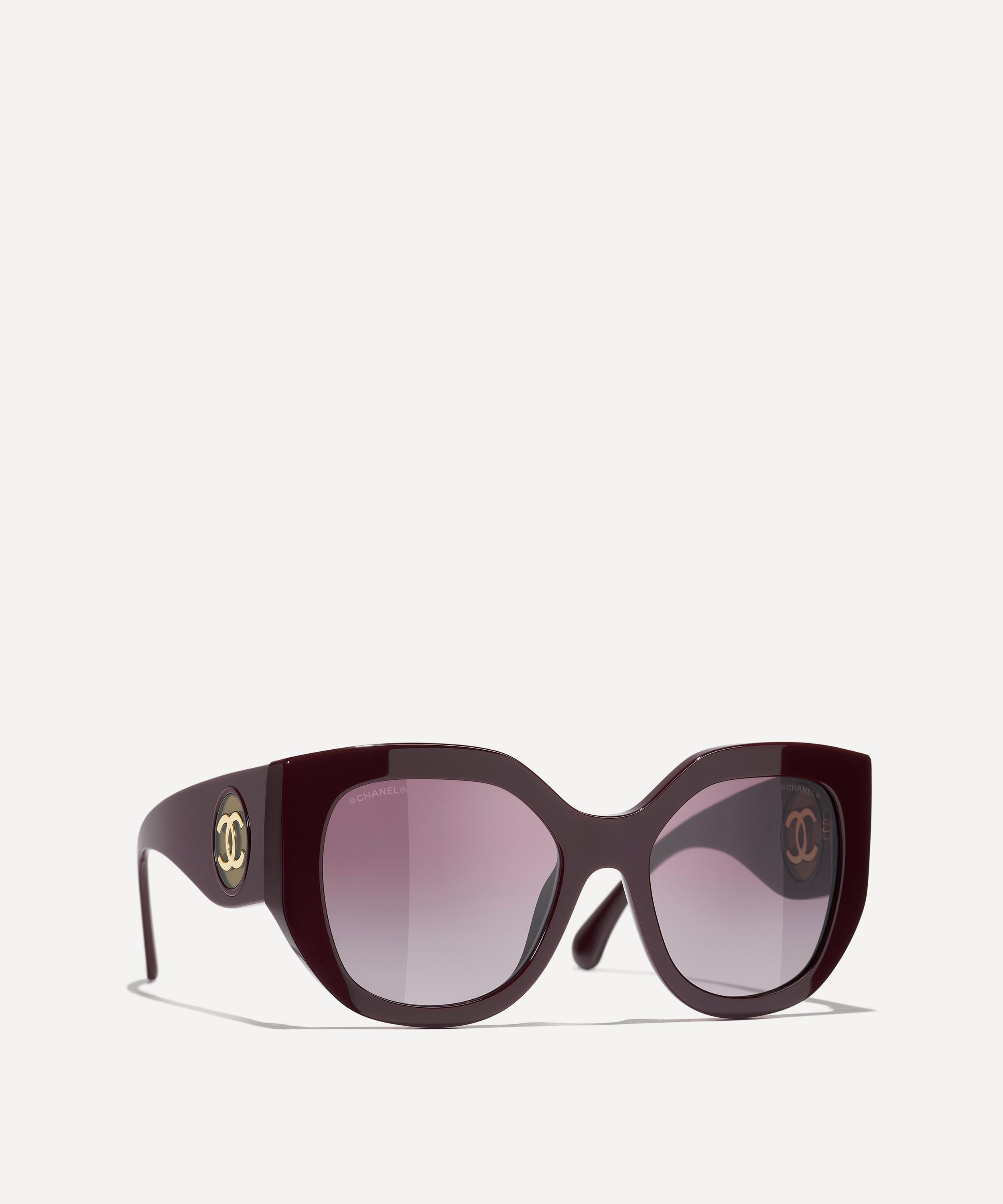 Add a touch of glamour to your everyday look with these butterfly sunglasses from CHANEL. Crafted from premium acetate, they feature a chunky, oversized silhouette with a comfortable saddle nose bridge and burgundy-tinted lenses to protect your eyes from UV light. Adorned with a CHANEL logo to the temples, style them with pulled-back hair to show off the details.