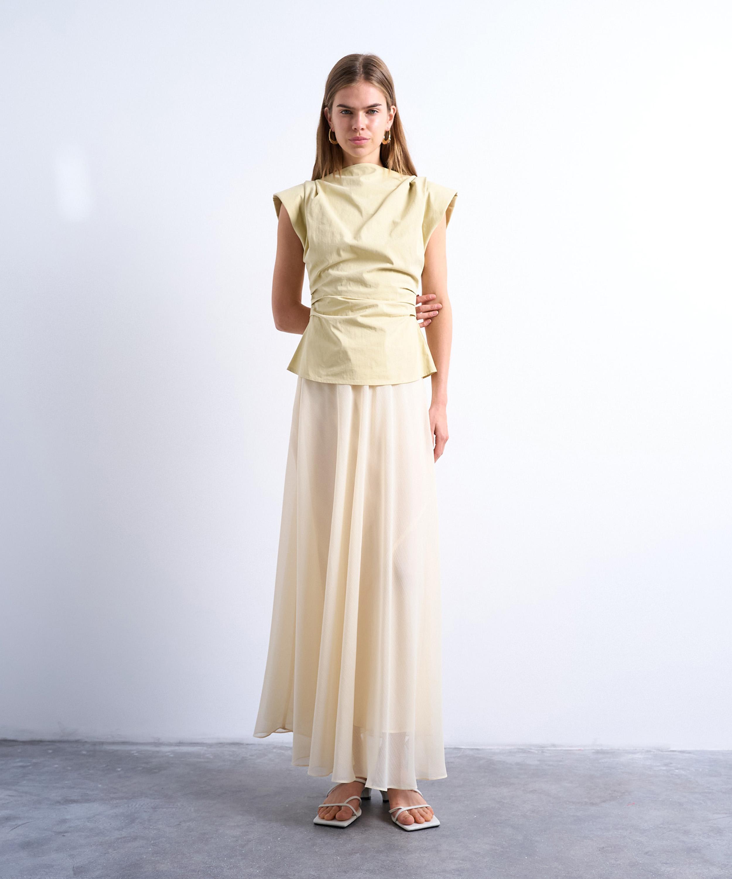 Crafted from a structured cotton blend fabric, this versatile top features a high neckline, cap sleeves, and a subtle fit-and-flare silhouette, enhanced by gathered detailing at the shoulders and waist for a flattering finish – complete with a concealed zip closure, it offers a sleek addition to your casual line-up.