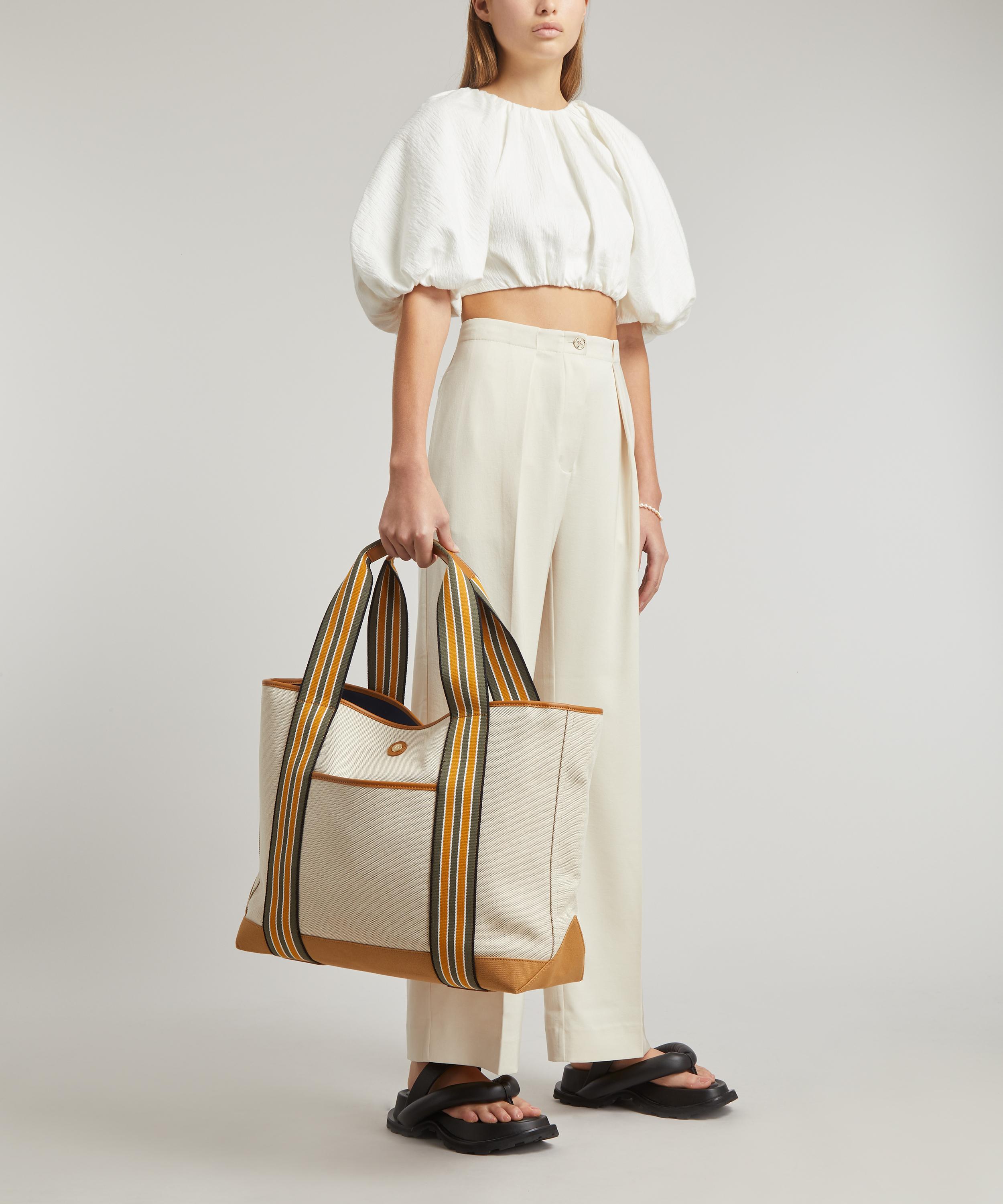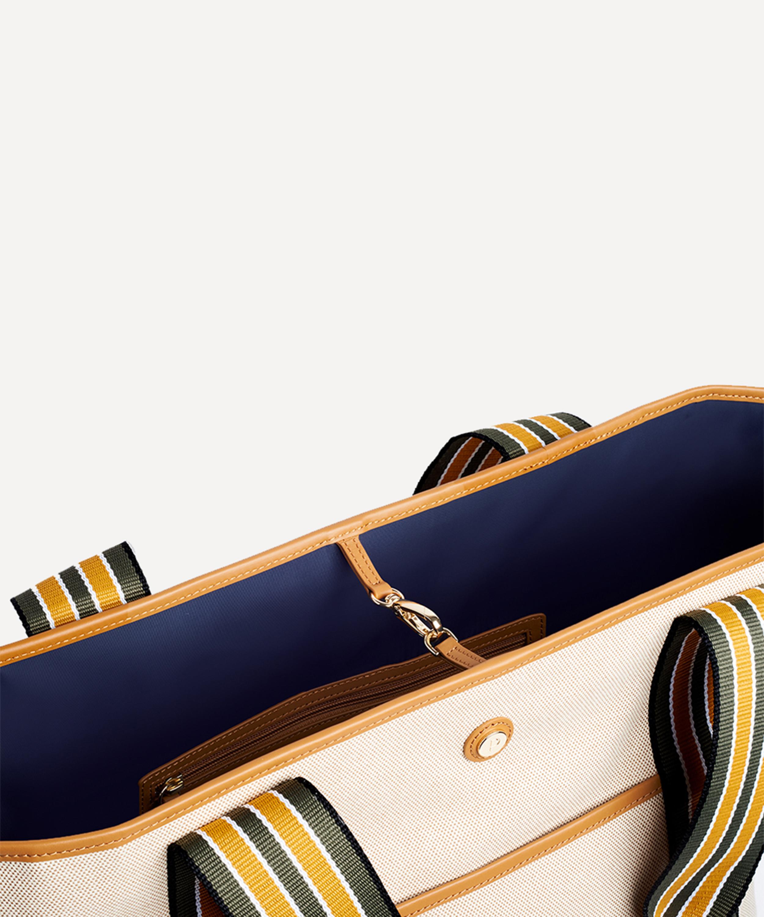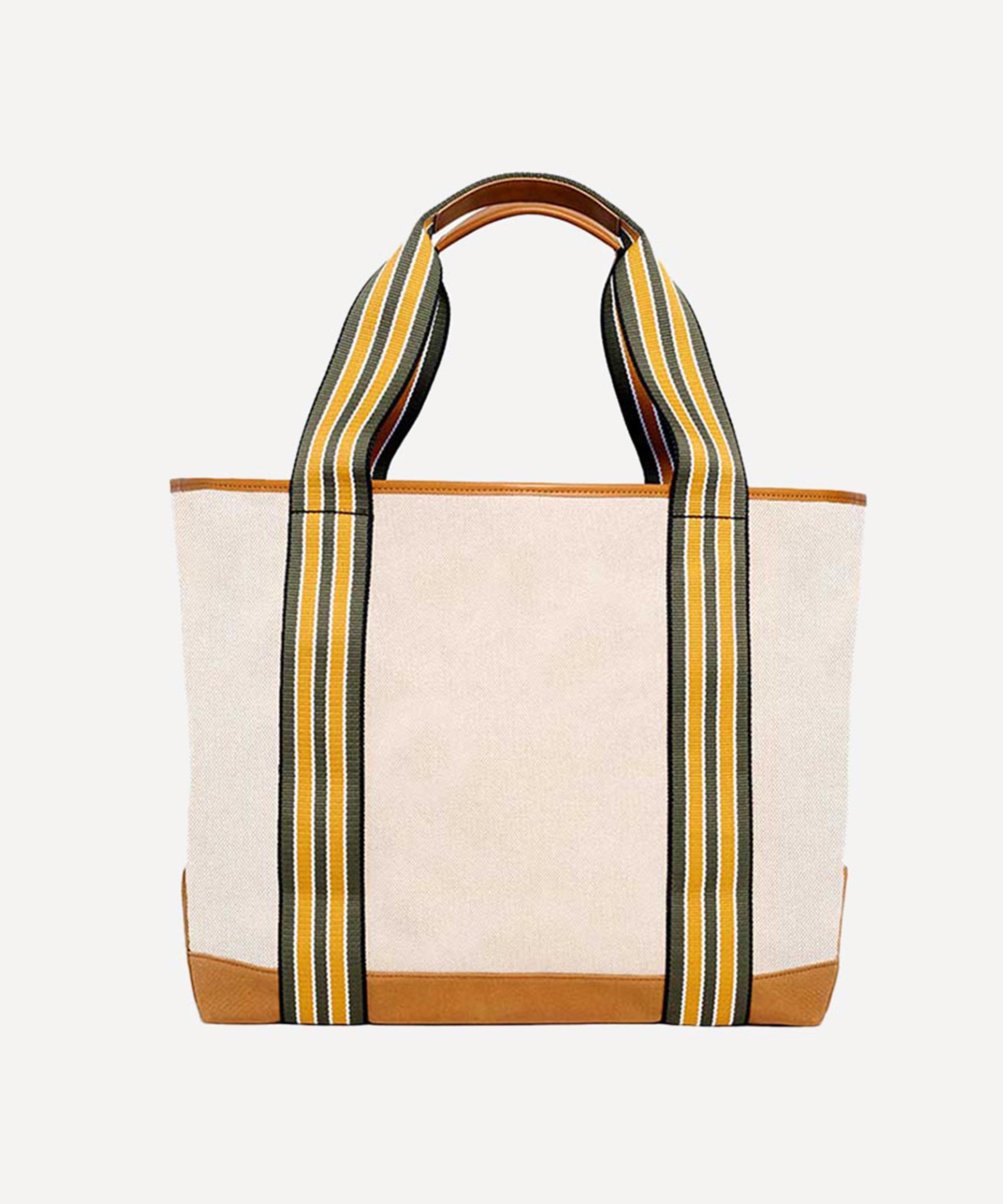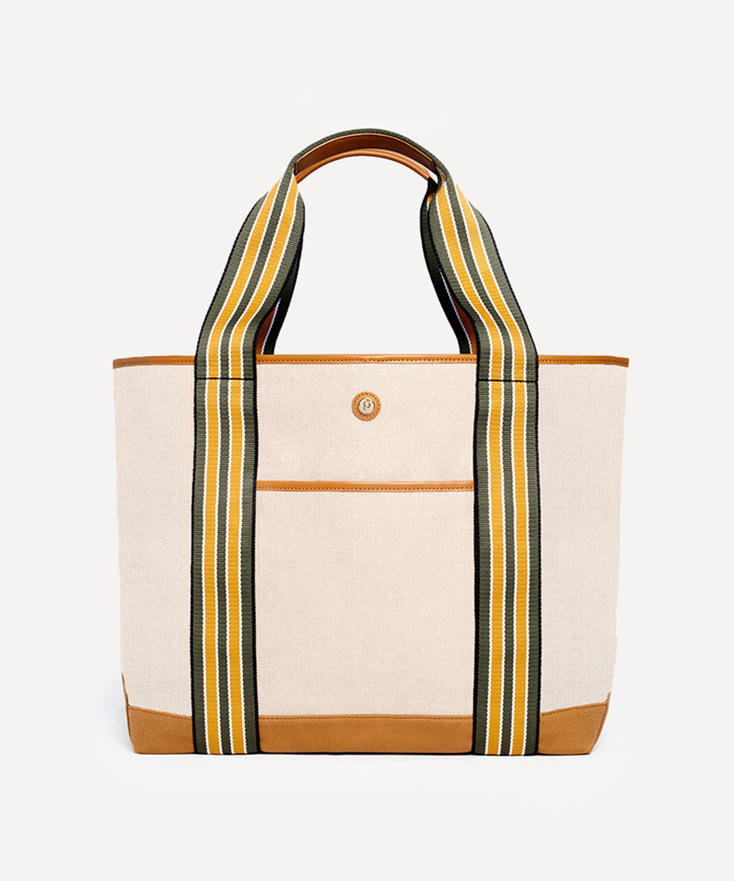 A timeless style crafted from long-lasting, innovative recycled and eco-friendly materials, the Cabana tote bag boasts recycled vegan leather details and an Ecocraft canvas exterior made from 30 upcycled plastic bottles. Elegant and extraordinarily functional, this water-resistant and ultra-lightweight carry-all features an easy access front pocket, interior slip and zipped pockets with a hook-and-eye top closure. Featuring a sturdy leather base with matching tan trims, its complete with statement, yellow and green ‘Shandy’ striped handles. Cradle this piece over the shoulder or carry it in one hand for effortlessly sophisticated style no matter where your travels take you.