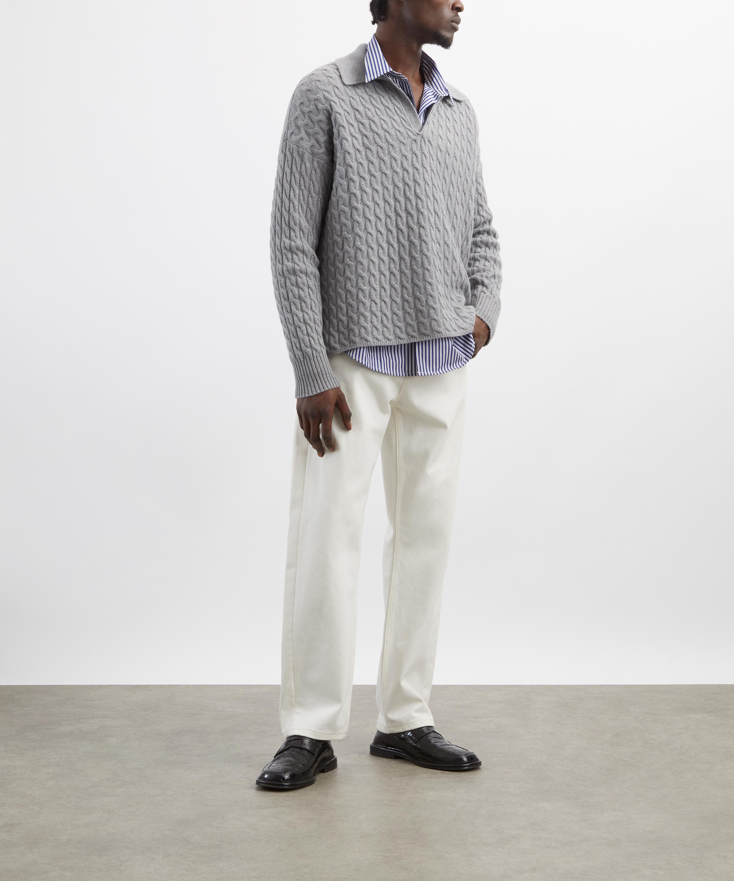 The classic polo silhouette is complete with a deep v-neck, spread collar and drop shoulders. Layer on top of a tailored shirt for more formal social gatherings.