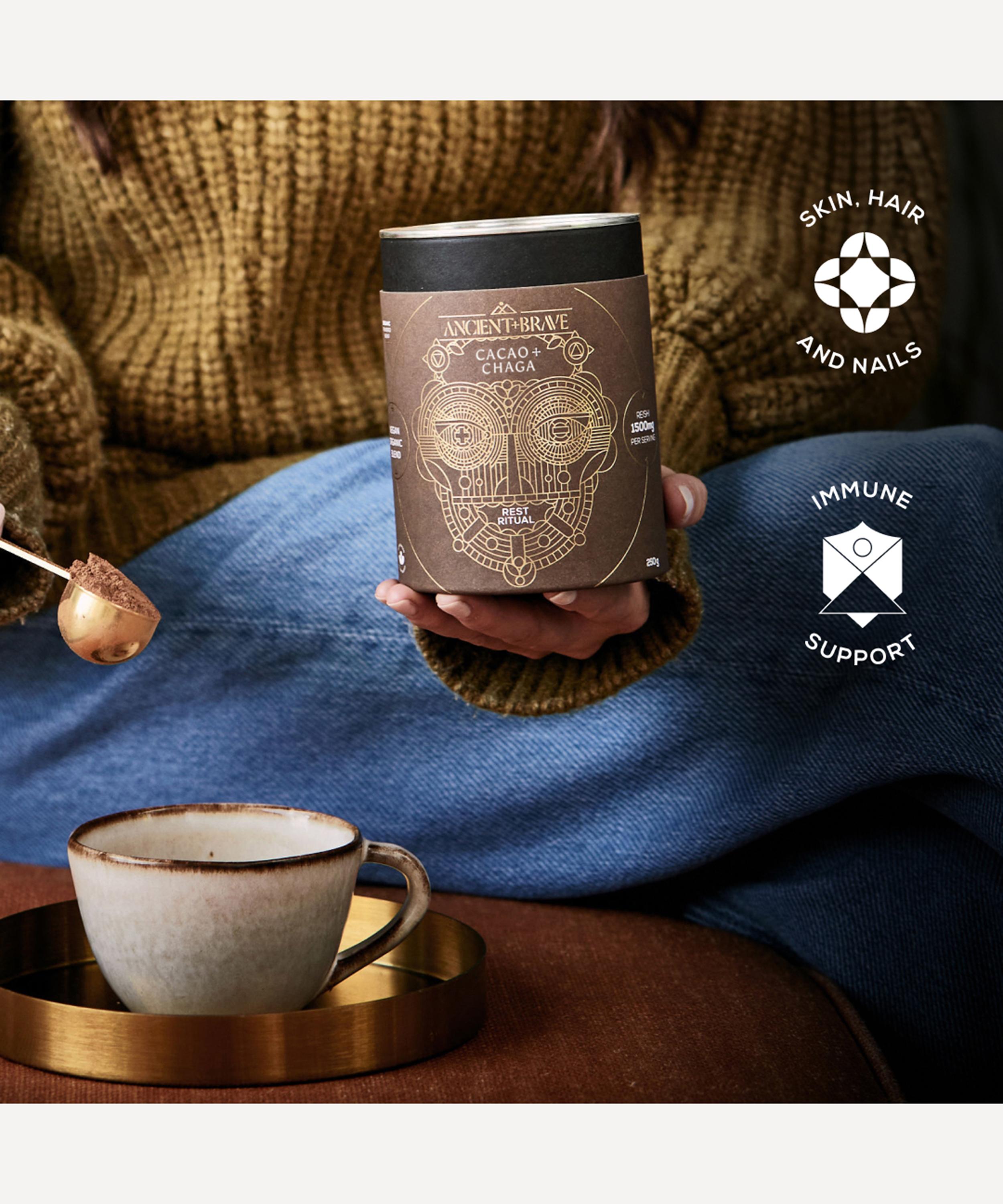Release tension and treat your body with Ancient + Brave’s Cacao + Chaga Tub, containing a powder supplement designed to regenerate the body from within.