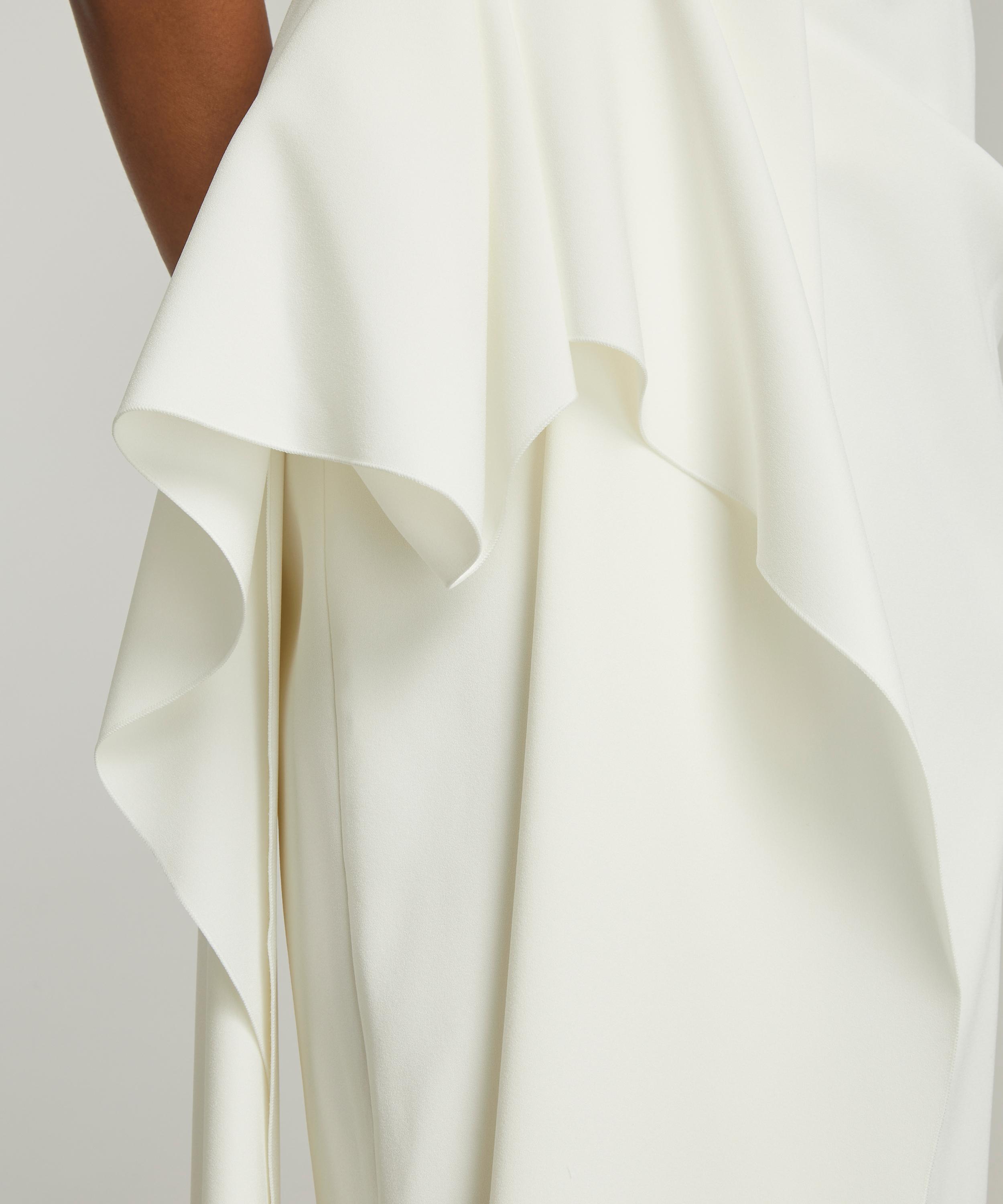Crafted from ivory crepe, this striking dress is sure to send heads turning on your special day with its beautifully constructed cowl neckline and fitted silhouette, which gathers at the waistline to form a draped, ruffled appliqué along the side.