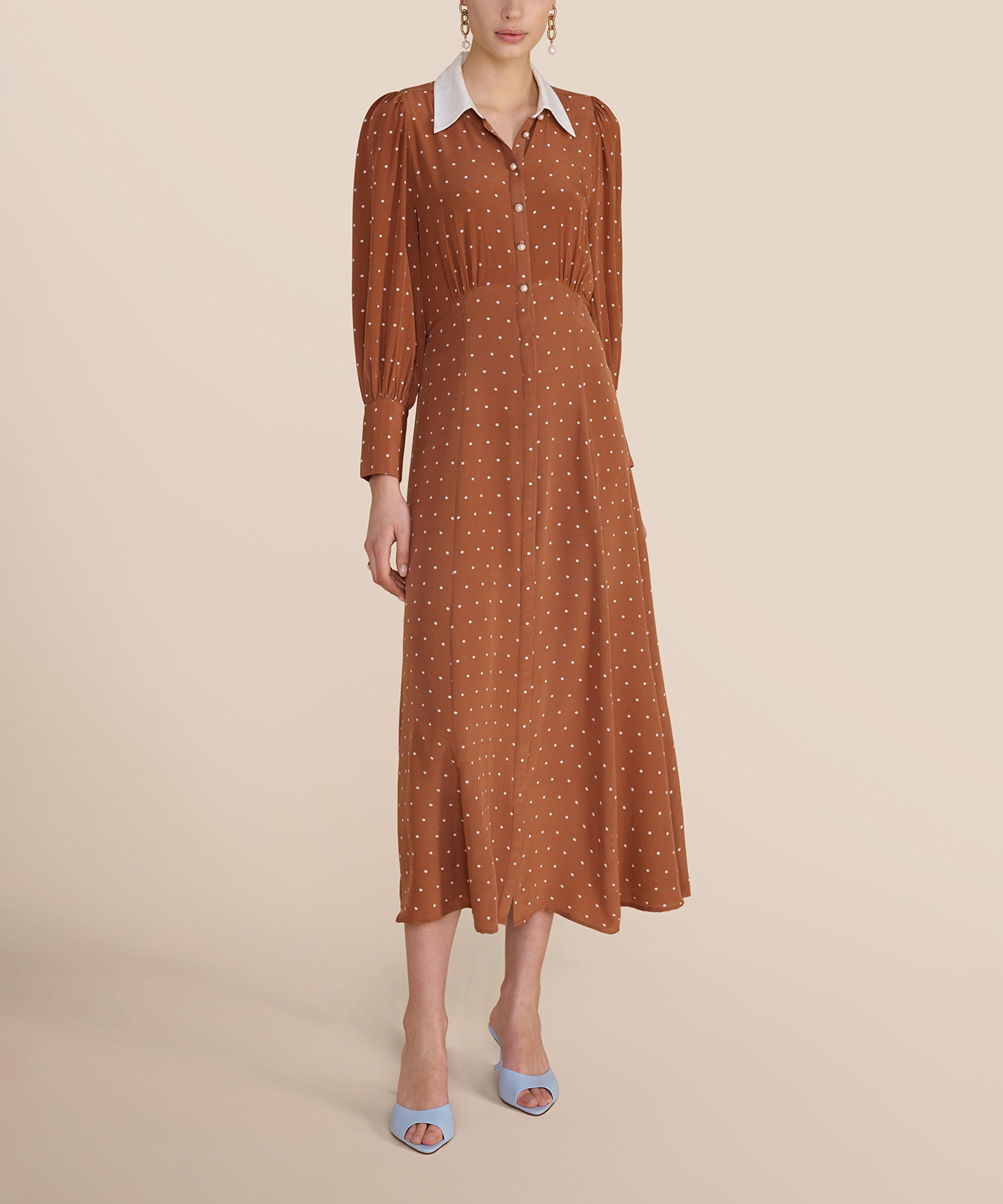 A much-loved silhouette, the Calla returns this season in a timeless tan-and-white polka dot print. Crafted from silk crepe de chine, this midi shirt dress features a crisp white collar and pearl button detailing - an elegant choice for weddings and special occasions.