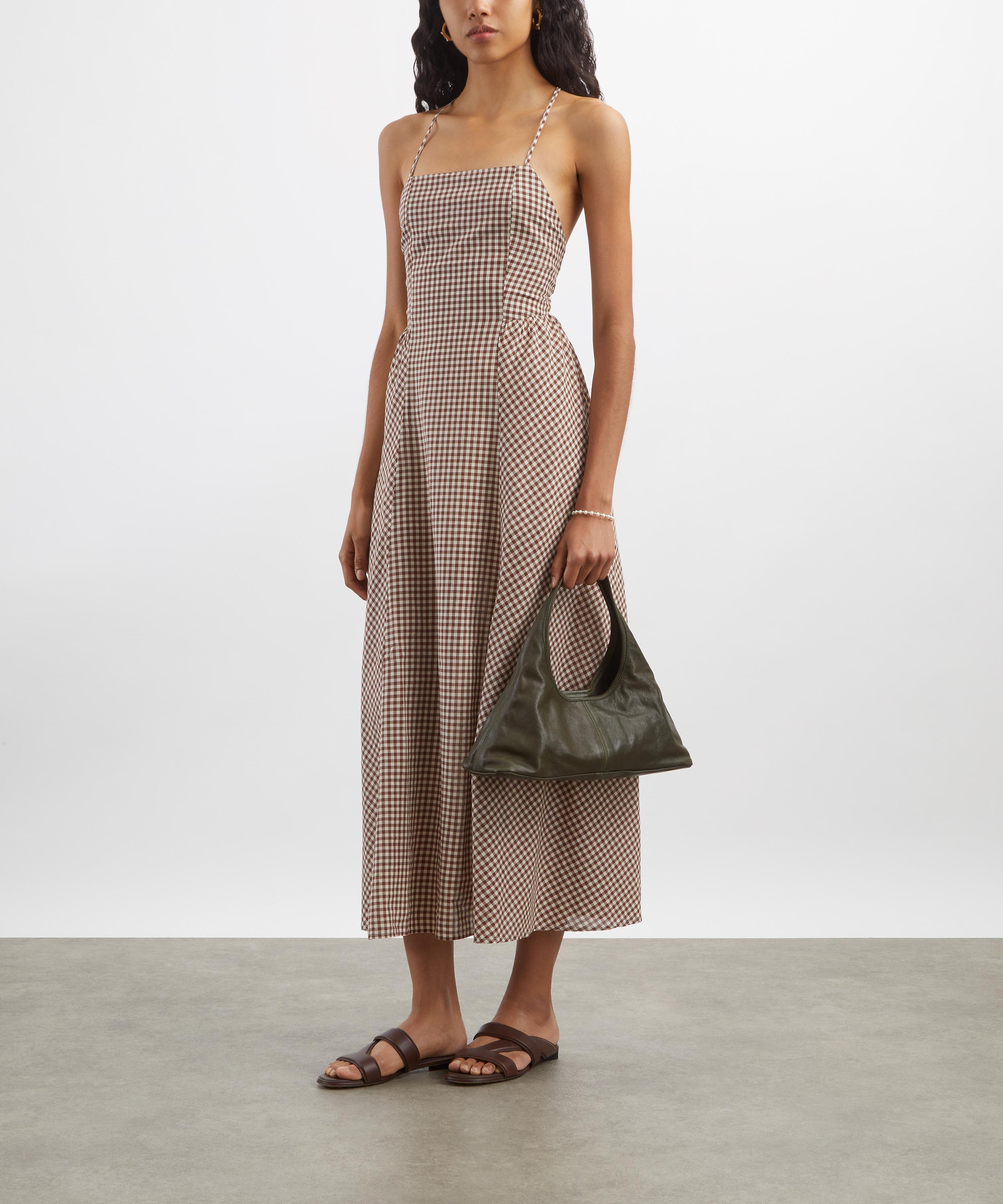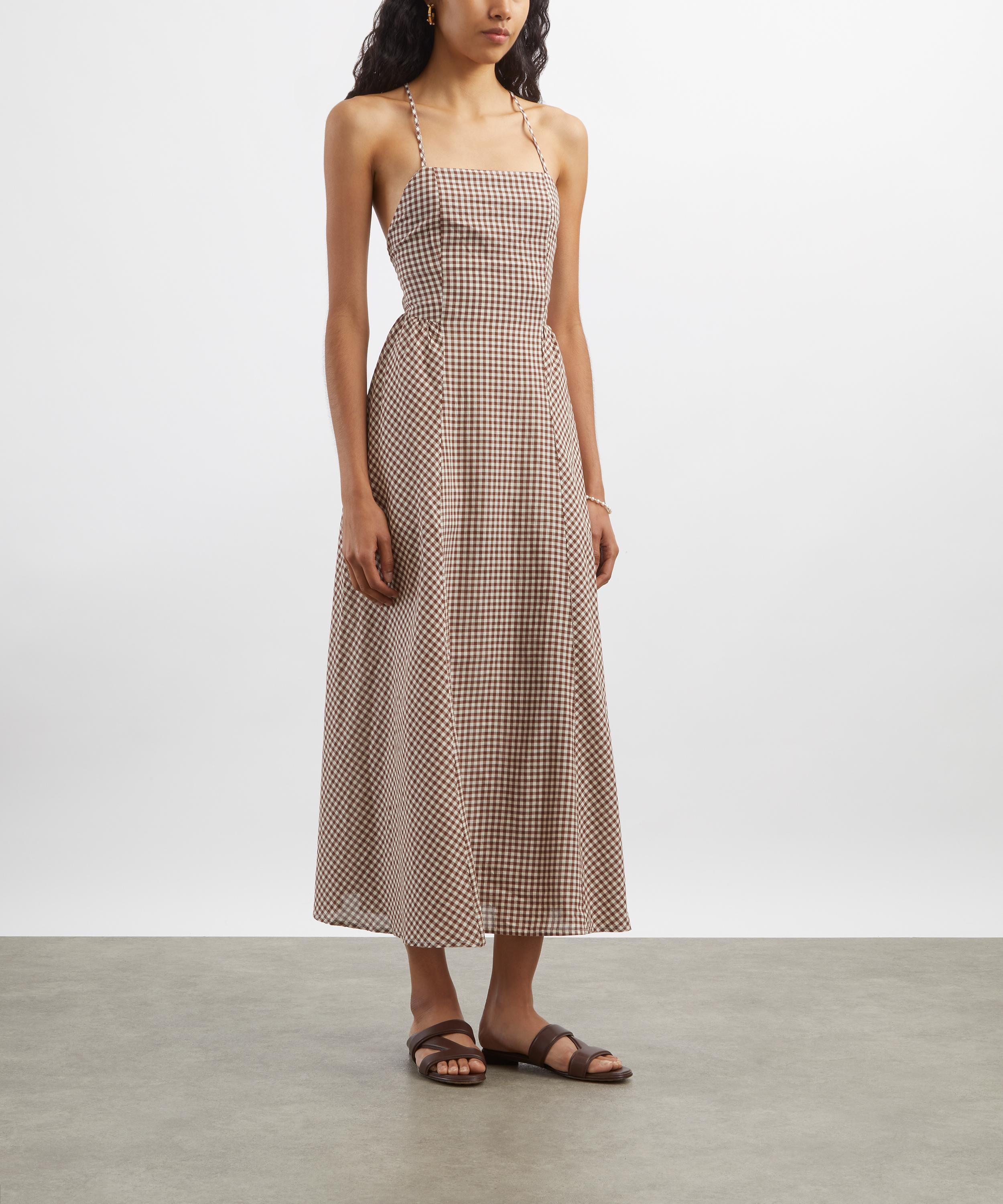 Cut from lightweight cotton in a charming brown and cream gingham, the Callie dress exudes effortless femininity with its graceful square neckline, fitted bodice, and flowing full skirt. An open back with adjustable crossover straps adds a playful touch to its elegant silhouette.