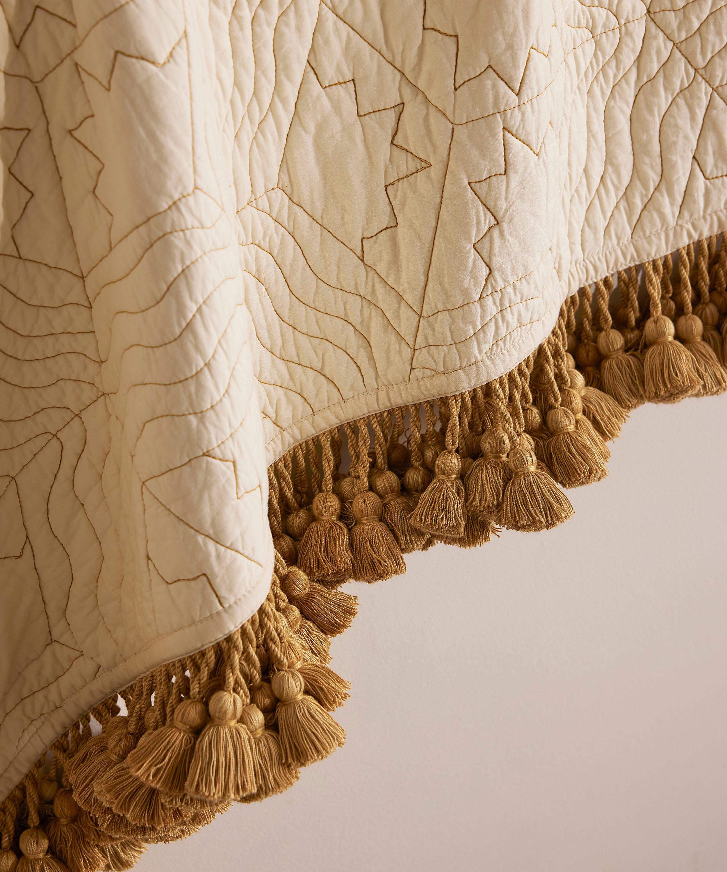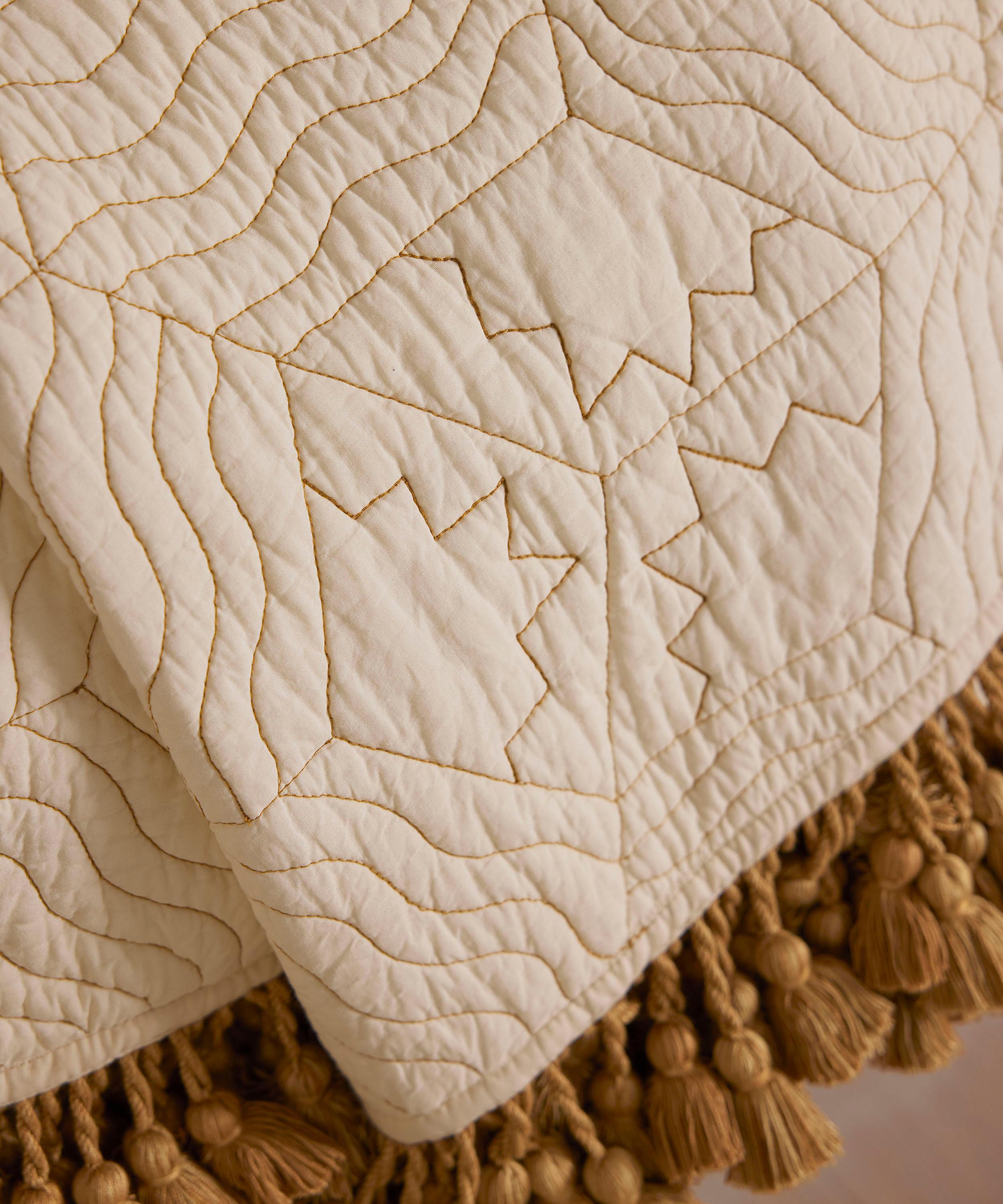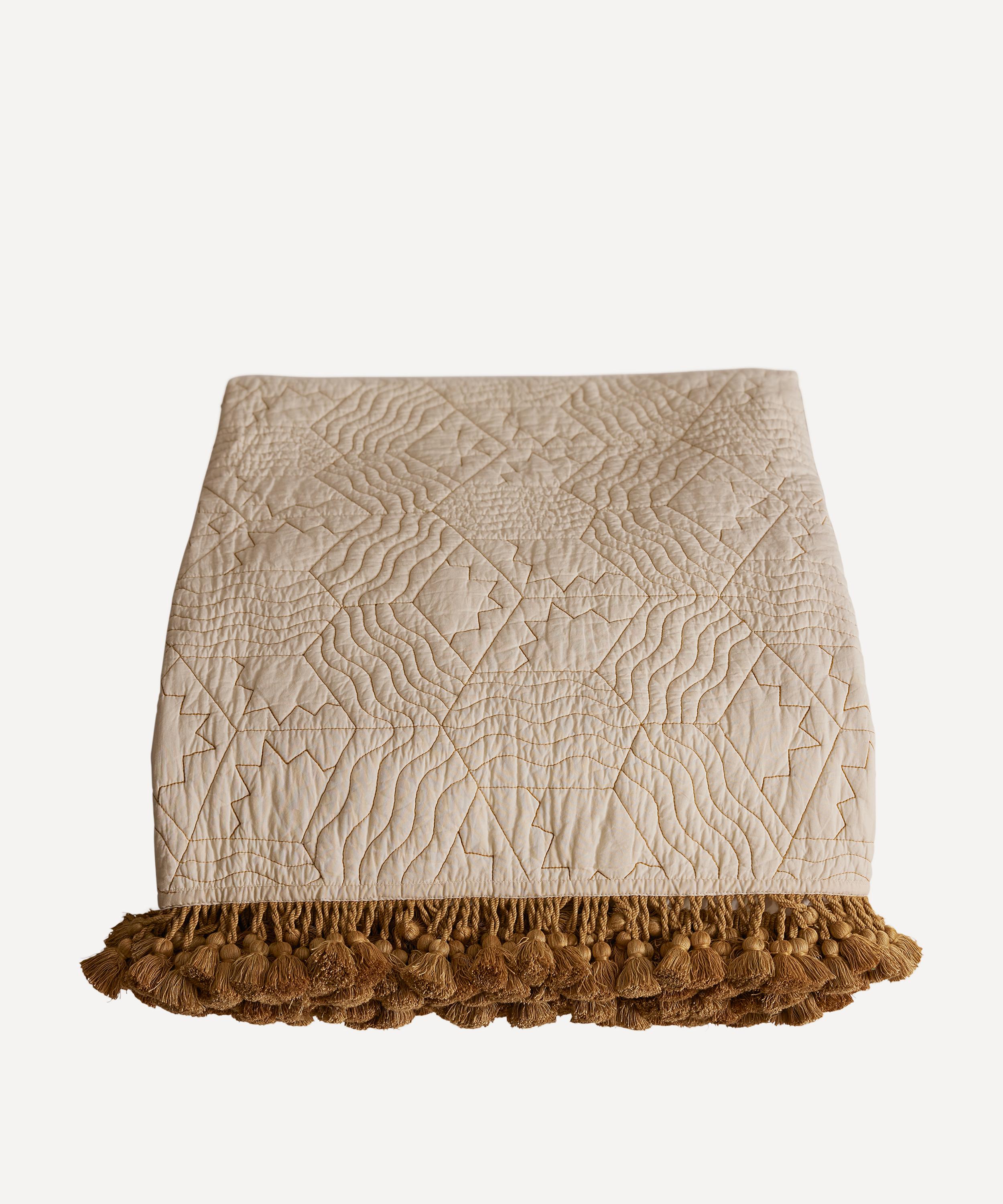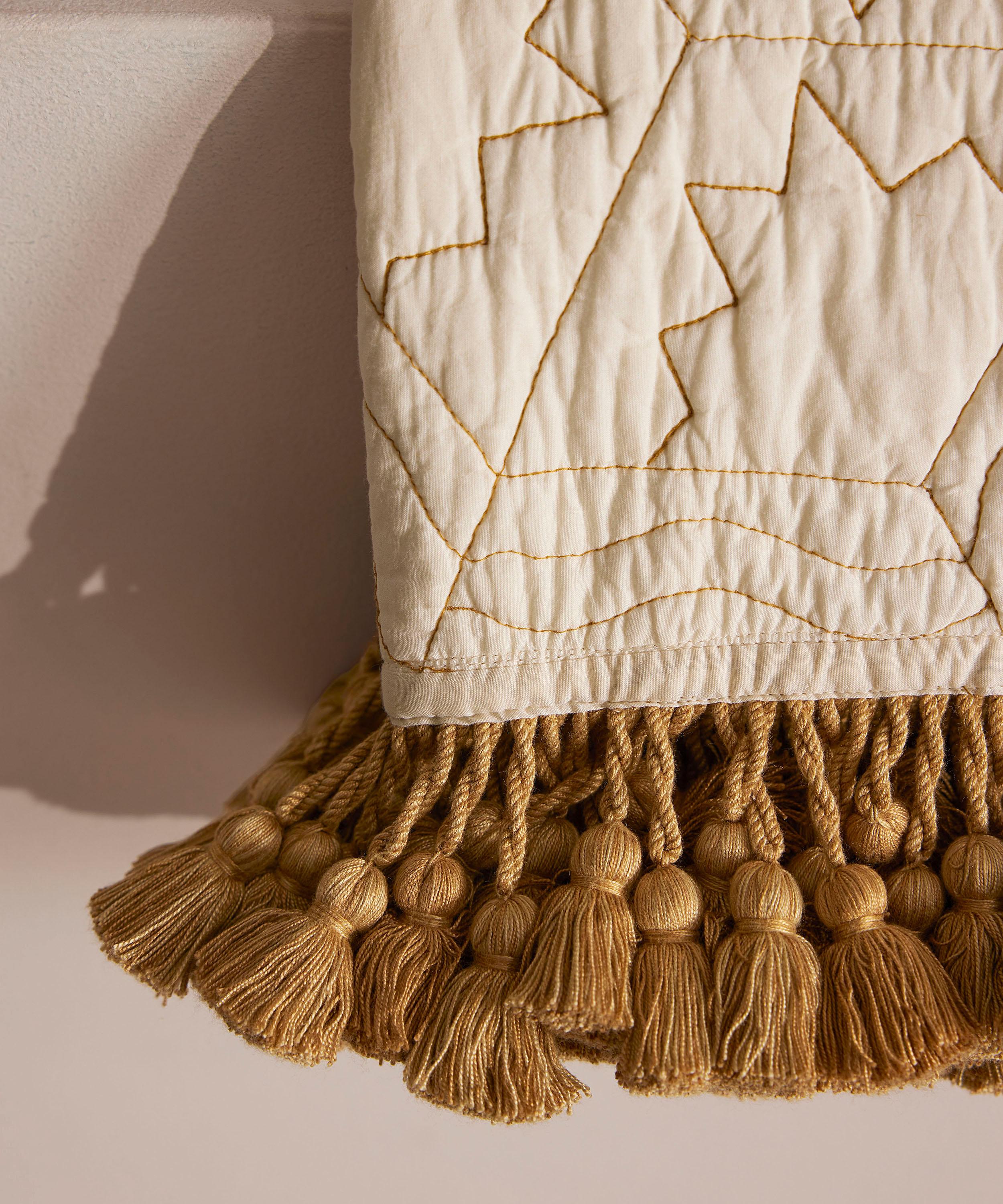 This geometric embroidered throw has been hand-made in India by skilled artisans who combine cotton and viscose to create a satisfyingly weighty feel. Complete with an ochre fringed trim for added texture, set the tone of any living space by pairing with a thick cushion or two on chilly evenings by the fire, or layer over crisp bedding to create a calming sanctuary for sleep.