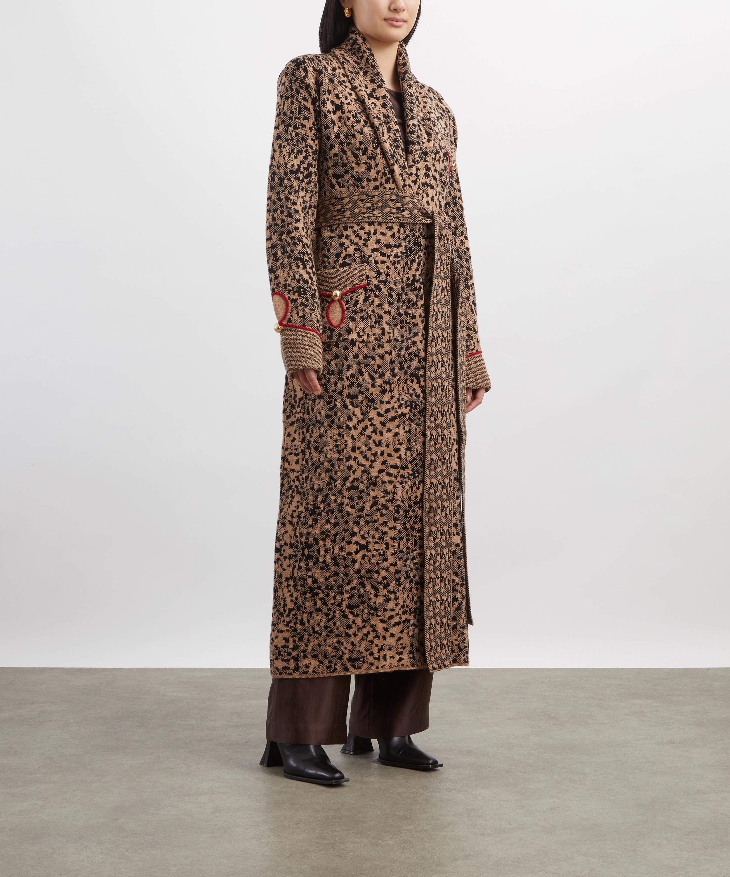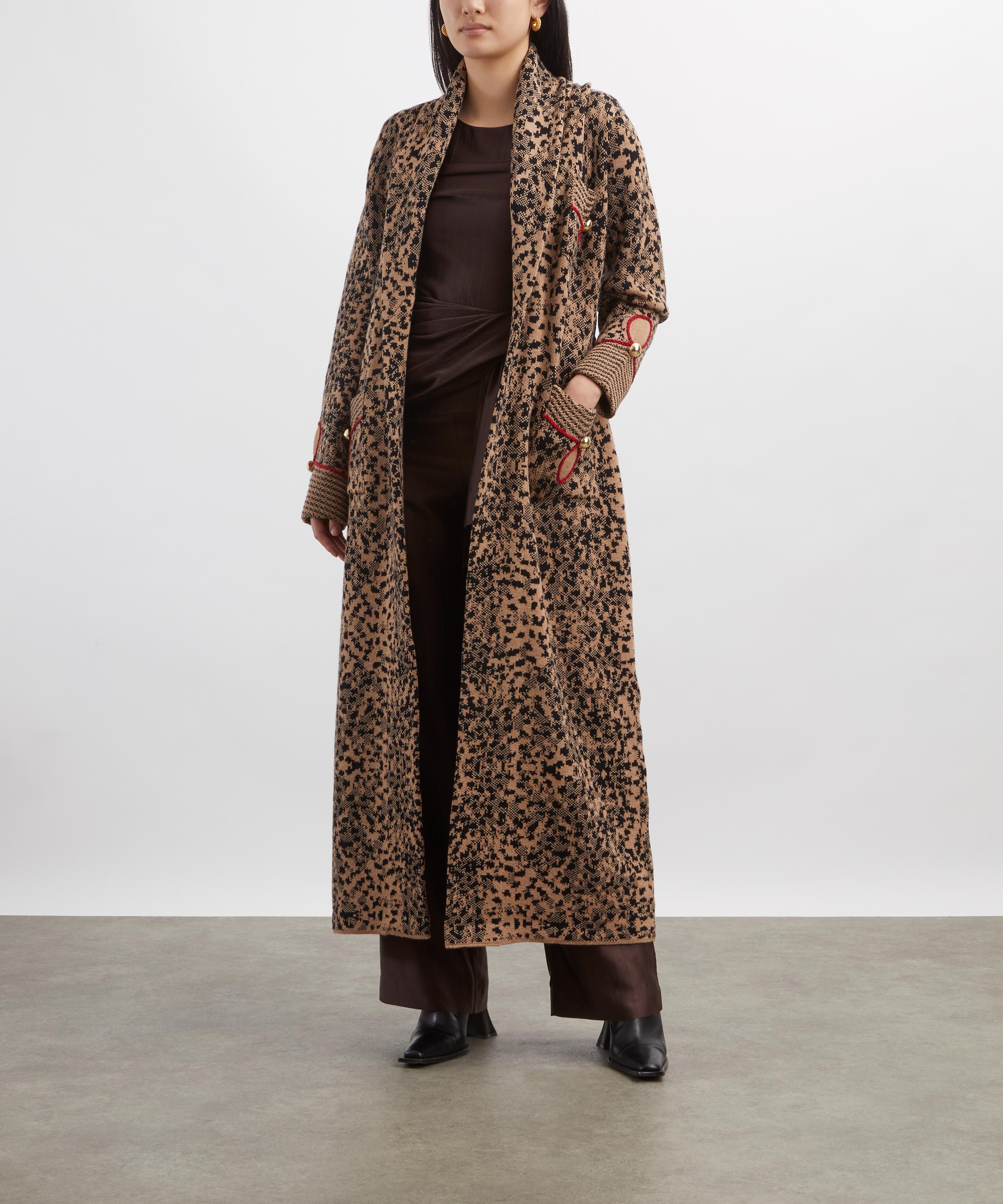 Meticulously knitted from pure Merino wool, each Hari coat takes seven hours to complete. Returning for the new season in a bold cheetah print, the longline, robe-style silhouette is designed to be worn belted with an oversized, wide knitted belt. Decorative gold dome buttons and contrast piping with hand-finished red detailing elevate both day and evening looks.