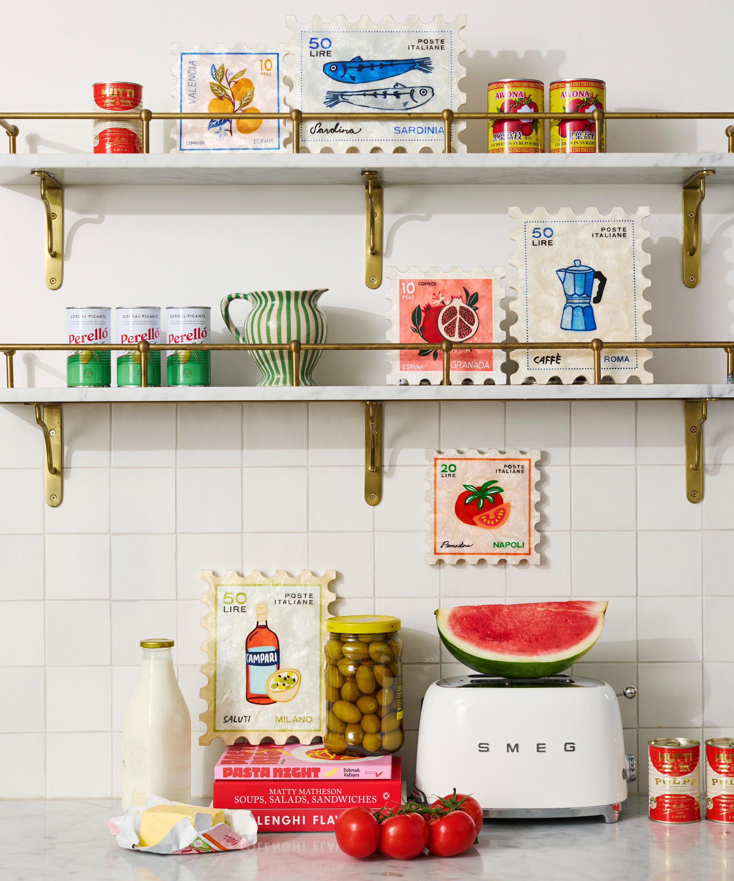 An ode to the spirit of the Italian aperitivo hour, the artwork is expertly hand-painted on a stamp-shaped Capiz shell tile. Ideal for thoughtful gifting, it brings the brand’s unique mix of colour, craftsmanship and warmth to your kitchen space.