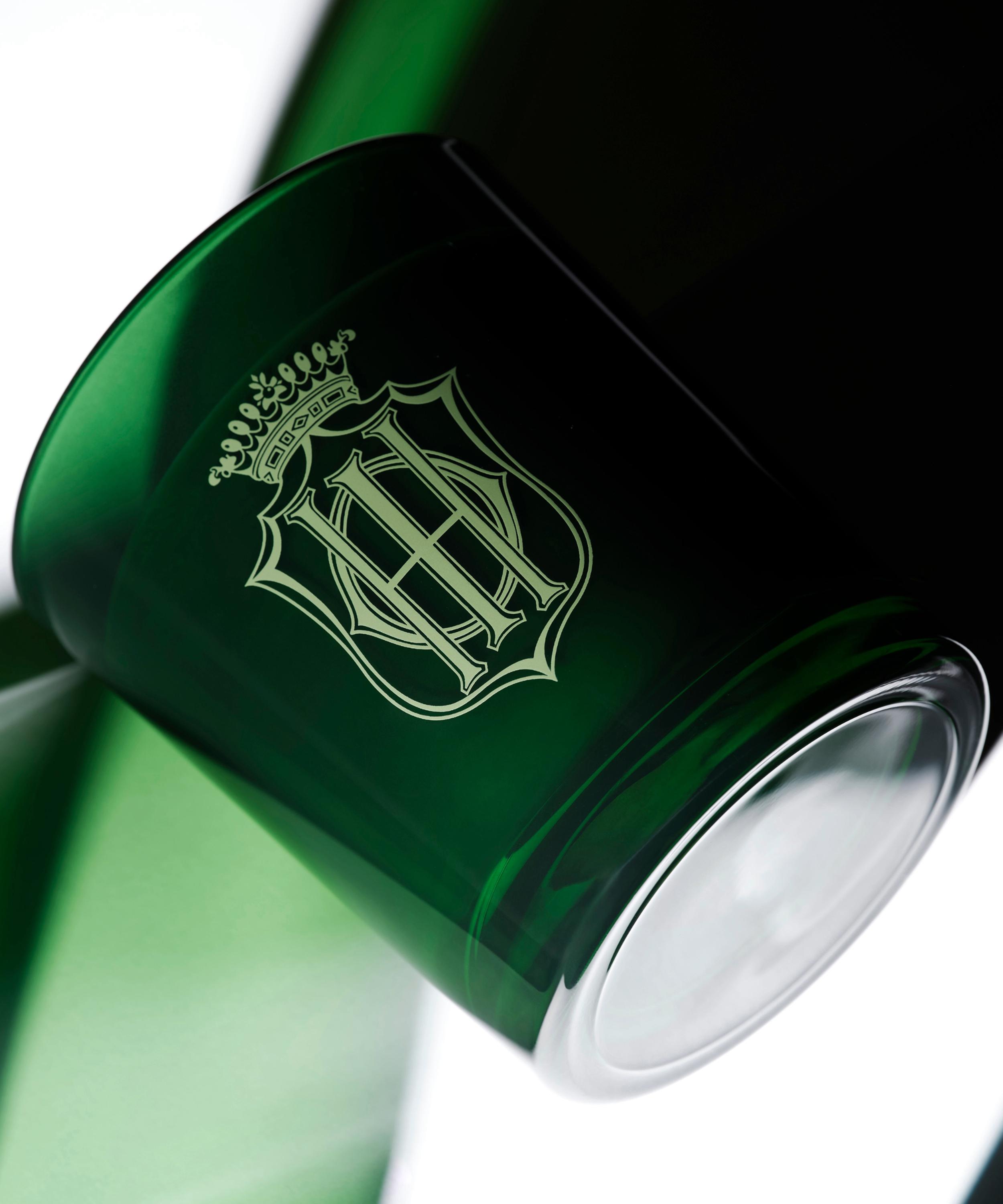 • Housed in a deep green glass vessel