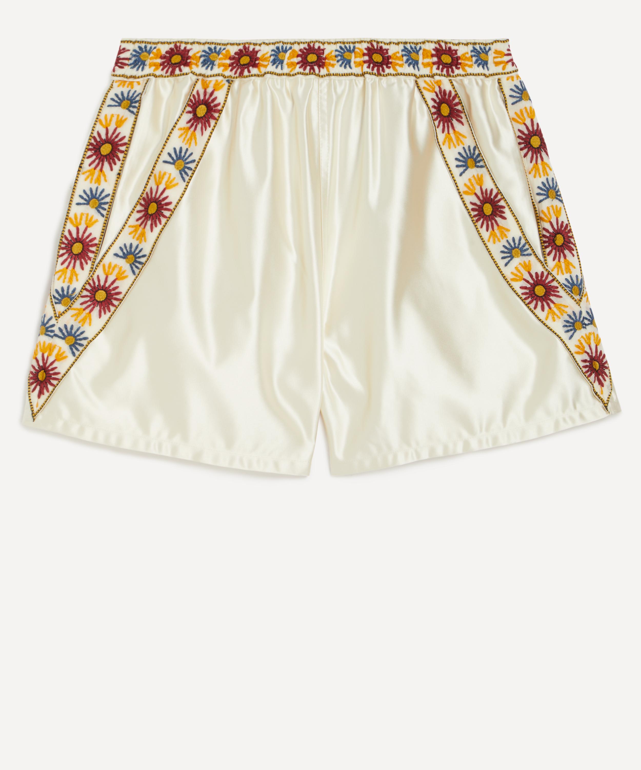 Inspired by a 1960s organza collar, these shorts are crafted from a lightweight satin weave. Featuring an elasticated waistband, they are beautifully accented with embroidered floral trims for a delicate, vintage-inspired touch.