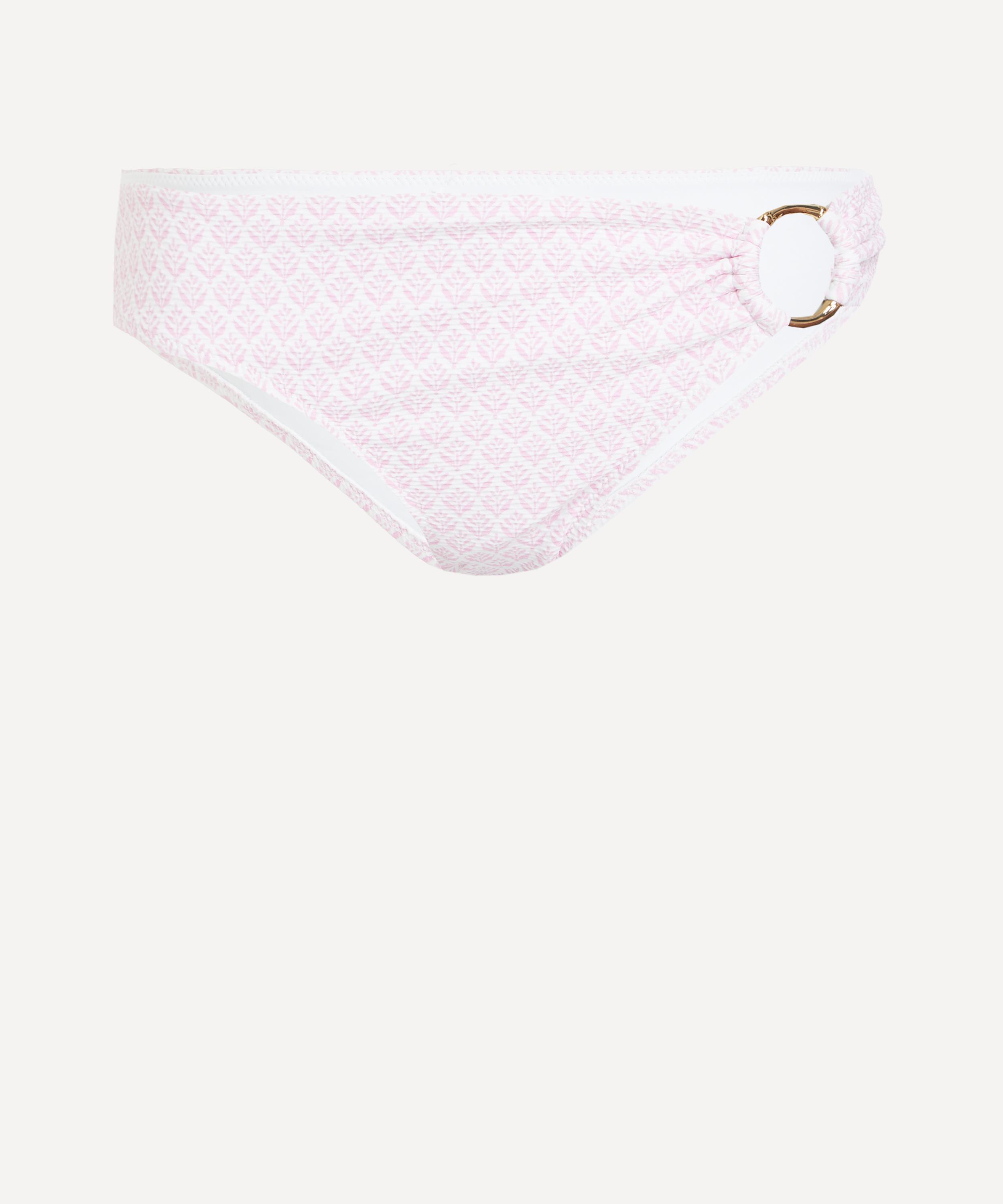 Crafted from textured honeycomb fabric and adorned with a pink Provence block print, the Cap Ferrat Ring Hipster Bottoms bring a fresh take on timeless elegance. Featuring a signature gold ring detail on one side, they offer a classic hipster silhouette with slightly lower coverage for a modern finish.