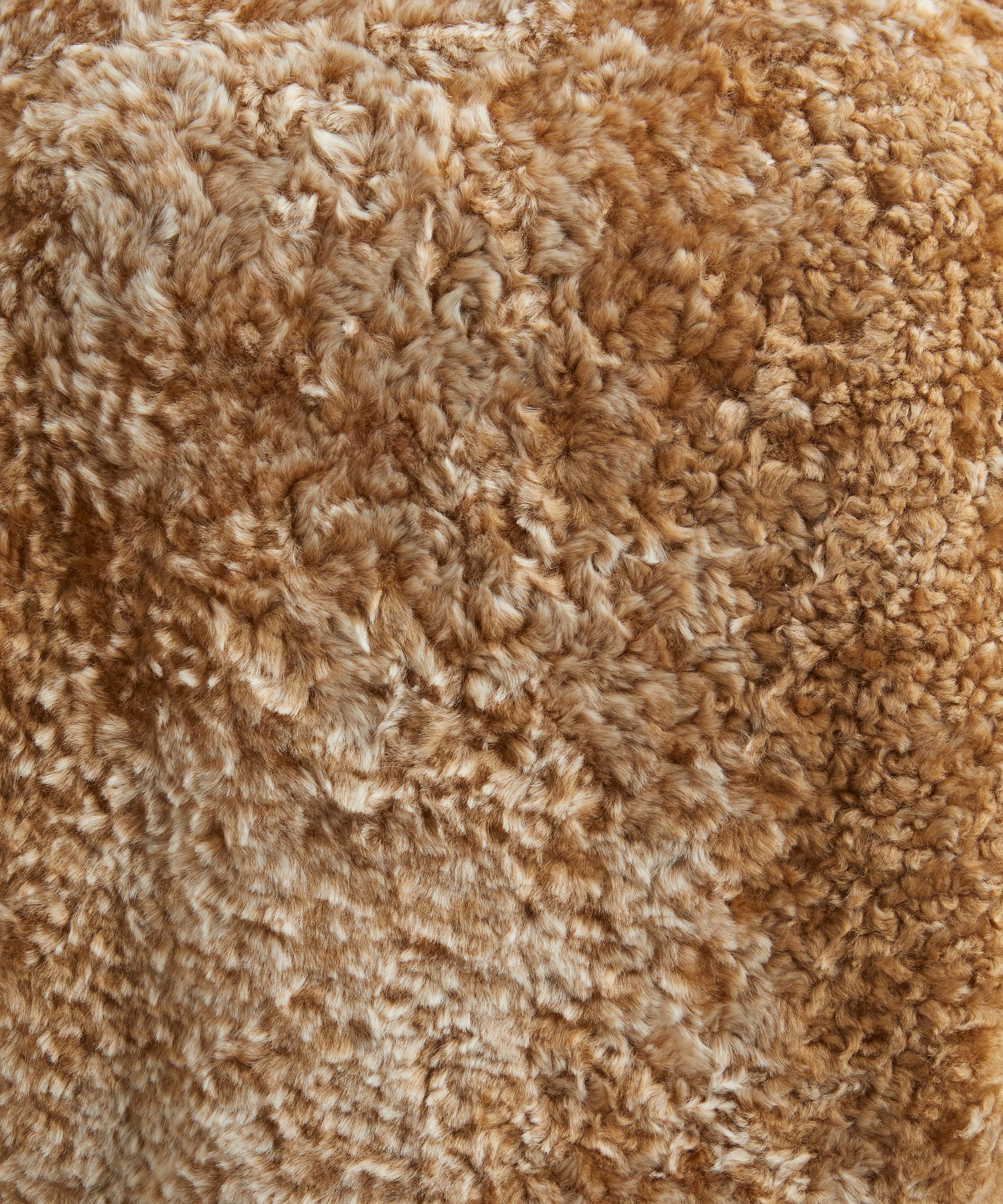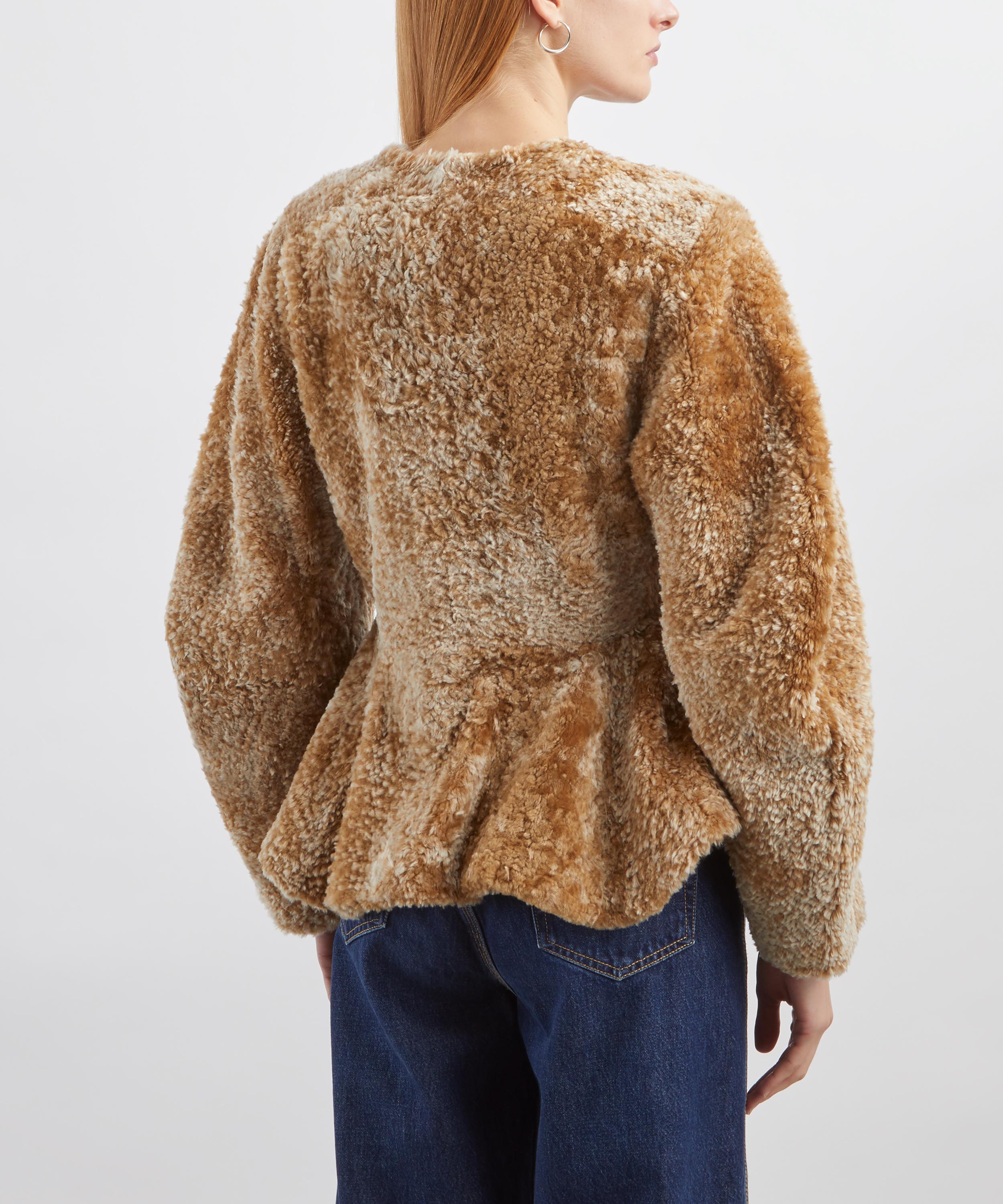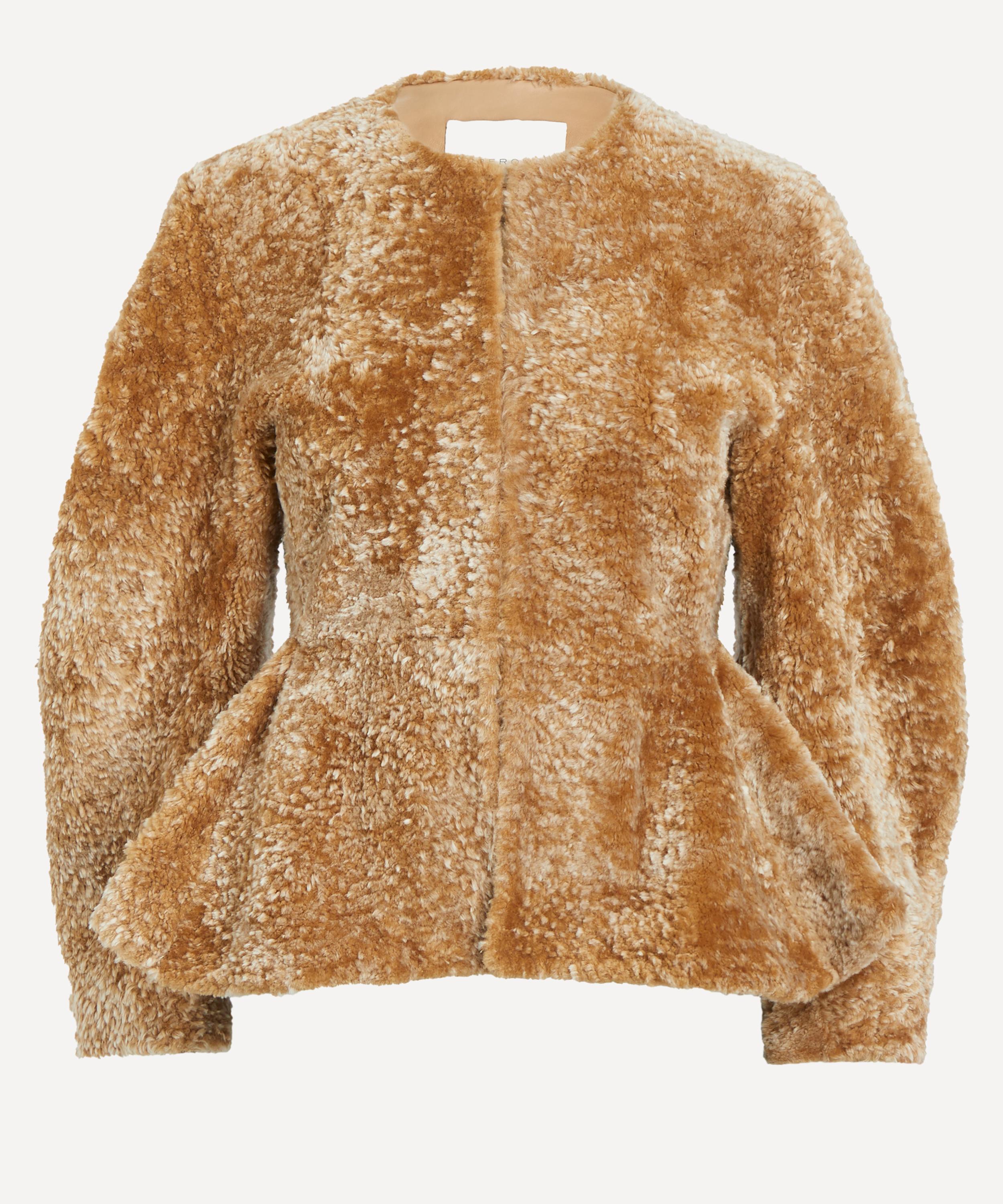 Expertly crafted from a plush, caramel-coloured sheepskin shearling, the Bear jacket embodies modern elegance with its voluminous barrelled sleeves, concealed placket, and softly gathered peplum hem.
