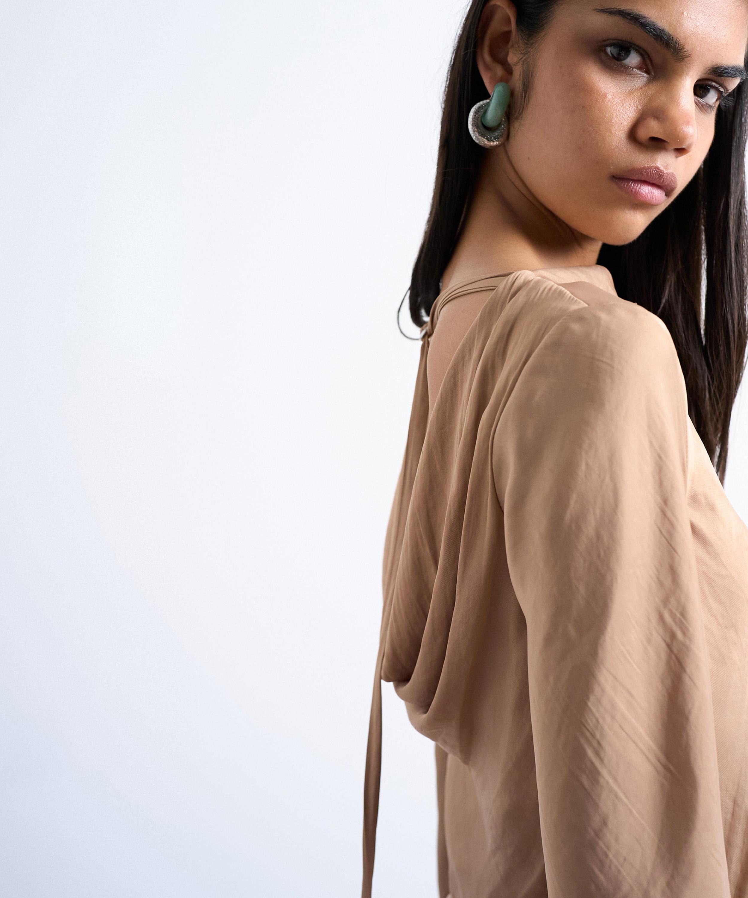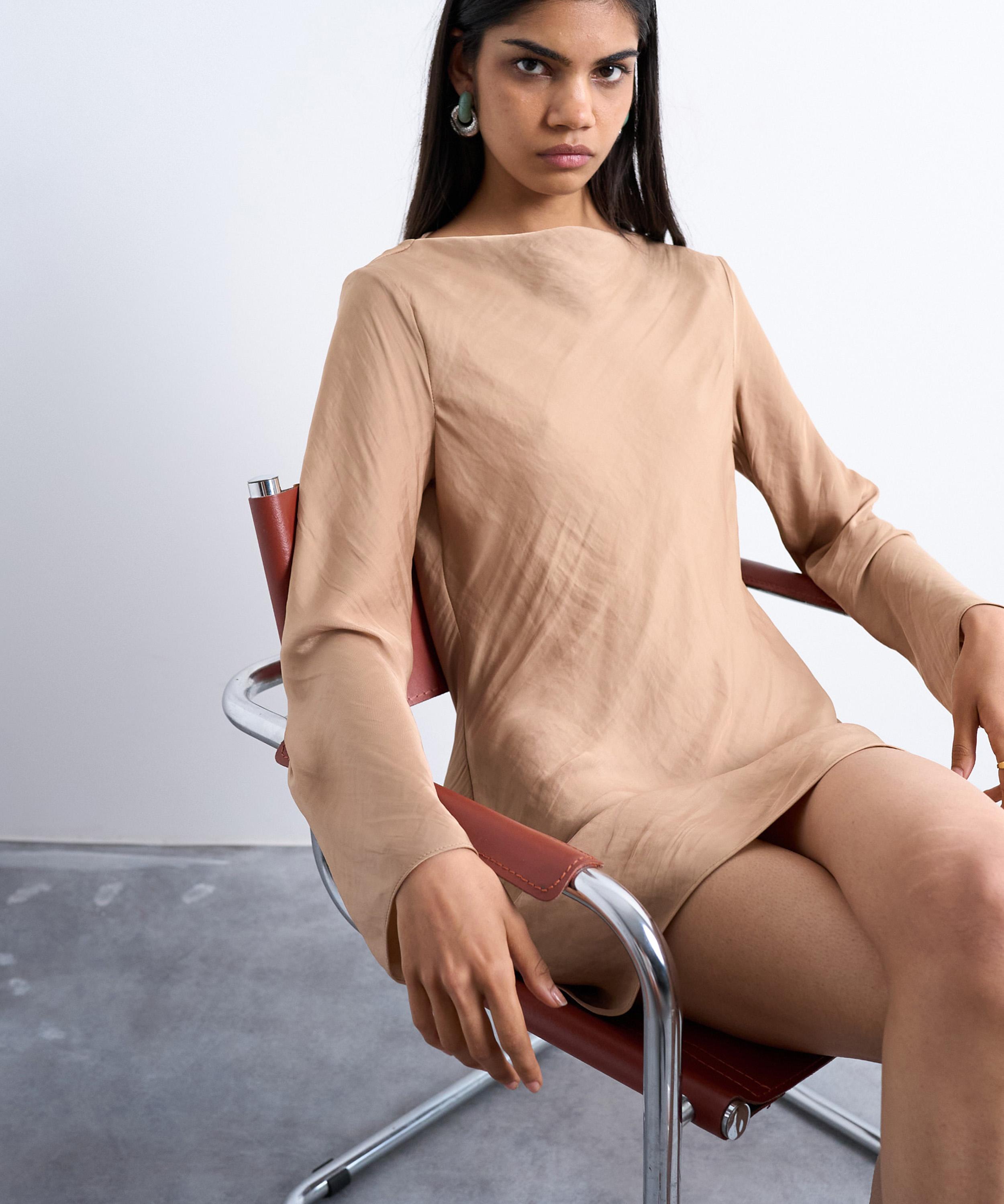Crafted from satin in a lustrous caramel hue, this sleek mini dress features an elegant boat neckline, long sleeves, and a draped cowl back for a subtly sensual finish.