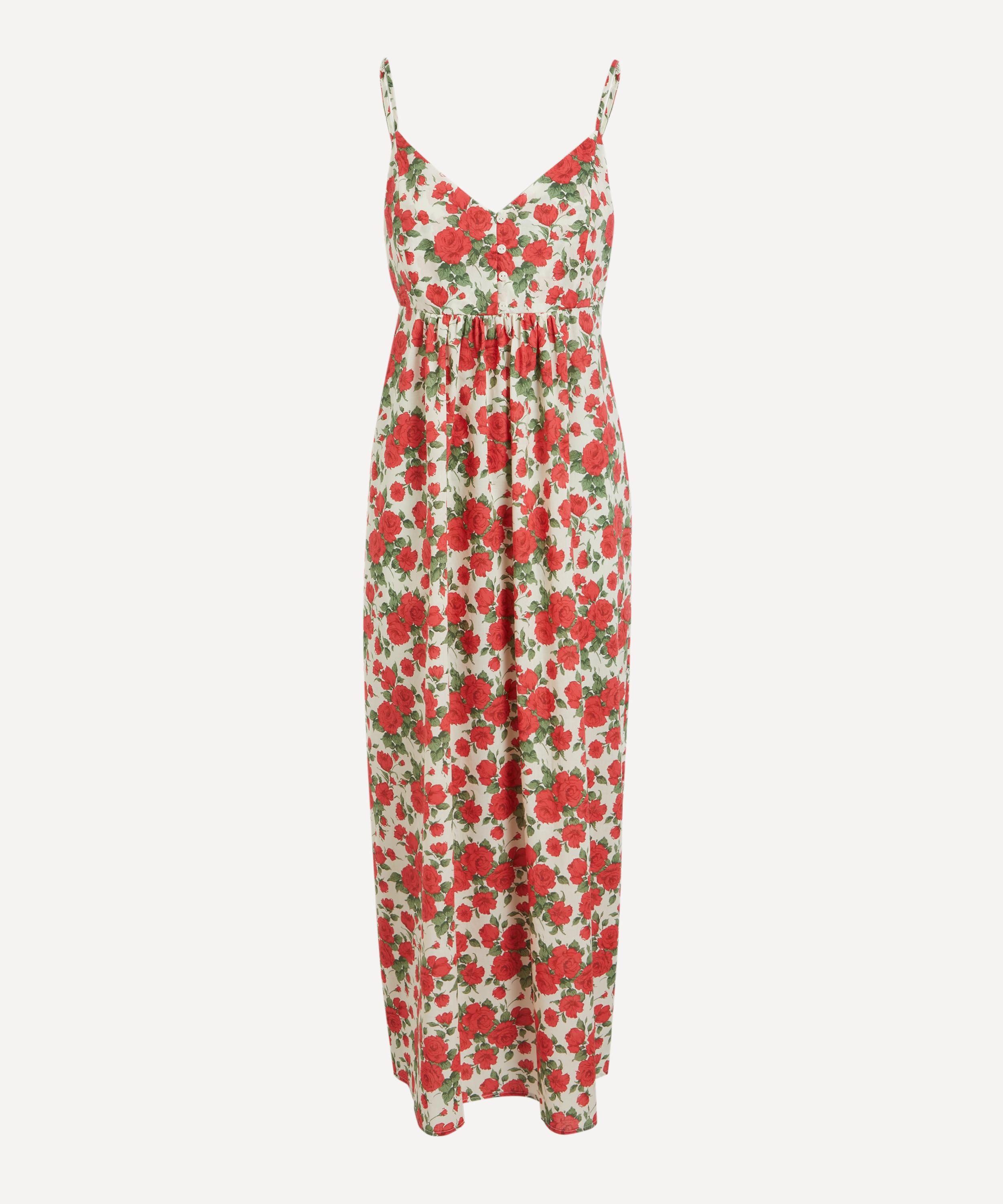 Crafted from our signature Tana Lawn™ cotton, this classic slip dress exudes effortless elegance with its V-neckline, adjustable straps, and graceful floor-length silhouette, finished with gathered detailing at the waist and a corozo nut button opening at the back.