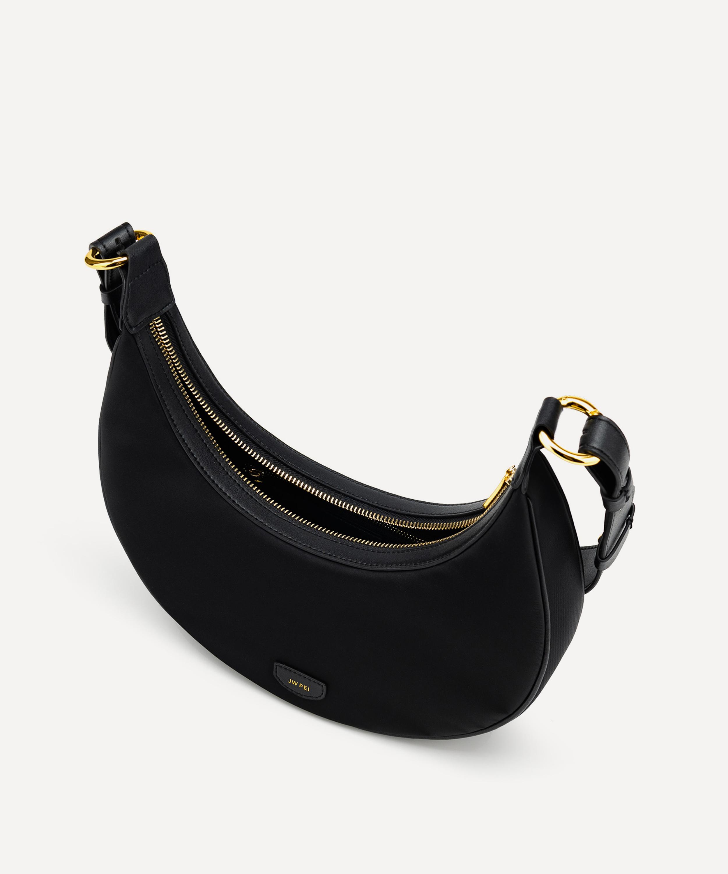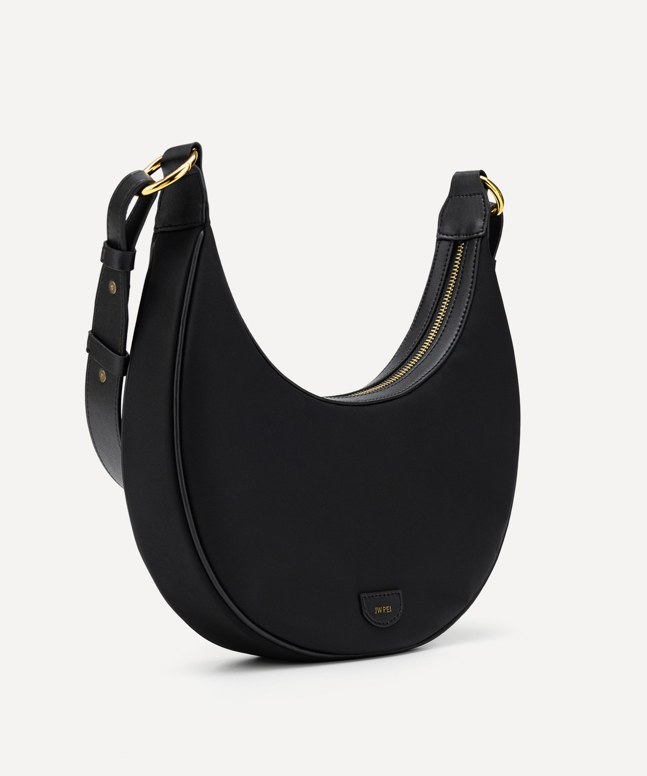 Capturing a modern, minimalist aesthetic, this recycled nylon handbag is a contemporary take on the classic saddle bag, with a structured, curved silhouette and sleek exterior. The elegant design features a top zip fastening, gold-tone hardware and subtle brand lettering at the front. Complete with an adjustable strap, it can be worn in a multitude of ways – rock this early 2000s-inspired staple as a shoulder bag or style it as an offbeat clutch for an unforgettable evening look.