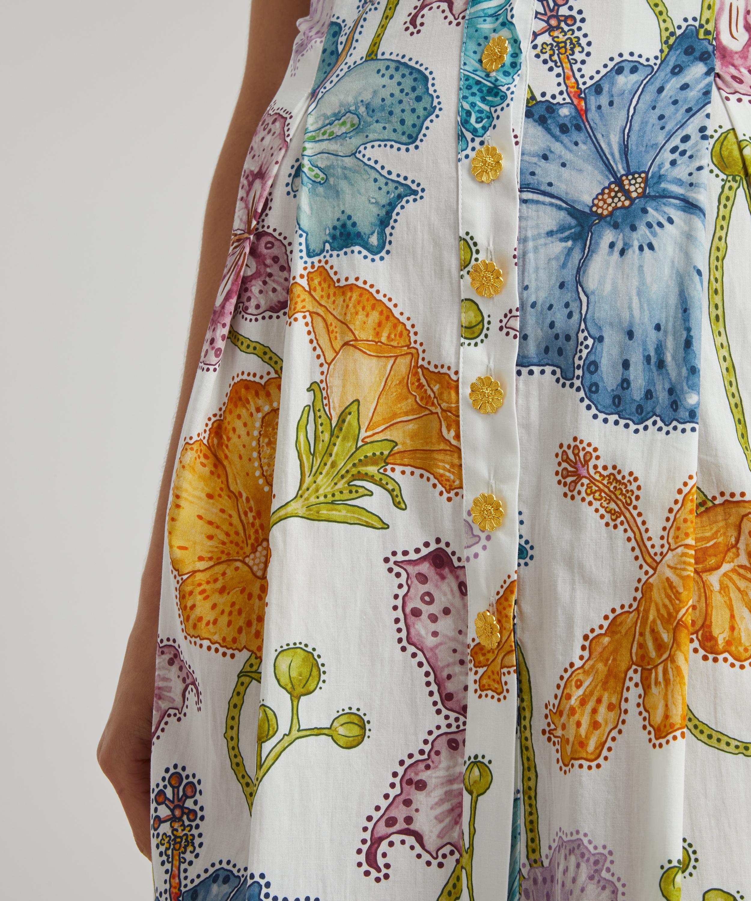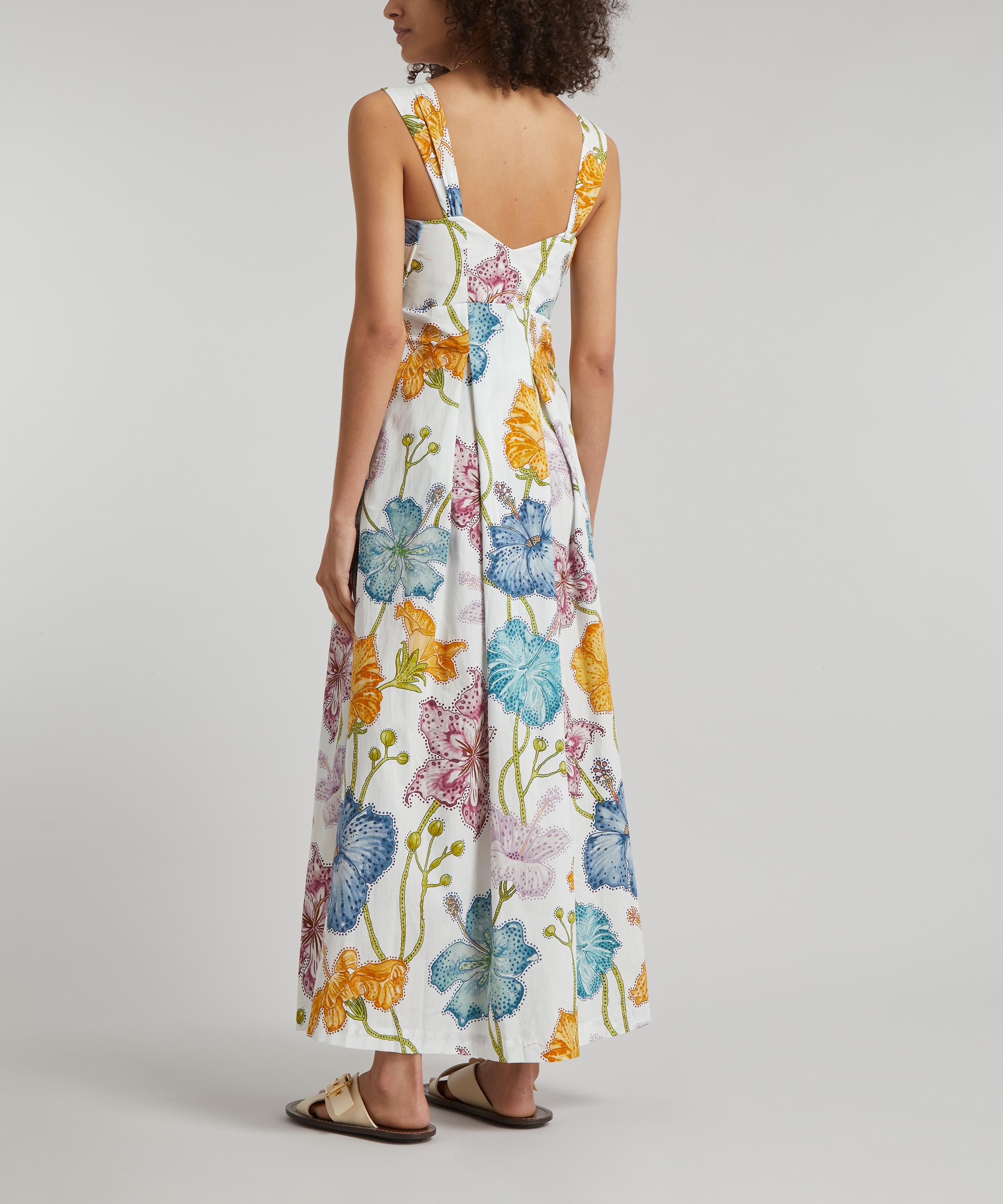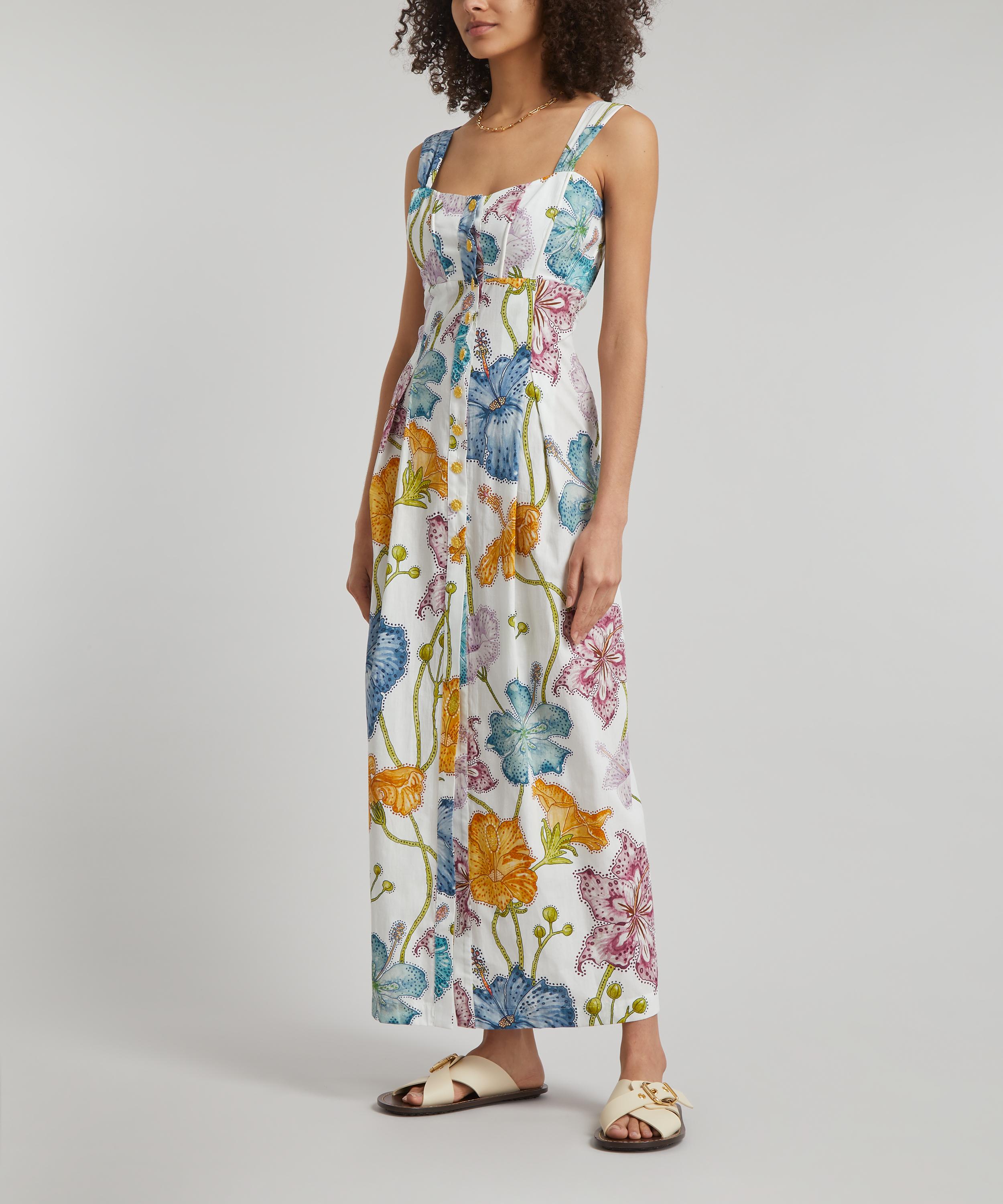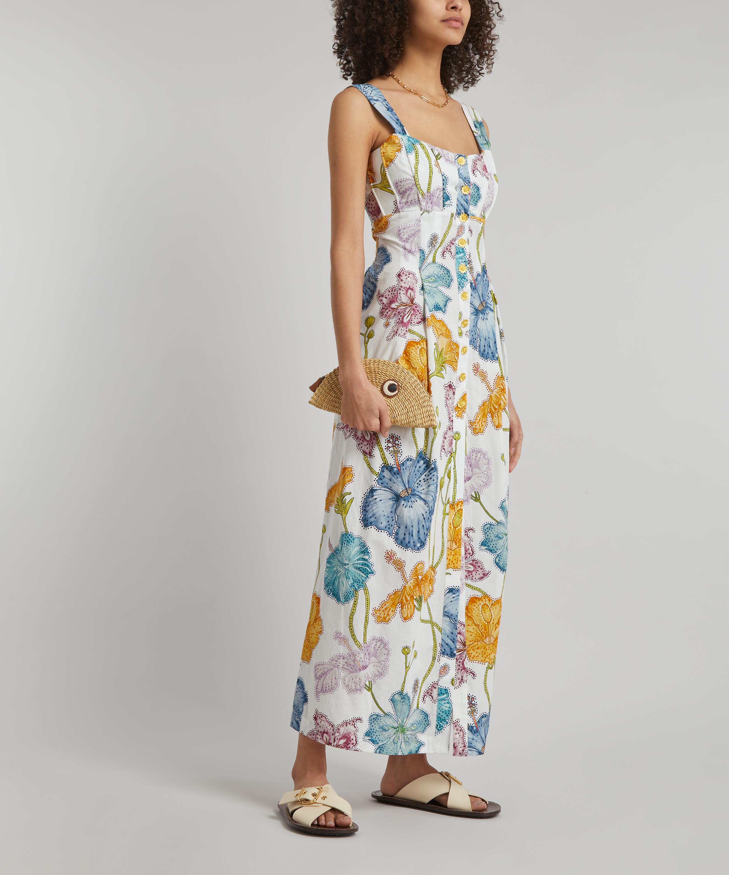 Crafted from cotton in a bold floral motif inspired by the iconic Carmen Miranda, the Carmen maxi dress is cut to a loose, long skirt, complete with a fitted bodice featuring wide pleat straps and a short placket with pretty gold, flower-shaped buttons. Perfect for parties or summer drinks on the terrace, we love this statement dress paired with cream slide-on sandals for a relaxed finish to your evening edit.