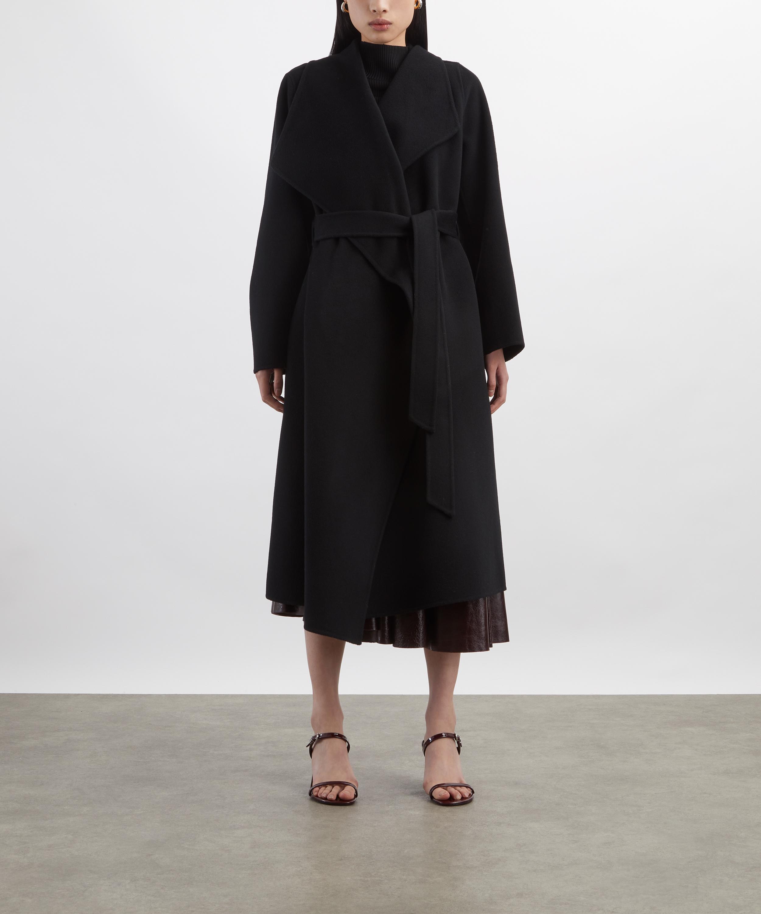 Crafted from warm wool, its minimalist wrap design is elevated with exaggerated lapels and a relaxed silhouette. Layer it over your winter knitwear collection throughout the season.