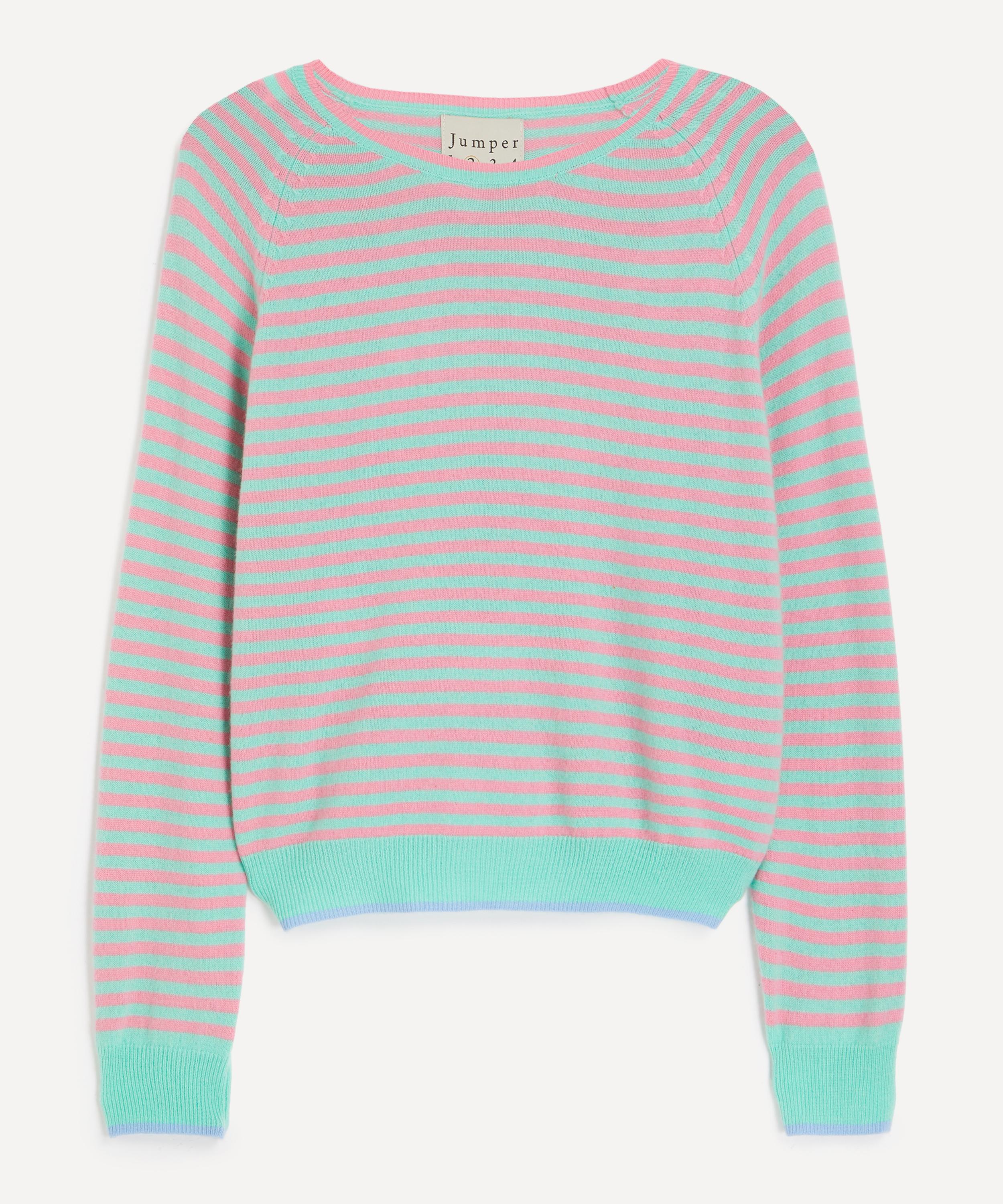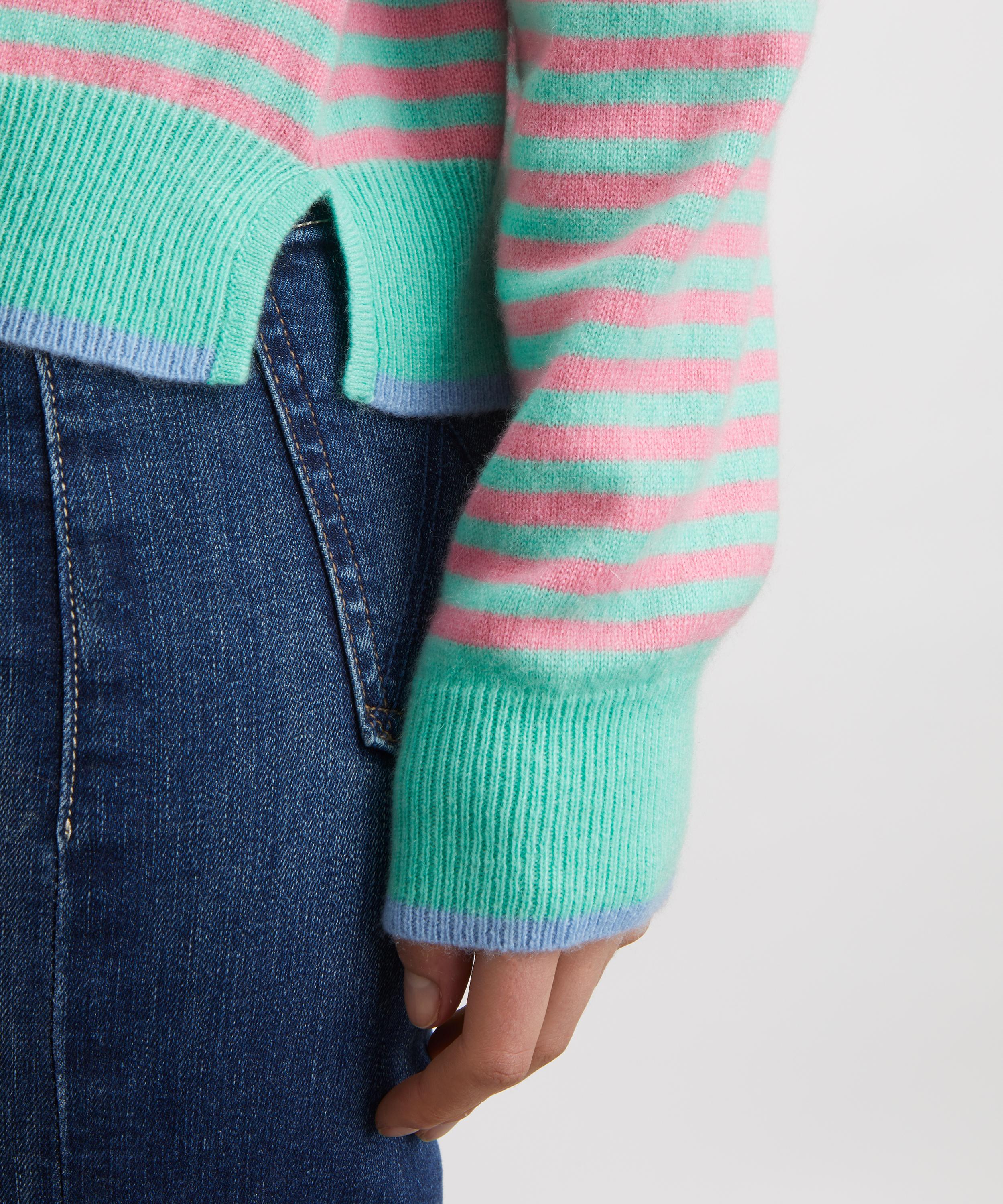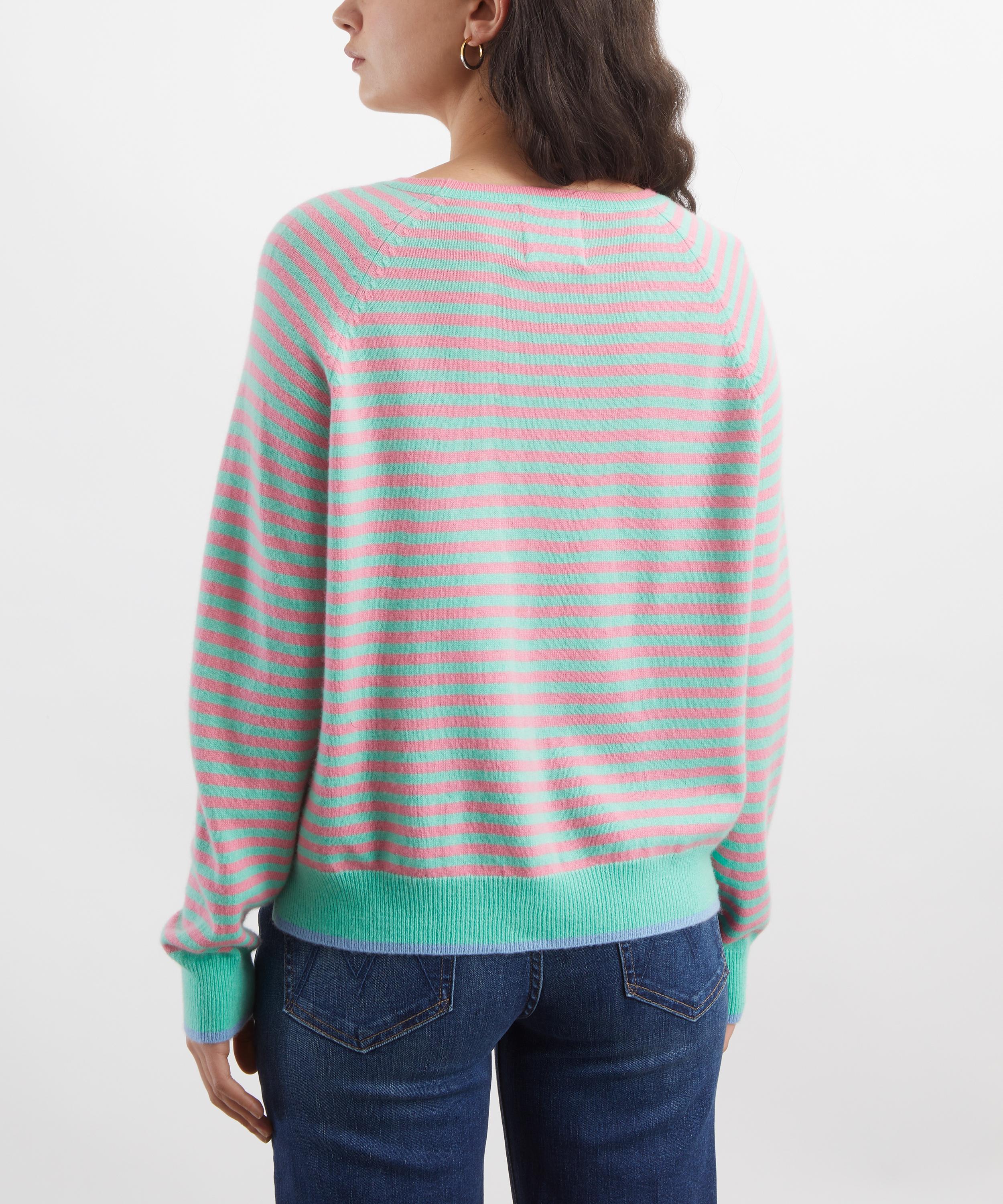 Crafted from lightweight cashmere, this long-sleeve crew is accented with fine green and pink stripes throughout. Cut to a relaxed boyfriend fit with raglan sleeves, it’s finished with contrast tipping for a playful yet refined finish.