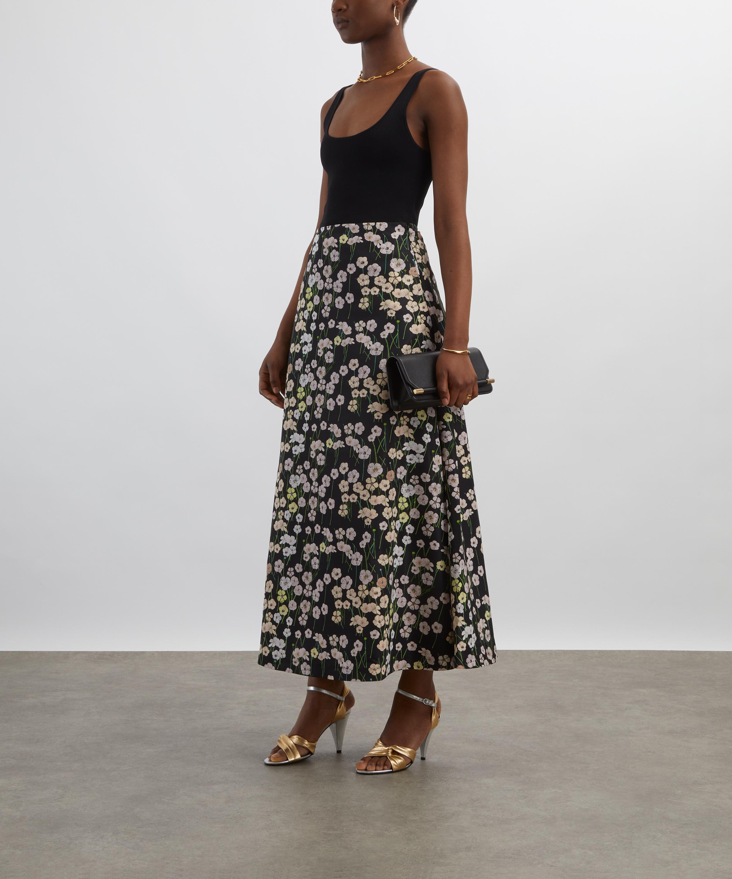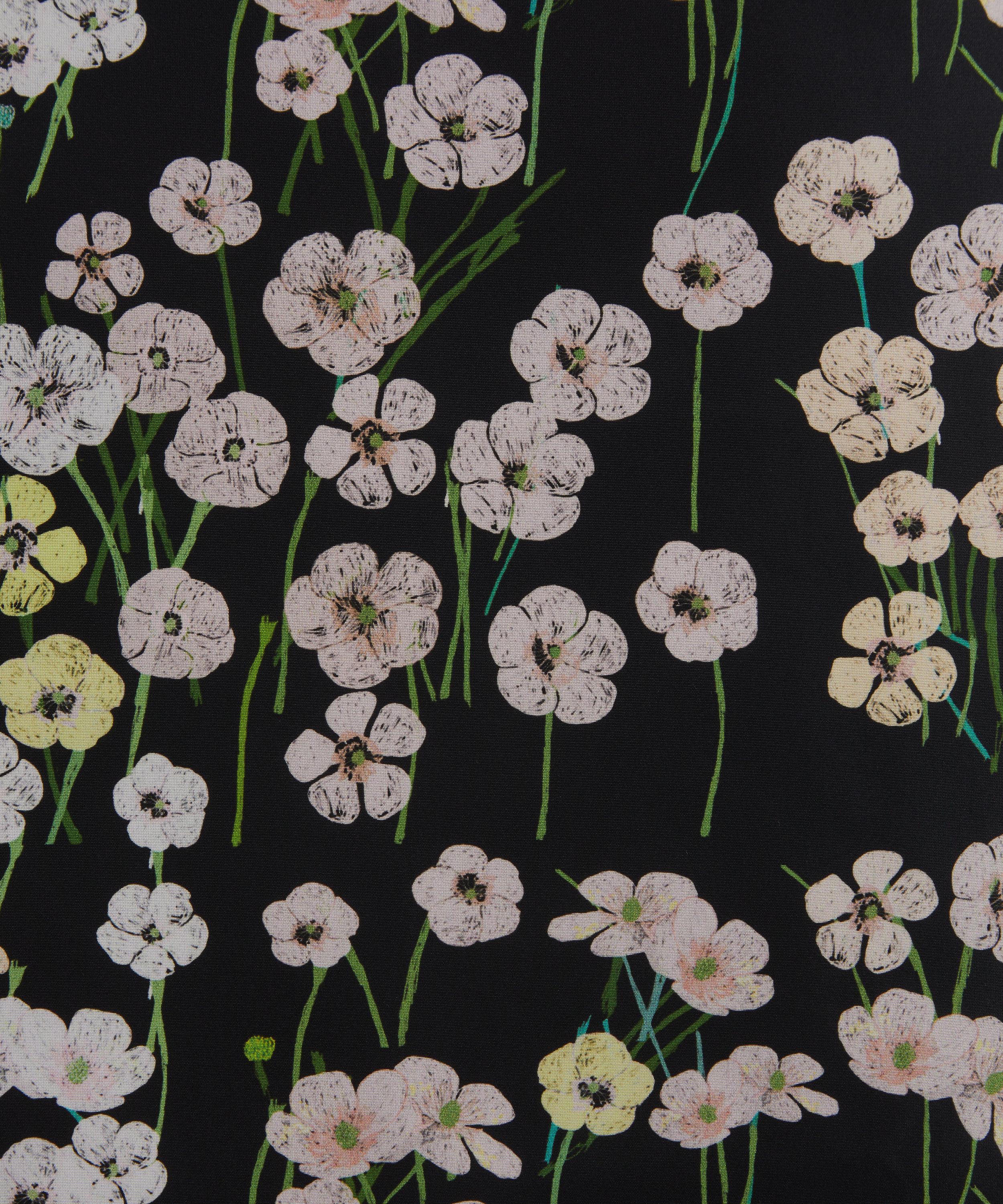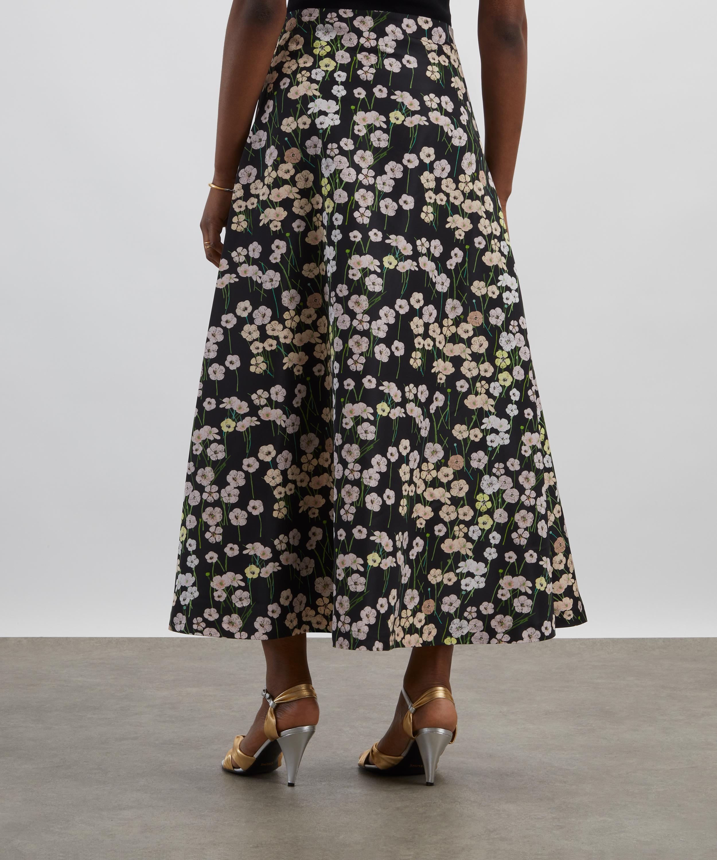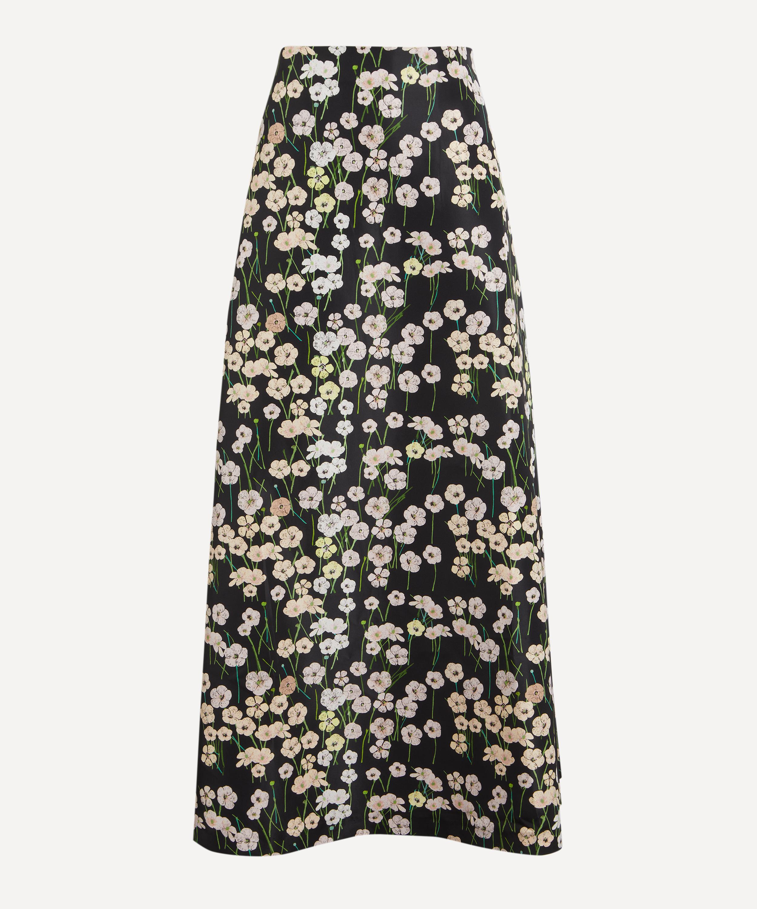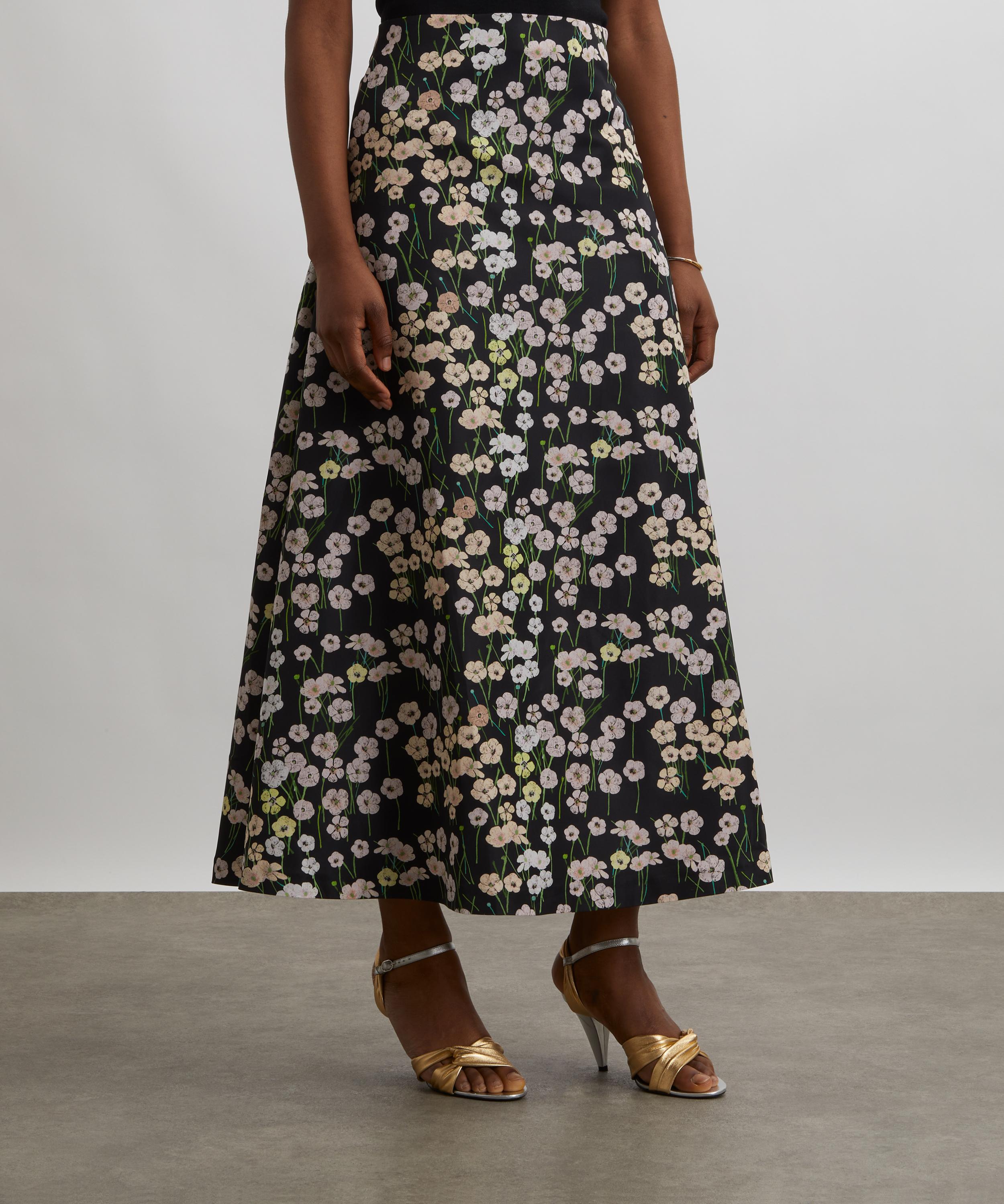 Adorned with this season’s blooming black Buttercups print, this ankle-length skirt showcases a flattering A-line silhouette that radiates elegance. Crafted from crisp crepe fabric, it’s a versatile go-to for any occasion.