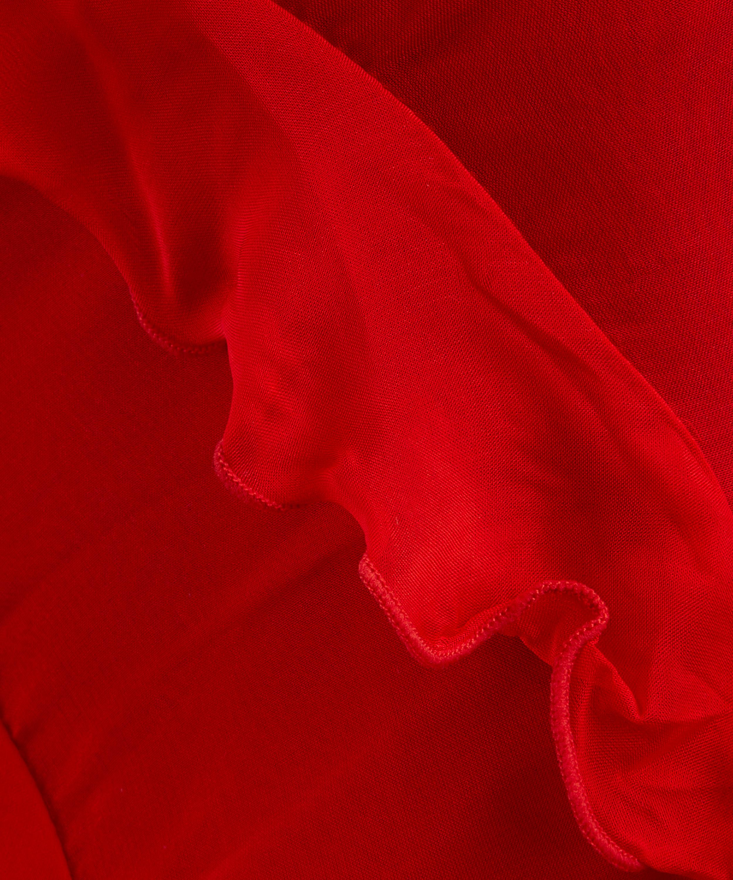Crafted from luxurious silk chiffon and adorned with cascading tiers of delicate frills, this striking red maxi dress exudes sophistication with its figure-skimming sheath silhouette, deep V-neckline, and open back.
