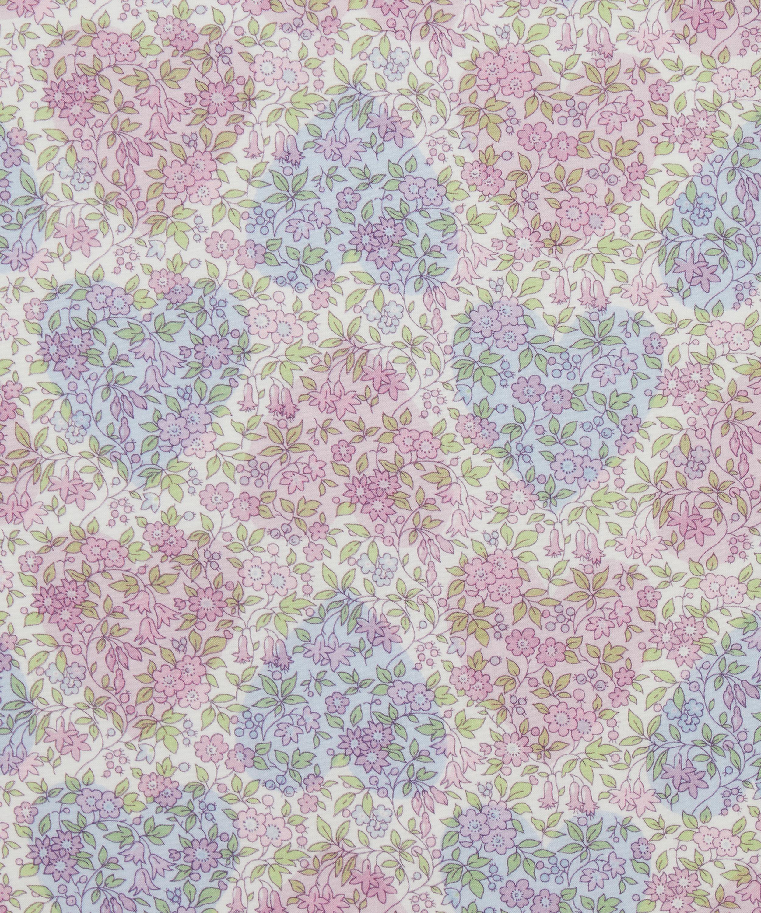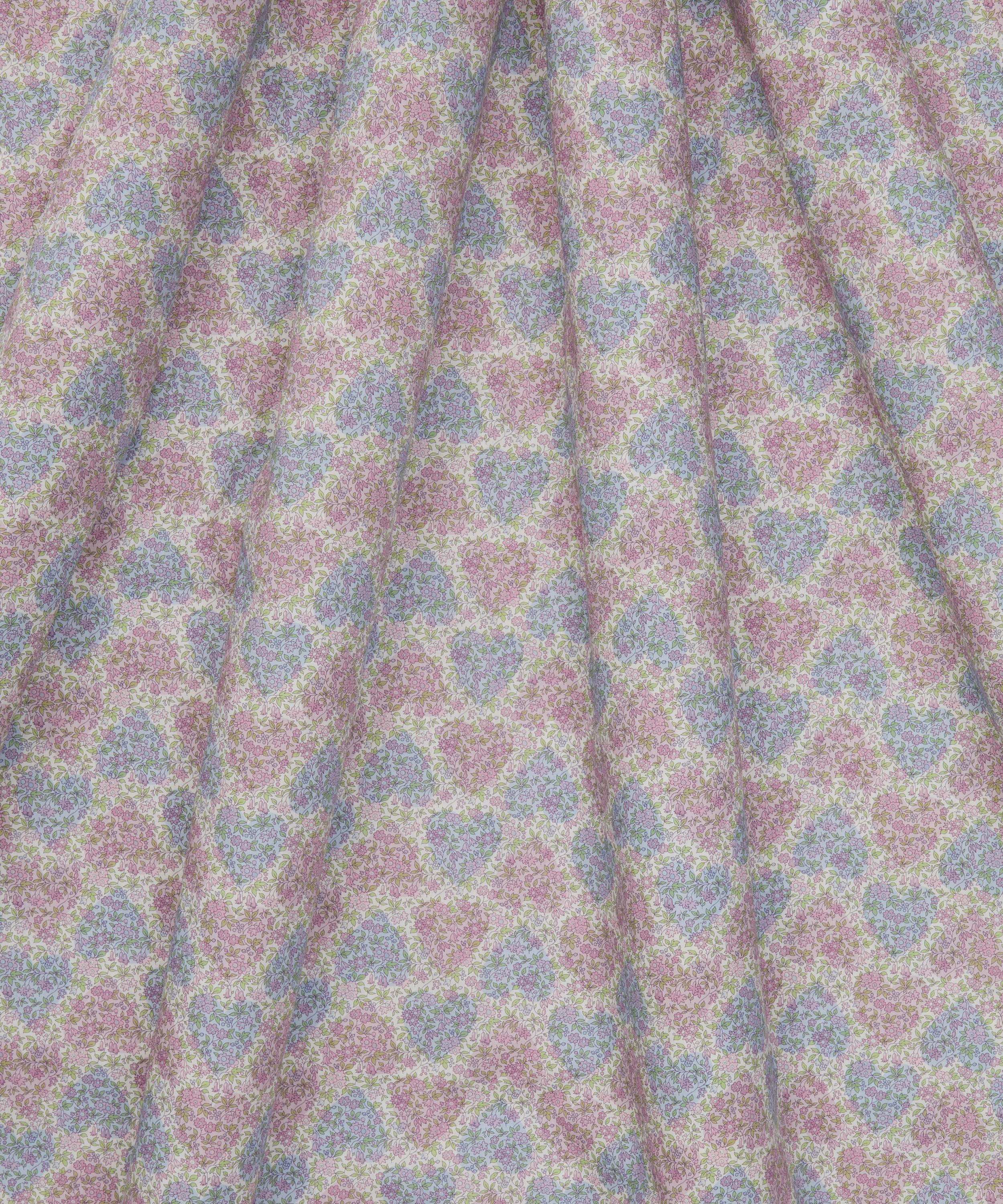 Using the beloved Chamomile print as a floral backdrop, this whimsical rendition introduces transparent, alternating hearts for a playful touch. Comprising of tiny berries and simplified trailing flowers including forget-me-nots, daisies, and bluebells, this quintessential Liberty botanical finds its roots in an archival 1950s pattern.