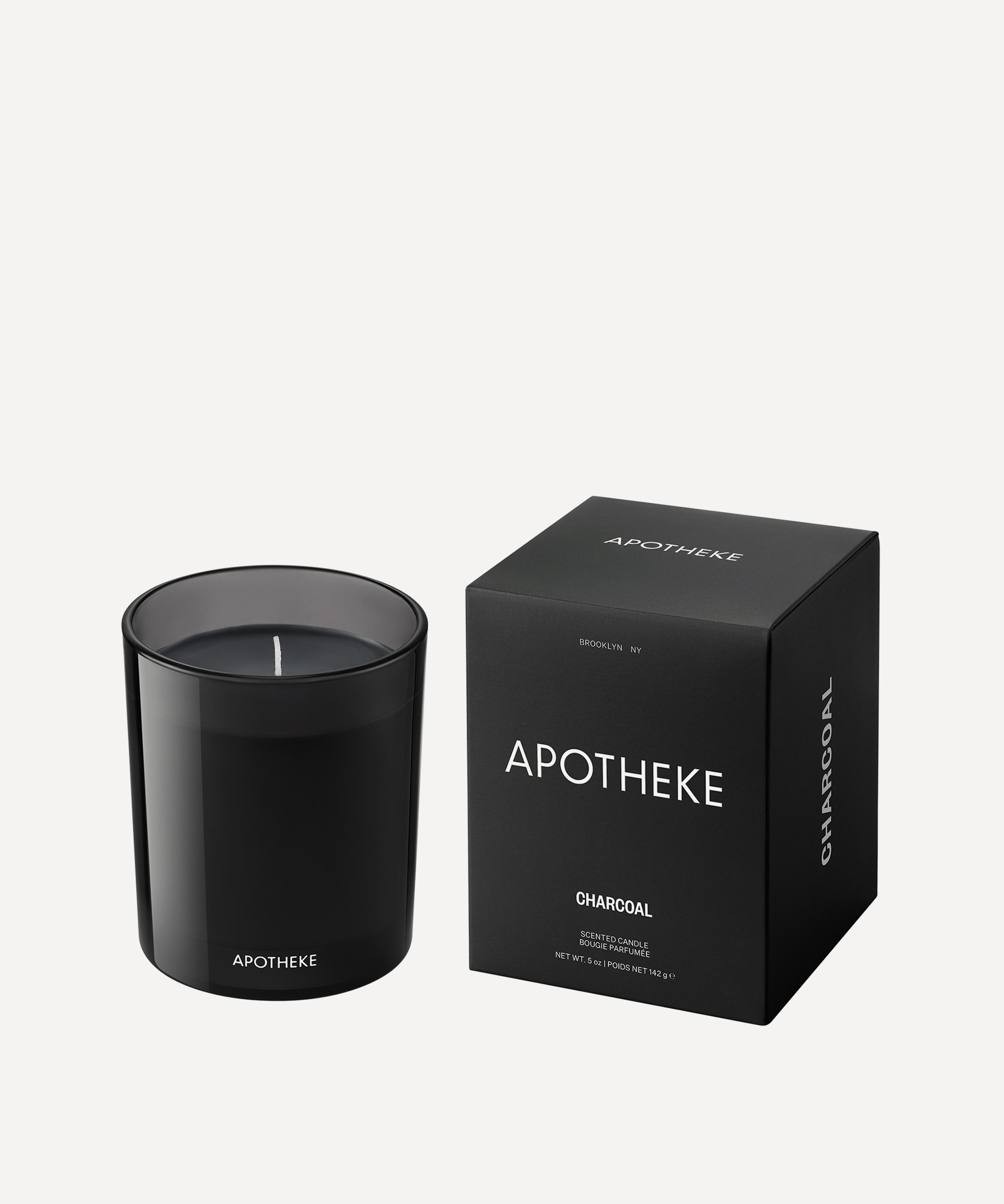 Elevate the atmosphere of your home with the dynamic, woody fragrance of Apotheke's Charcoal Petite Scented Candle – housed in an elegant translucent black glass vessel that gently diffuses the candle's glow.