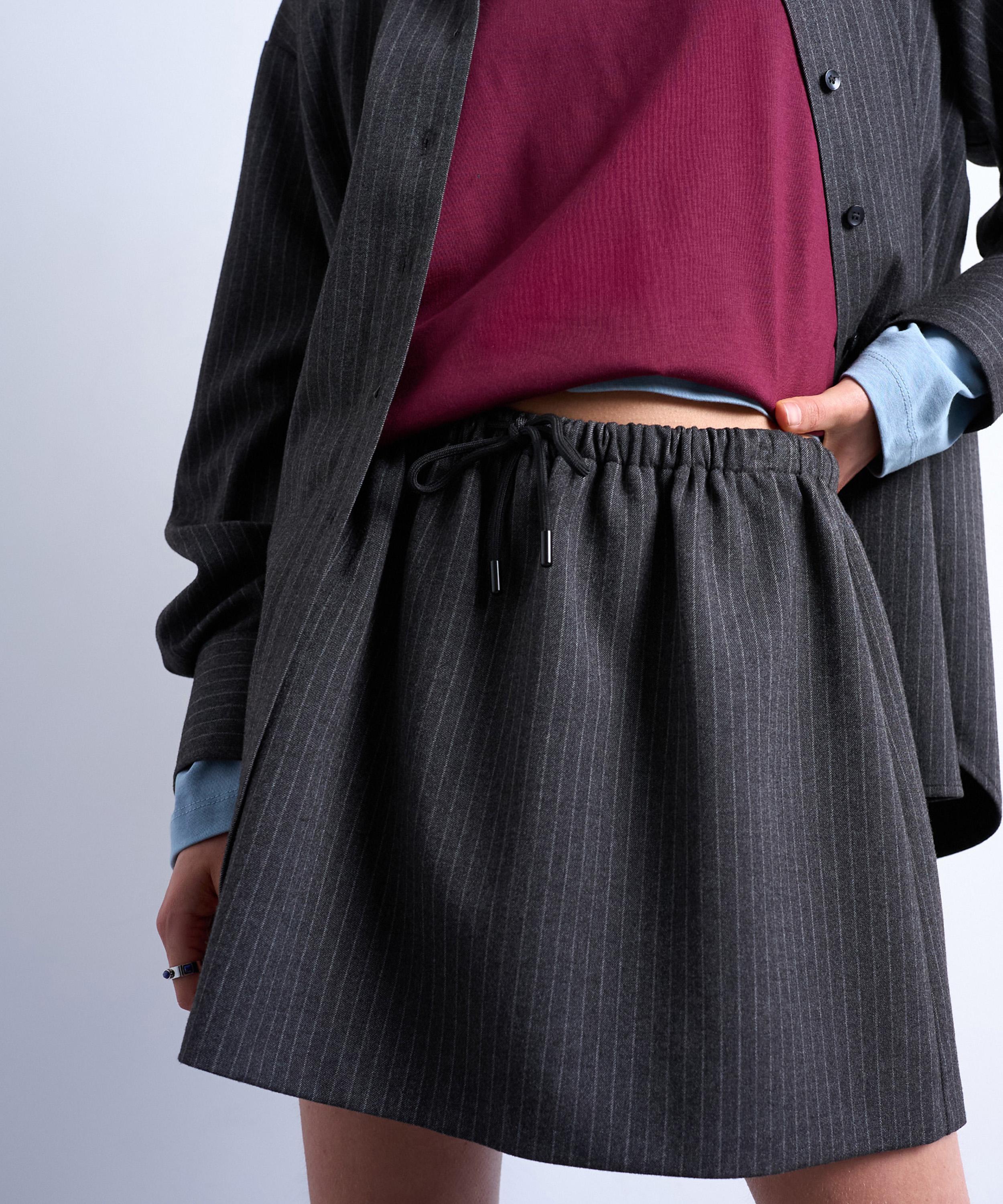 In a classic charcoal pinstripe with a soft, brushed finish, this mini skirt features a low waist, and a drawstring waist for an adjustable fit.