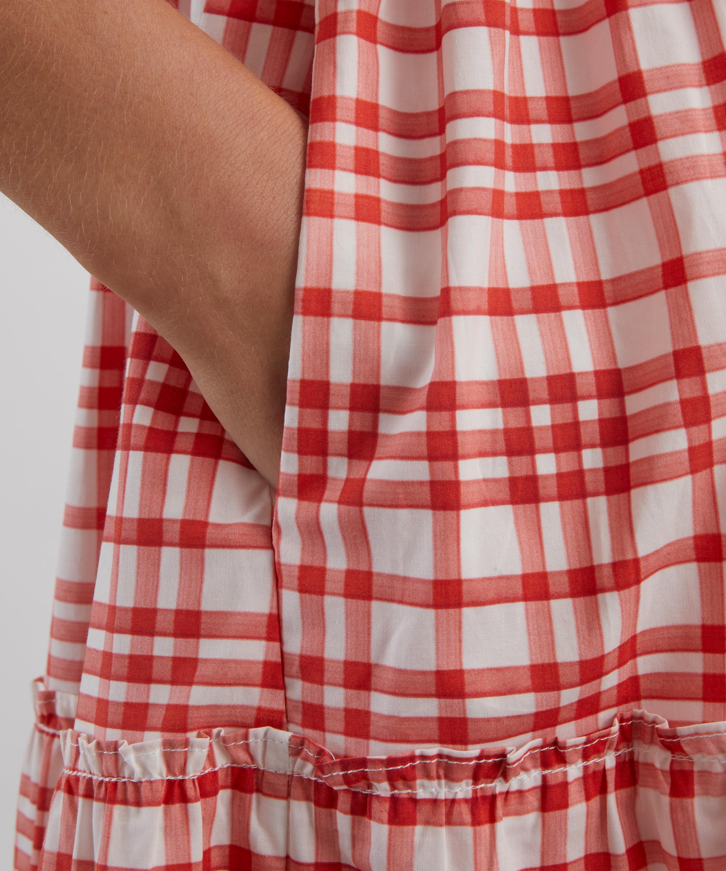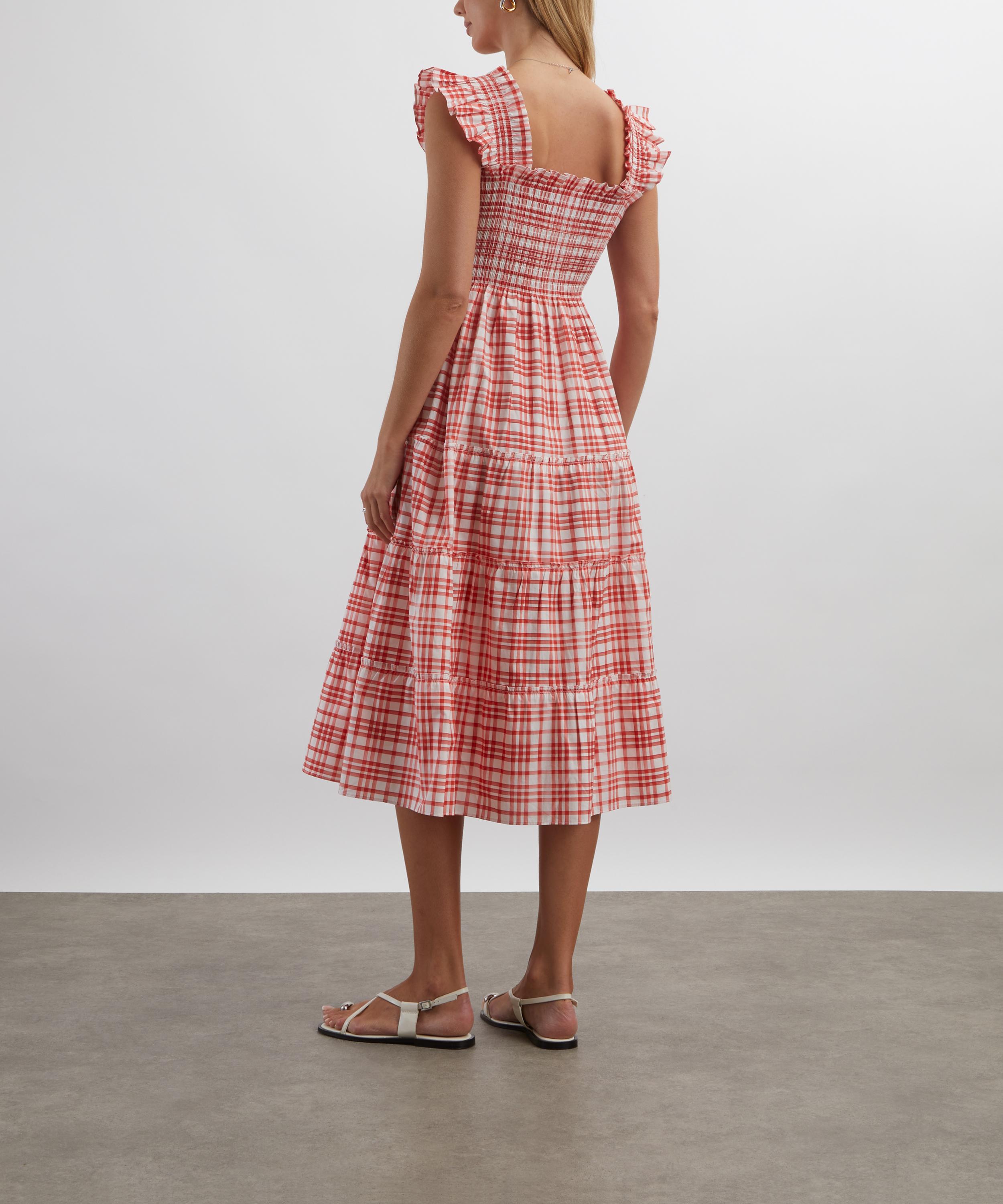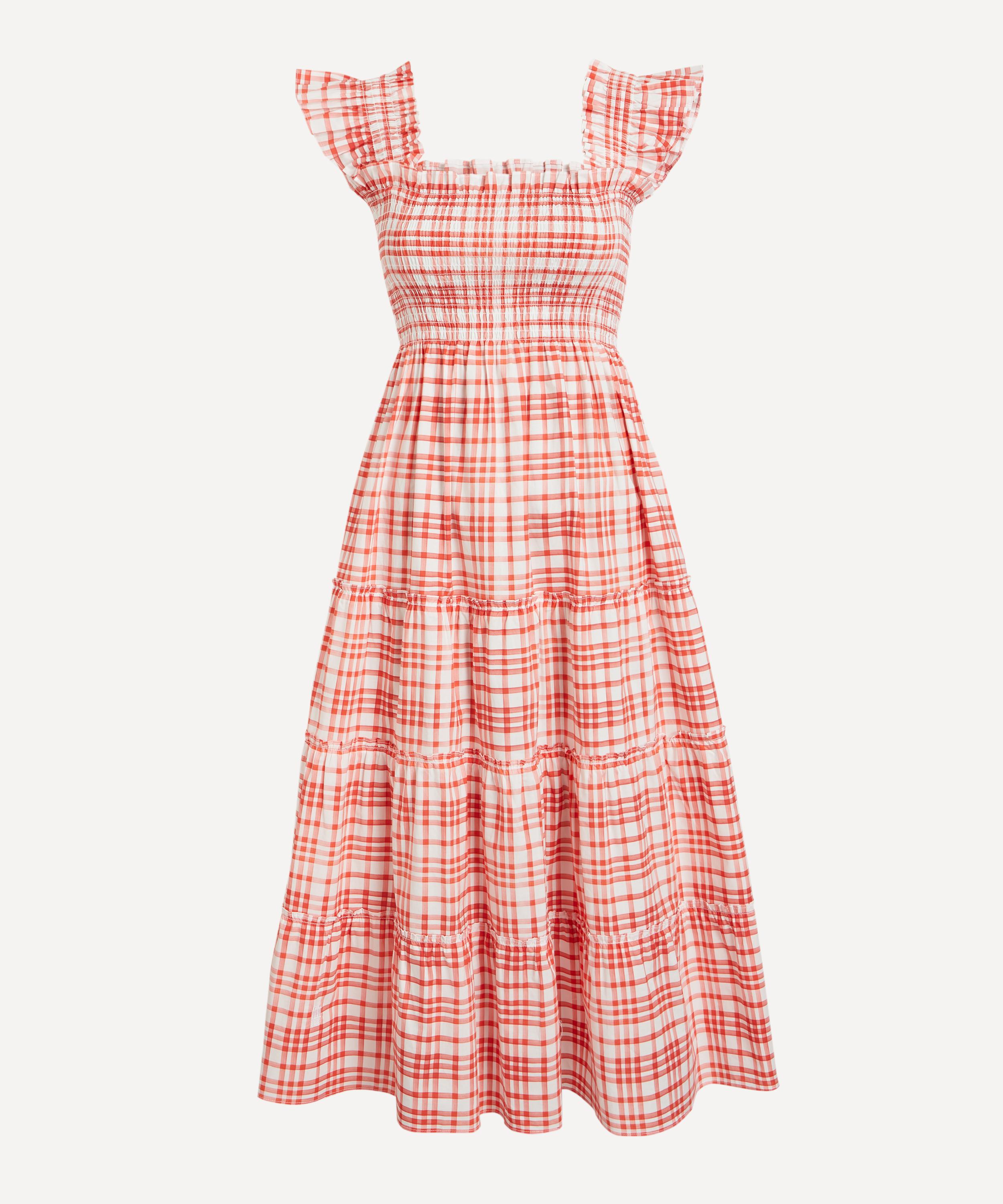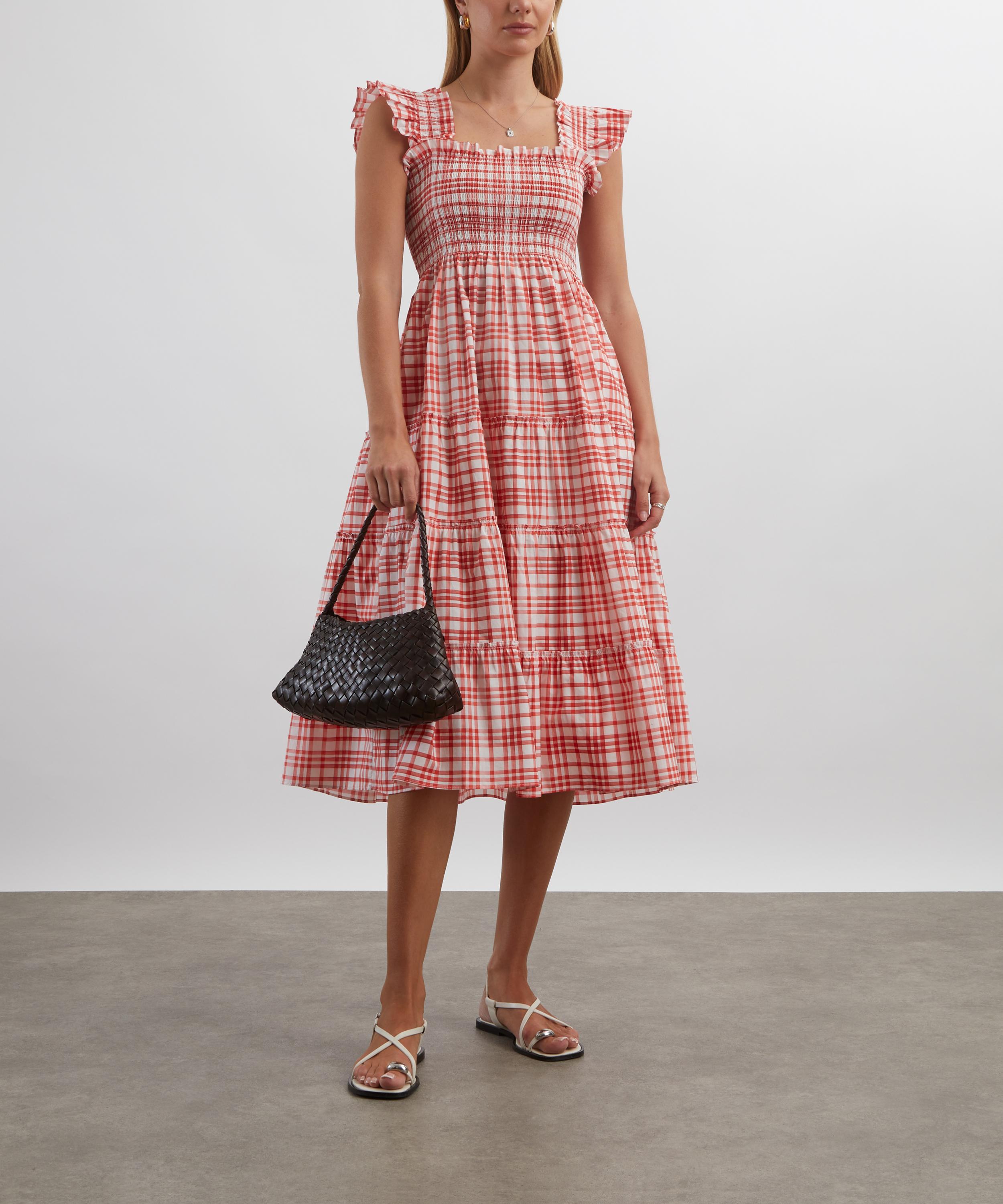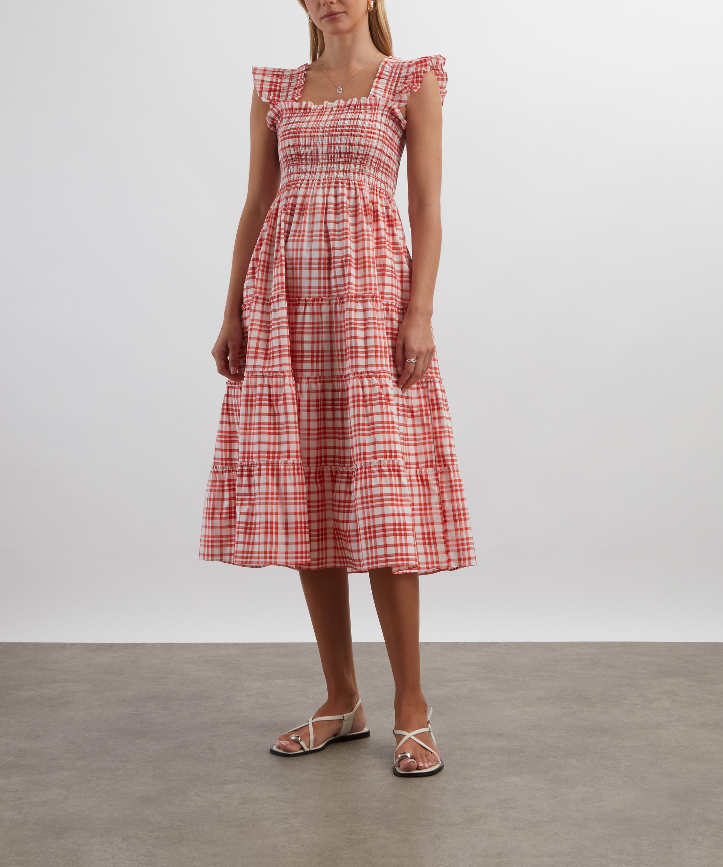 Soft, comfortable and pretty enough to wear from day to night, this sundress is set to become a seasonal staple. Crafted from lightweight cotton presenting a red watercolour gingham design, it features a fit-and-flare A-line silhouette consisting of a smocked bodice, ruffled shoulders and a tiered midi skirt. Elegant and easy to wear, it’s finished with a practical pair of pockets.