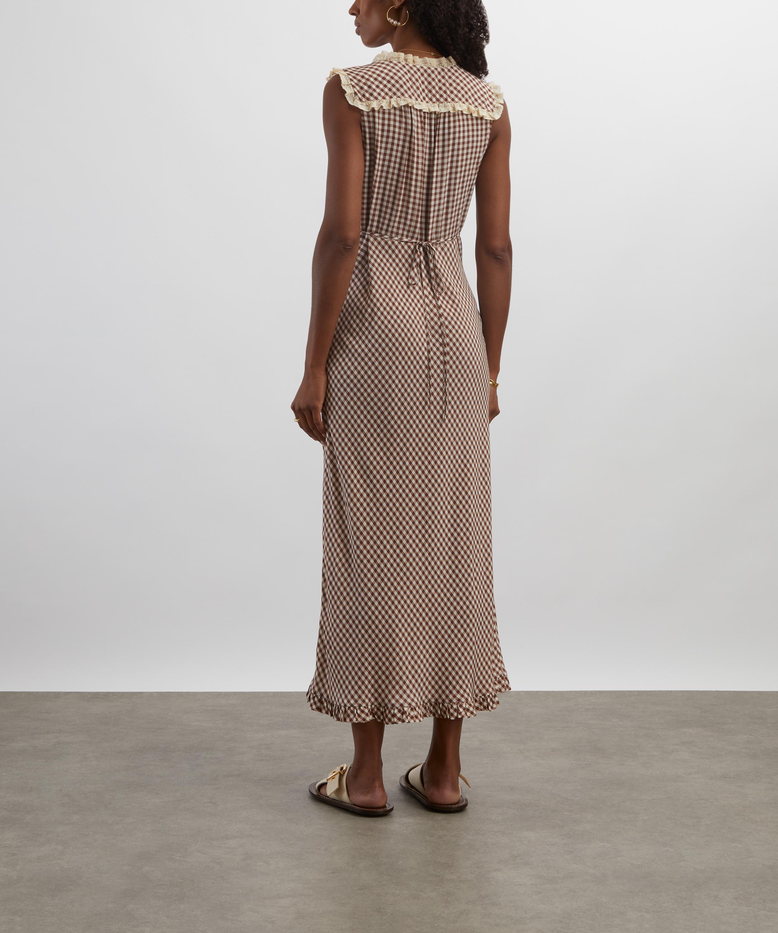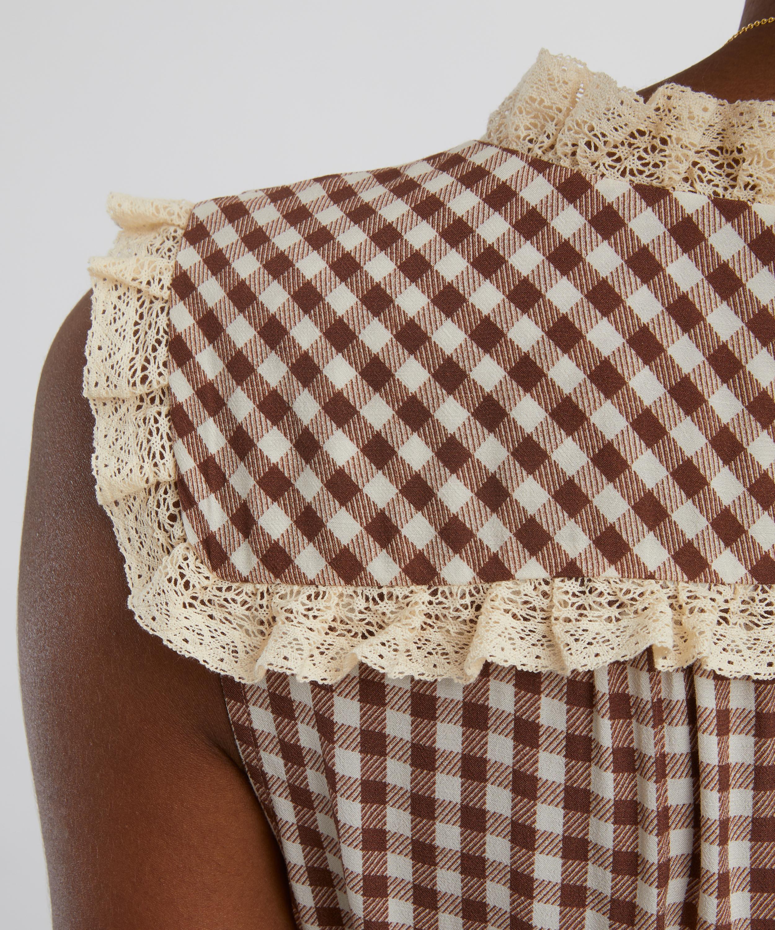 Crafted from lightweight crepe de chine in a timeless brown check, this versatile midi dress blends vintage charm with modern elegance. Featuring a classic V-neckline, lace-trimmed yoke, empire waist, and a fluid bias-cut skirt, it forms a romantic and effortlessly feminine silhouette.