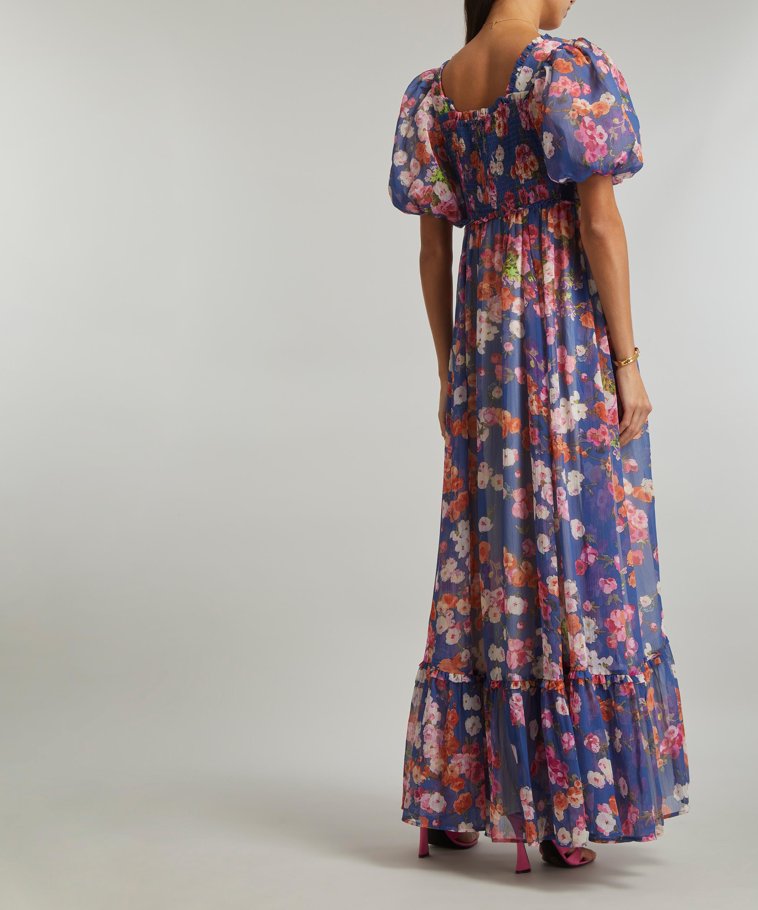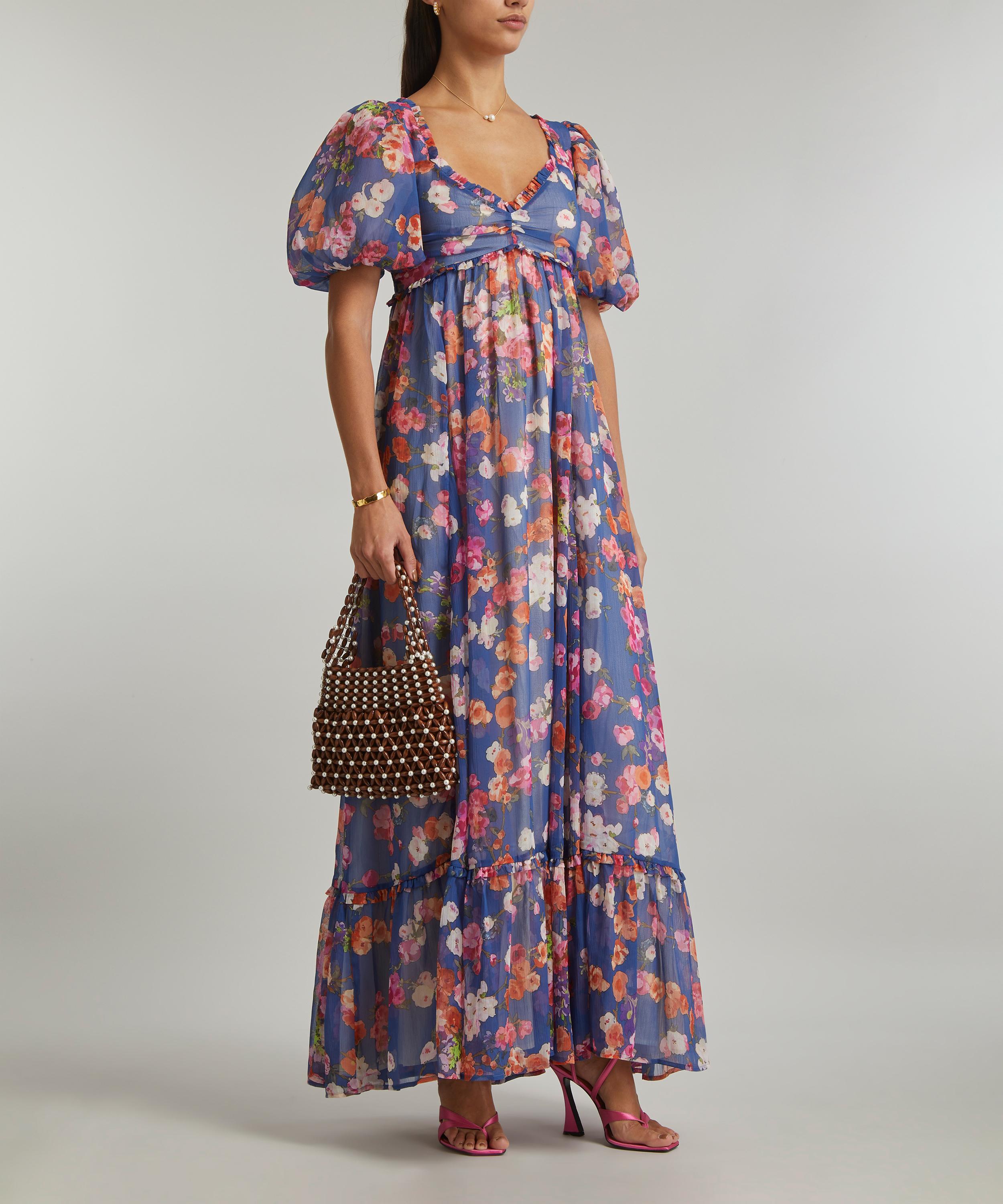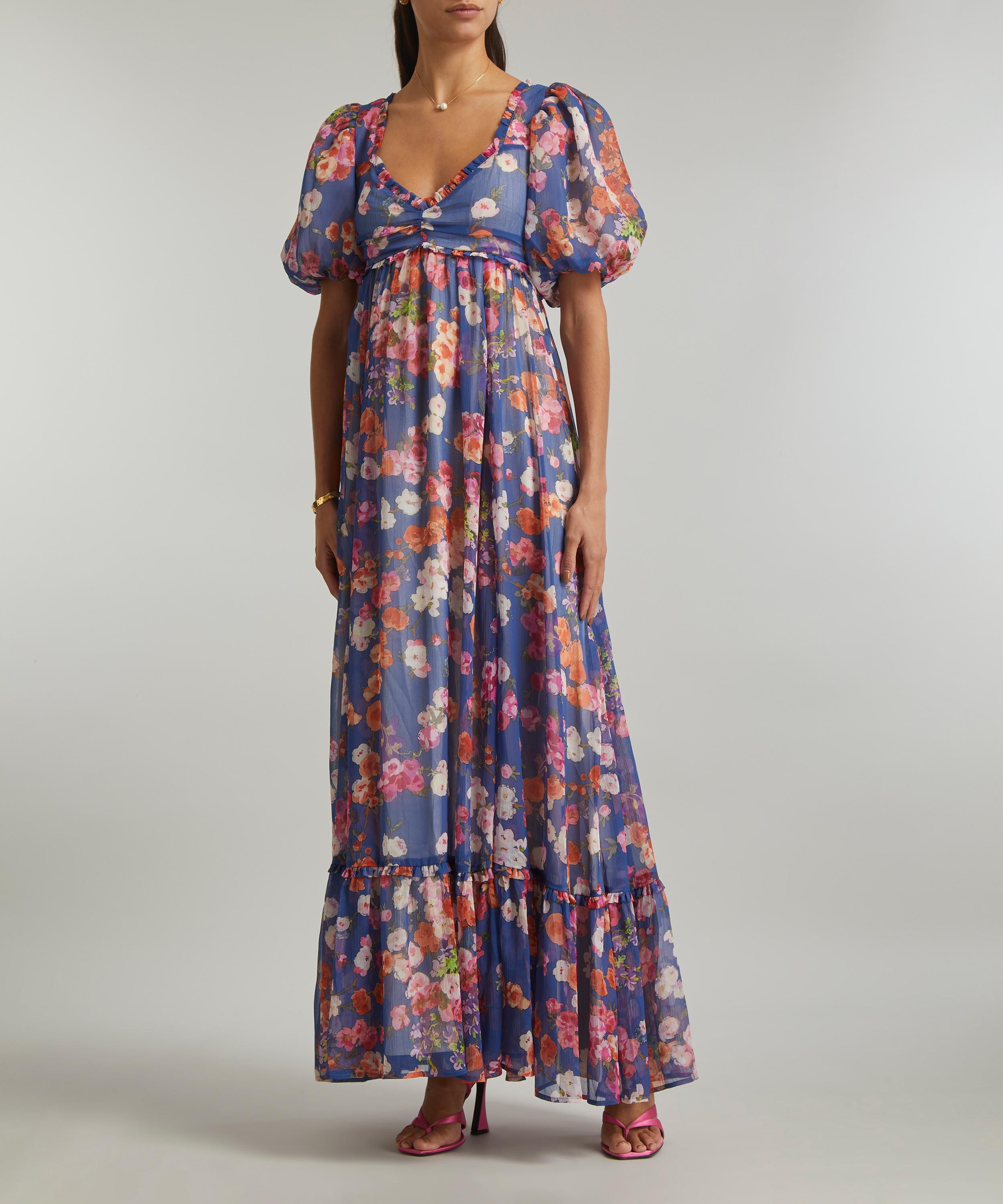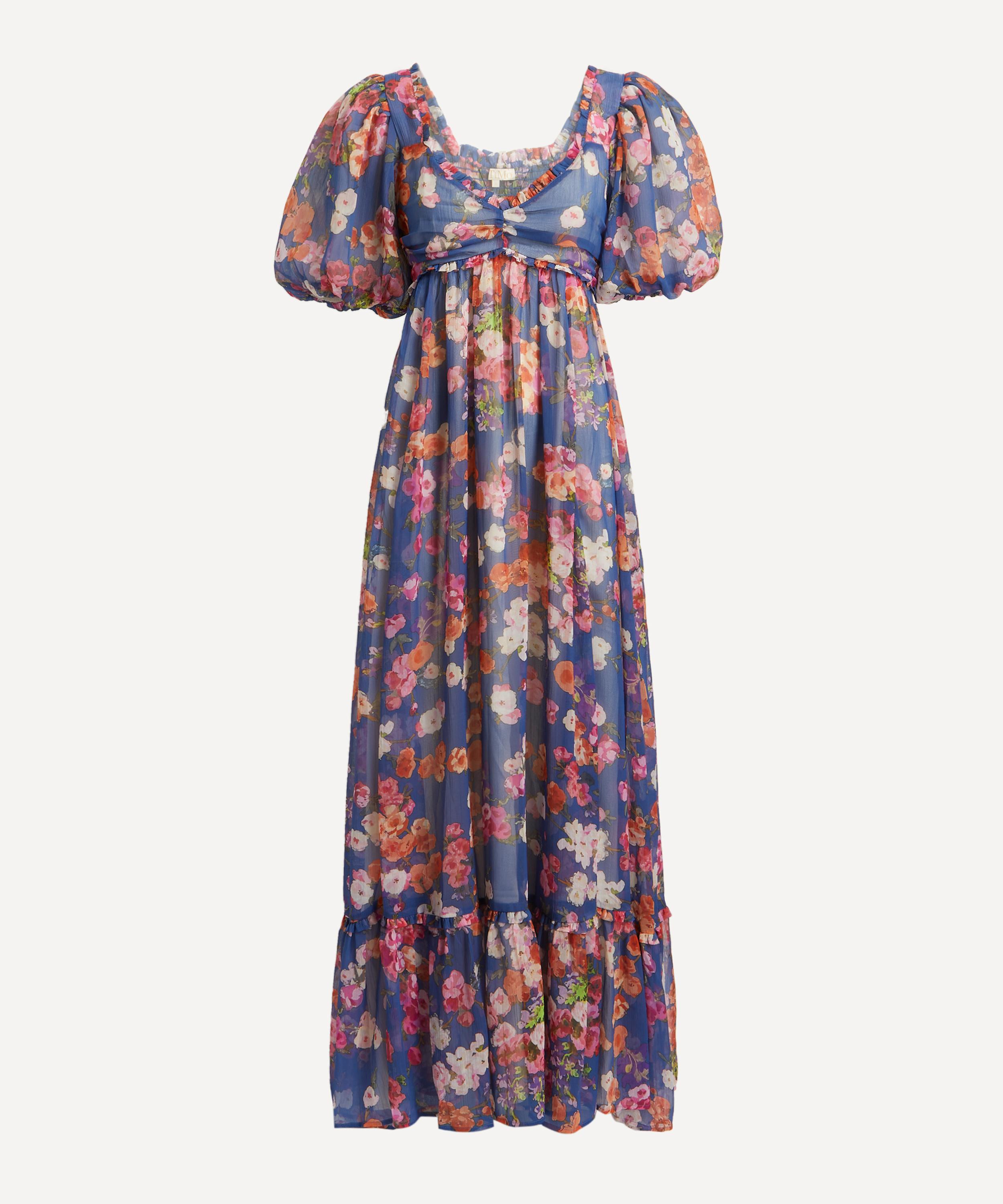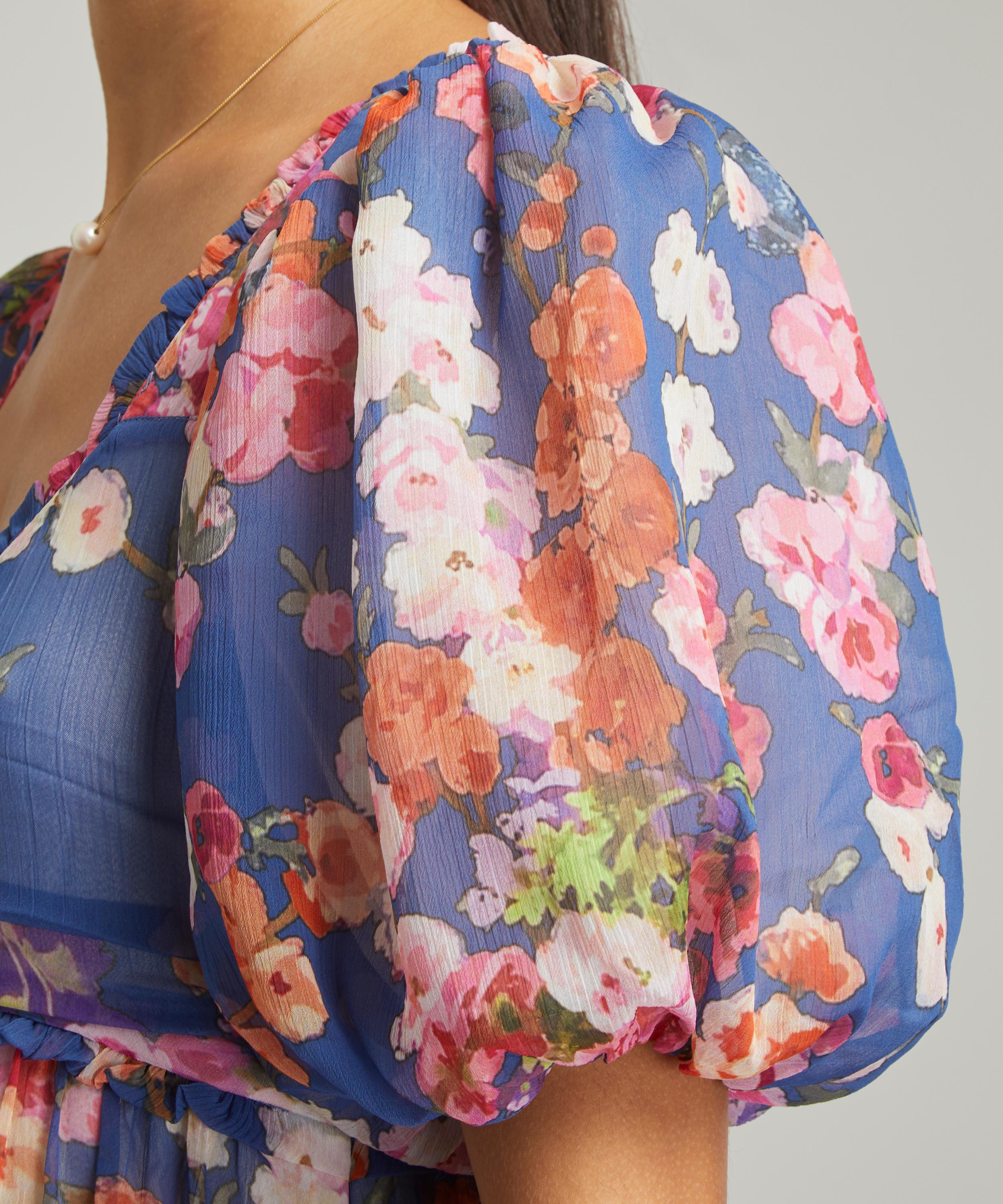 Bold and in-bloom for the new season with its bold Blue Poppy print, the Chiffon Puffed maxi-dress showcases byTiMo's modern romantic vision. Crafted from certified recycled polyester for a relaxed, longline silhouette, it exudes femininity with its elegant heart-shaped neckline and puffed short-sleeves.