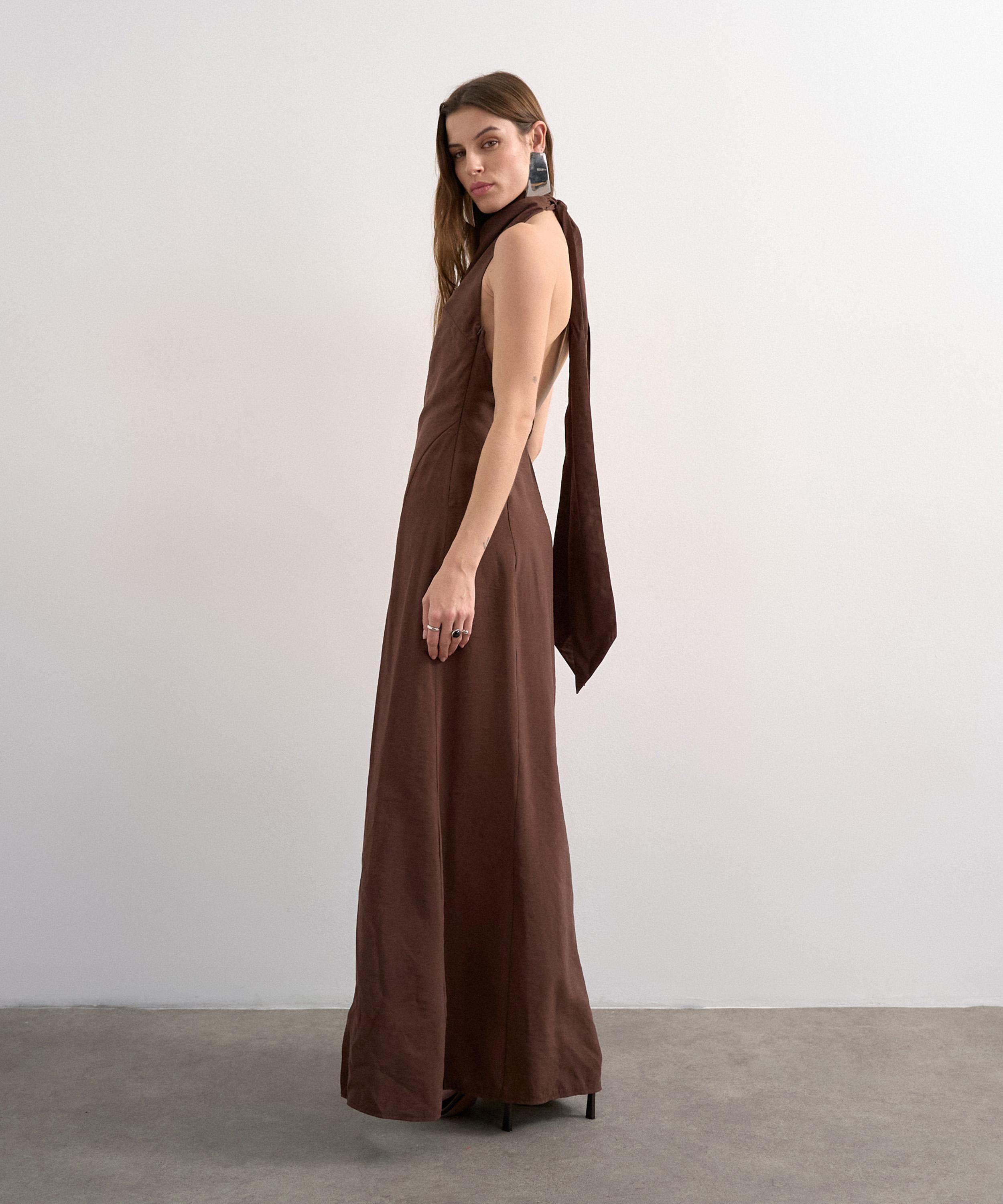 Crafted from chocolate-brown cupro, this striking maxi dress features a high halter cowl neckline and an open back. A fluid skirt with side splits enhances movement and lends an effortlessly elegant finish.