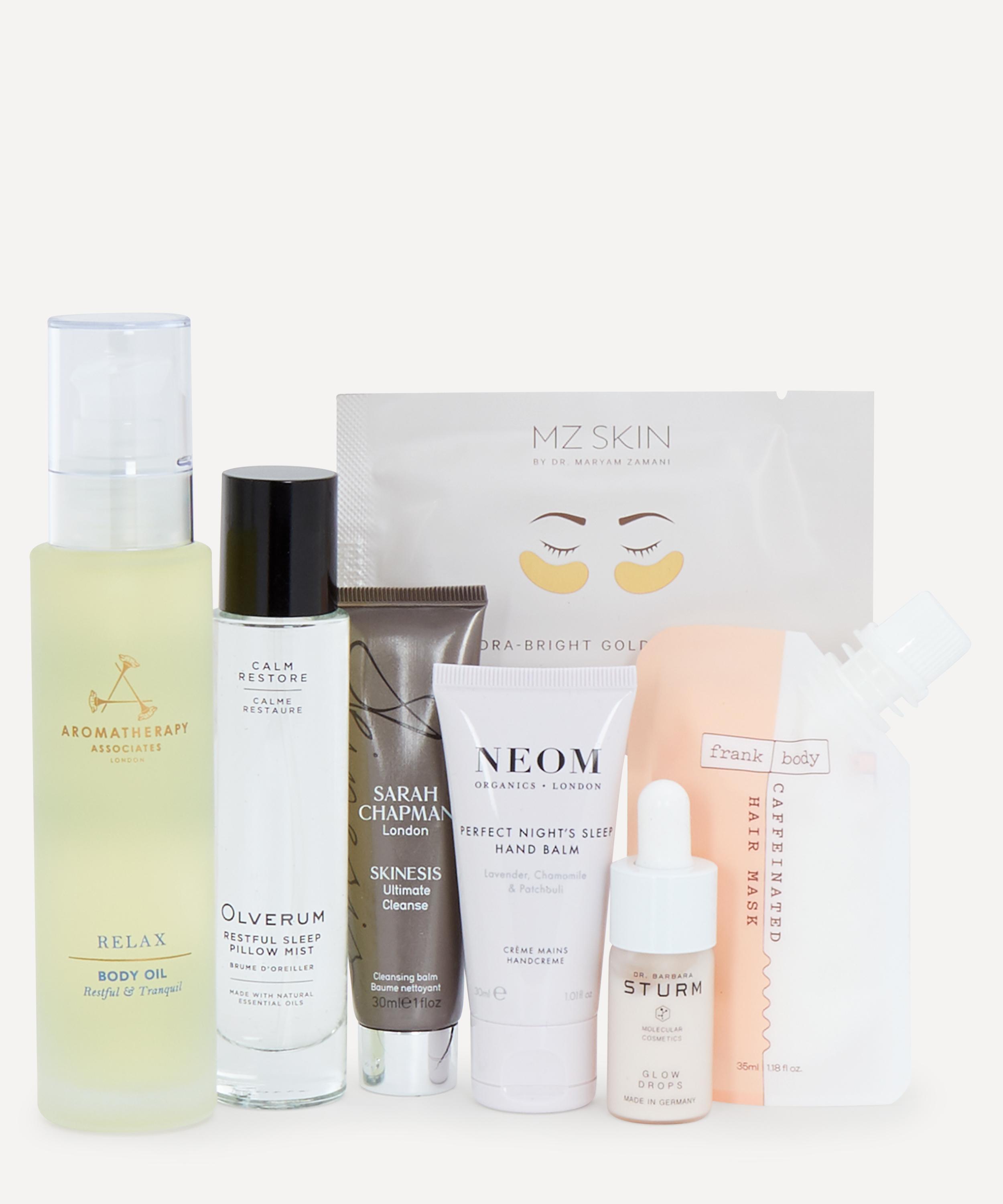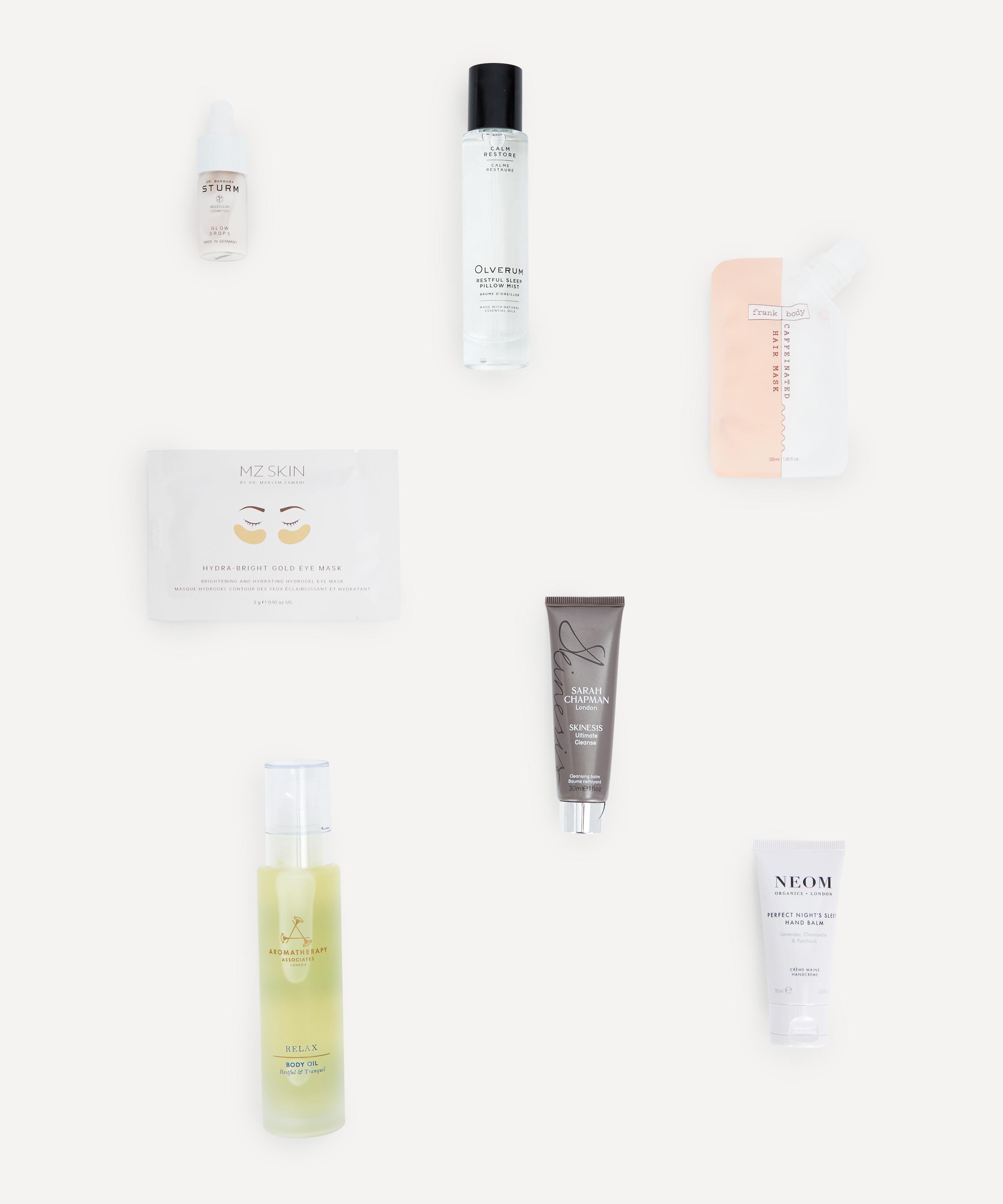 • Sleep kit contains 8 products: Aromatherapy Associates Relax Body Oil 100ml, Dr. Barbara Sturm Glow Drops 10ml, Olverum Restful Sleep Pillow Mist 50ml, Sarah Chapman Ultimate Cleanse 30ml, MZ Skin Hydra-Bright Golden Eye Treatment Mask 1 Sheet, NEOM Organics Perfect Night’s Sleep Hand Balm 30ml, Frank Body Caffeinated Hair Mask 35ml, Liberty. Washbag in Aubrey Forest C